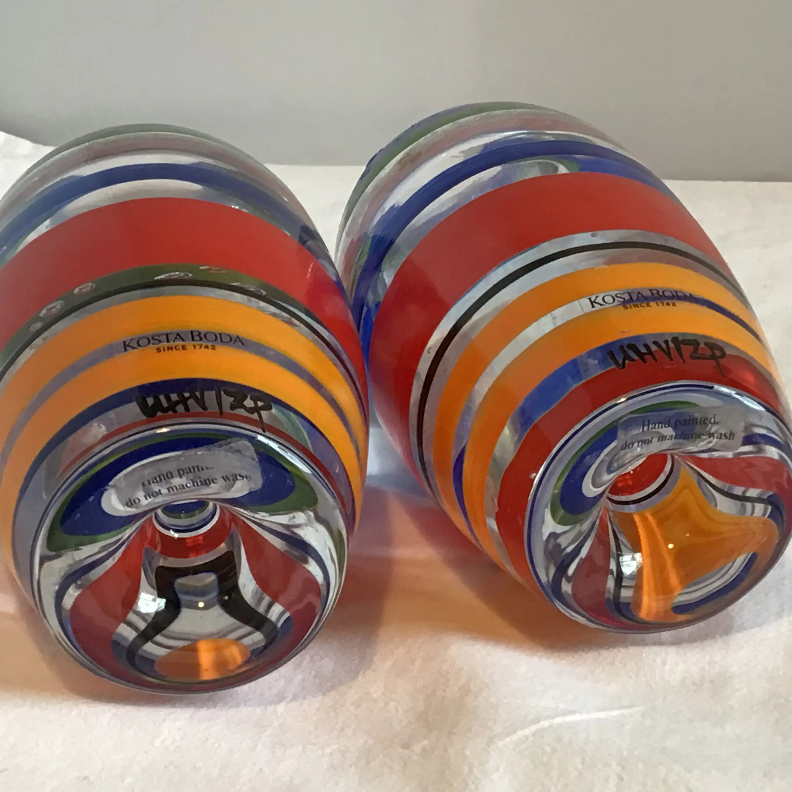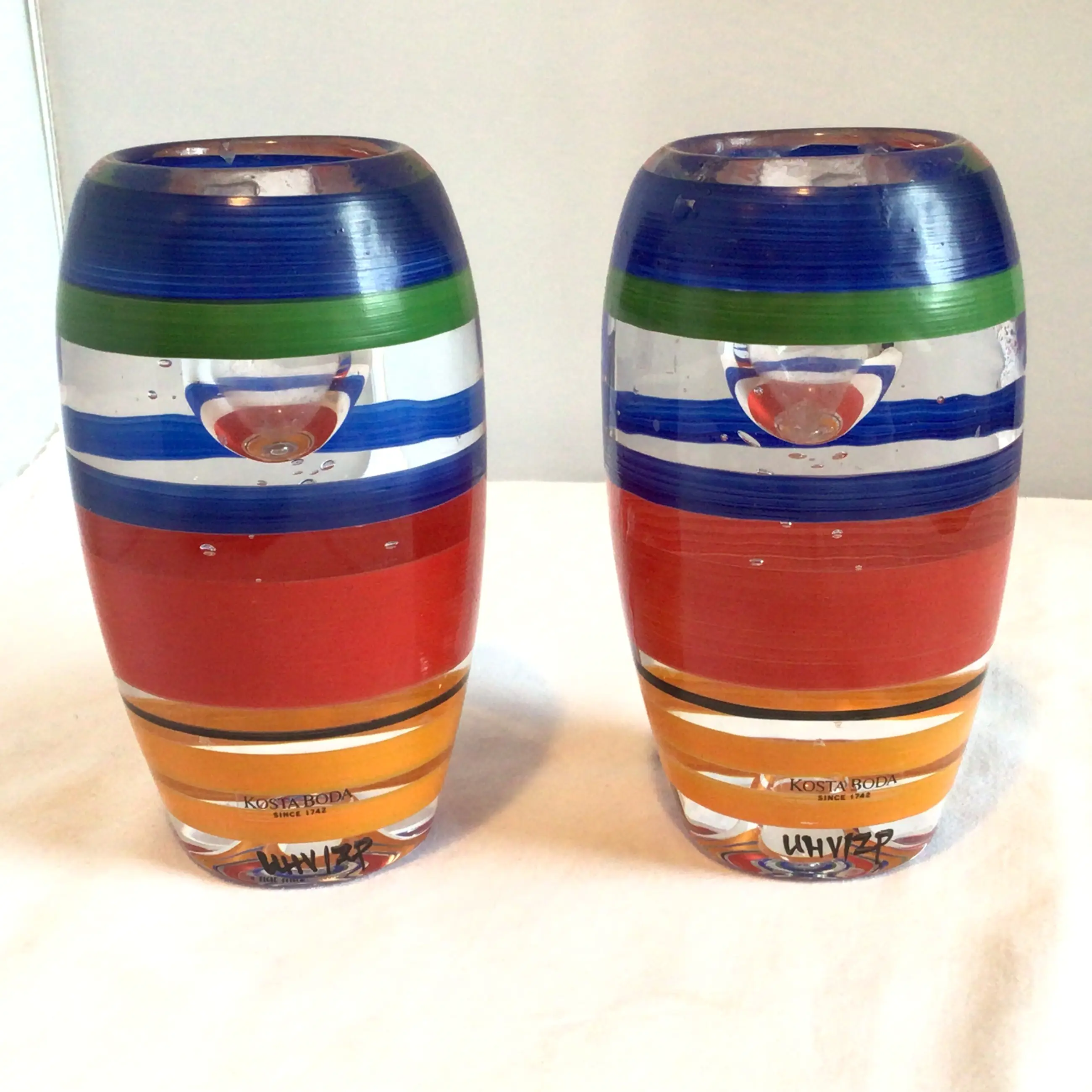 Vintage Kosta Boda, RIO kandelaars. Ontwerper Ulrica Hydman-Vallien. Handgeschilderd in vrolijke kleuren. Zware glazen objecten.