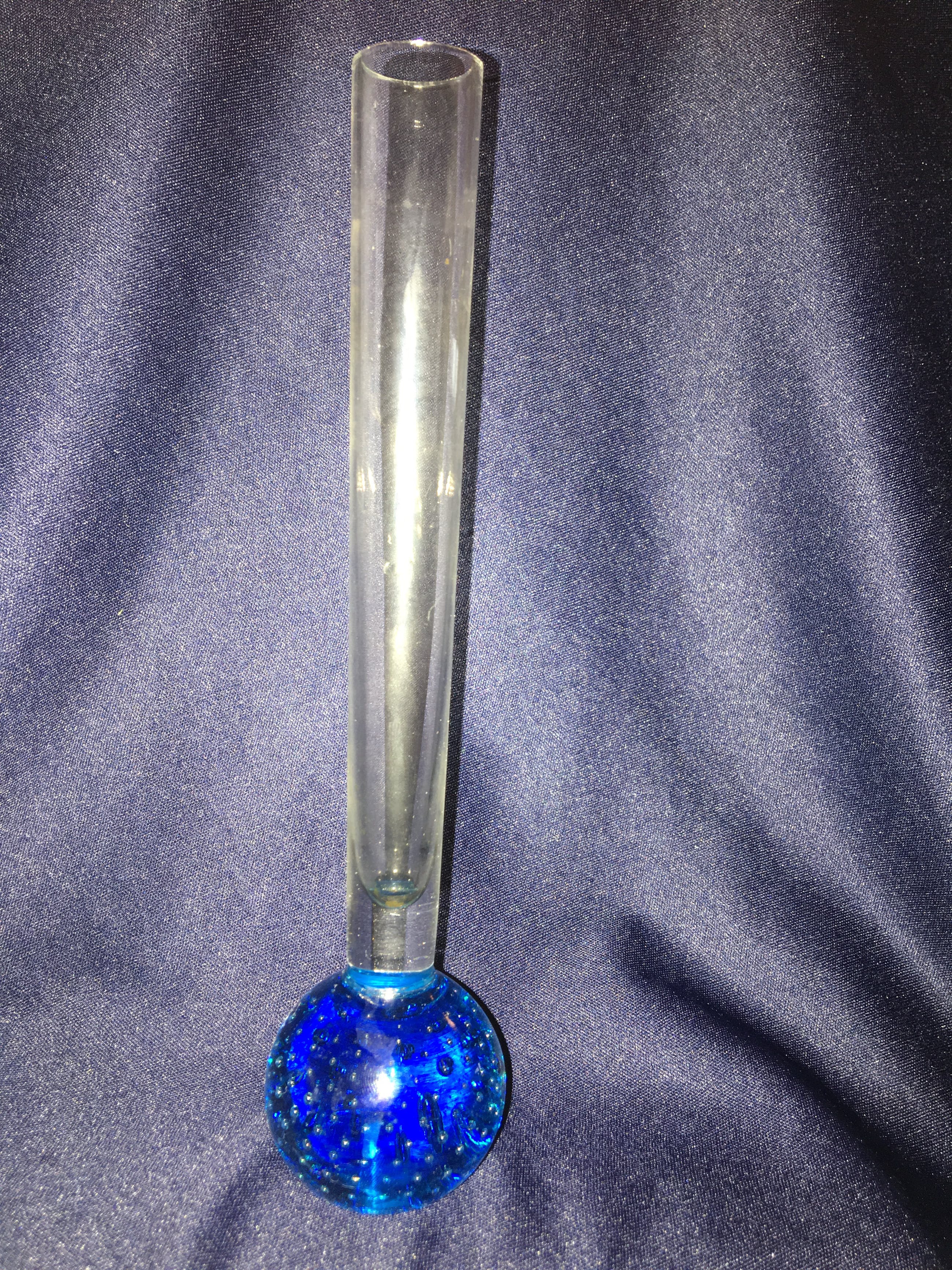 Mooi blauw elegant vaasje met blauwe spijkerbol als voet. Ongesigneerd maar duidelijk van KOSTA BODA. Zie solifleurs van dit model en kleur op internet. Kleurverschil op de foto’s komt door gebruik van de flits.