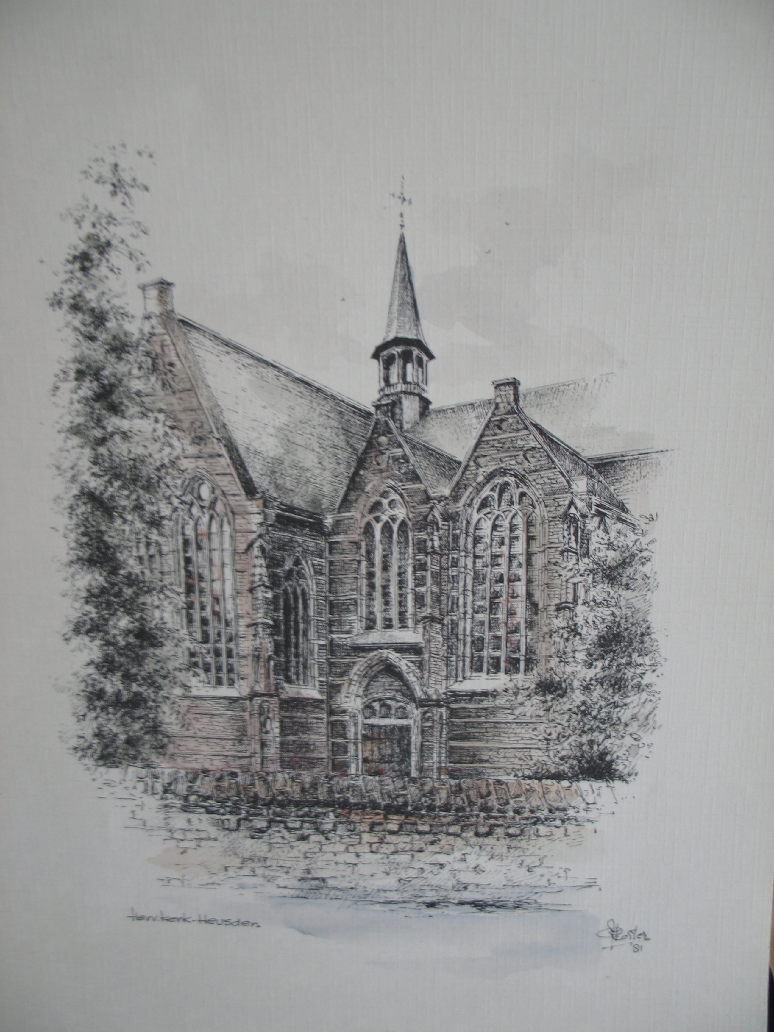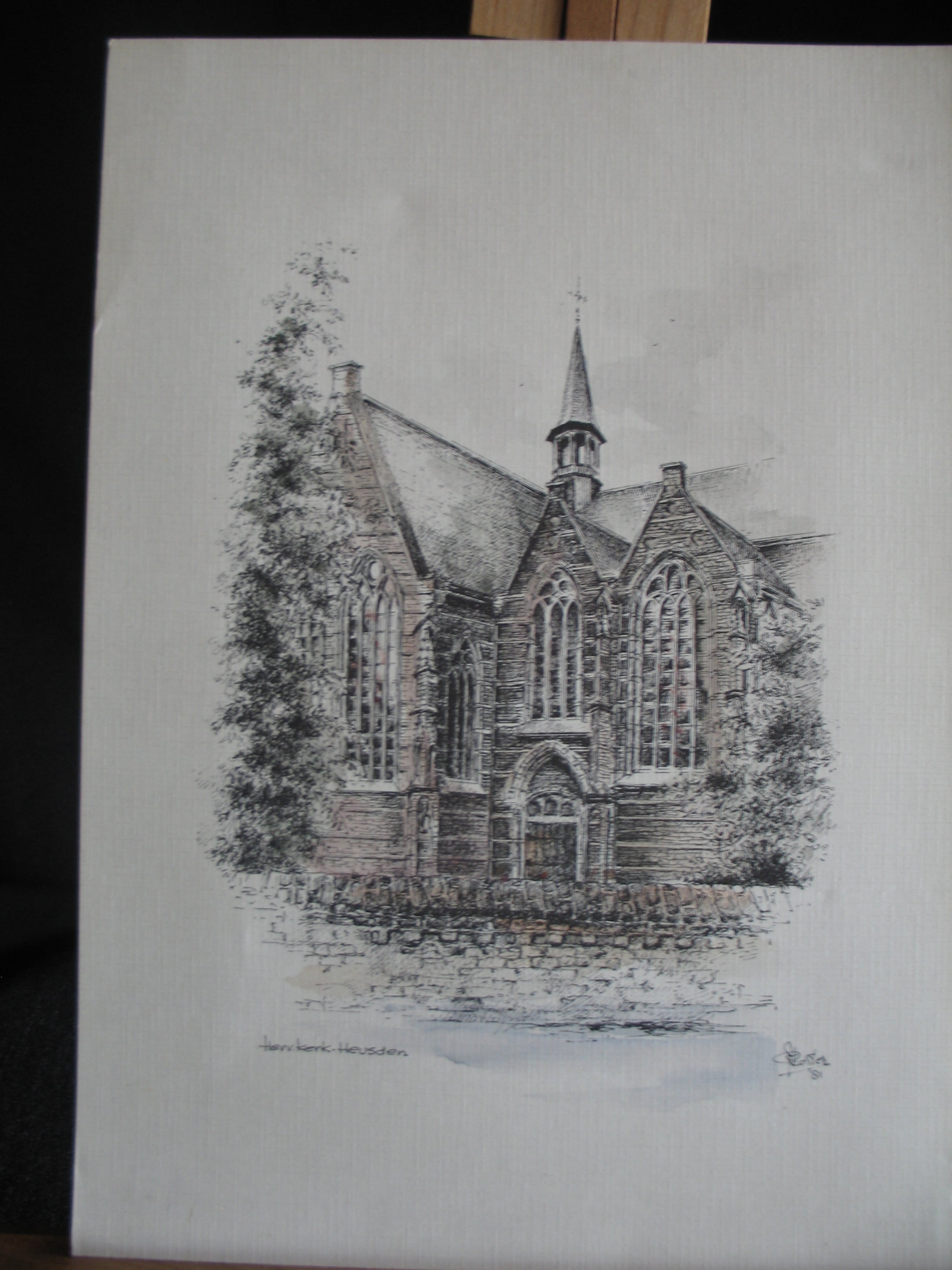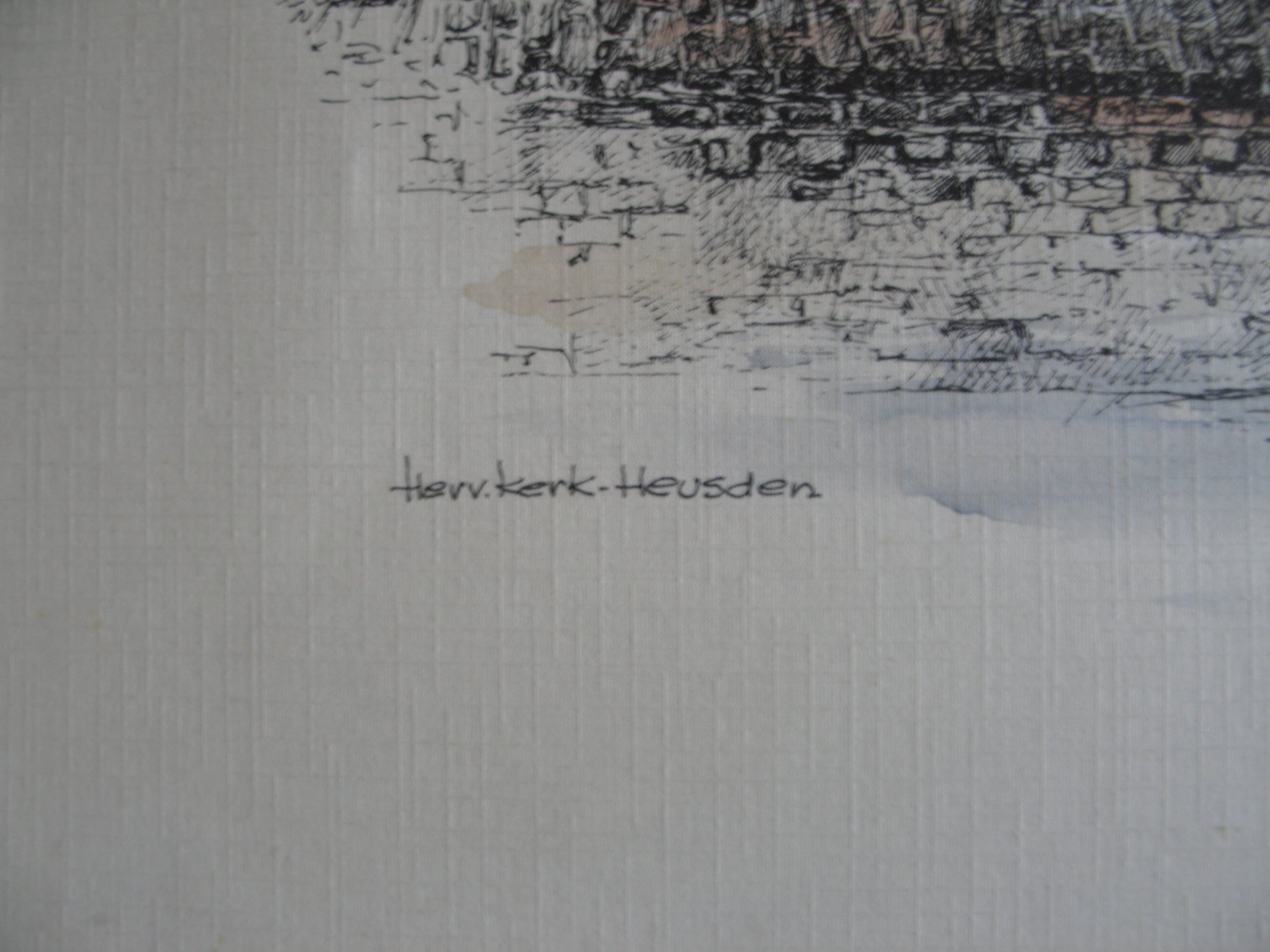 Deze tekening is in perfecte staat en heel mooi om in te lijsten. De kunstenaar heeft in al zijn tekeningen veel kleine details aangegeven die zijn werken heel minutieus maken. Hier gaat het om de architectuur van de Hervormde kerk van Heusden die heel mooi in al zijn detail afgewerkt is, daarna met een vleugje kleur (aquarel?) levendig gemaakt.