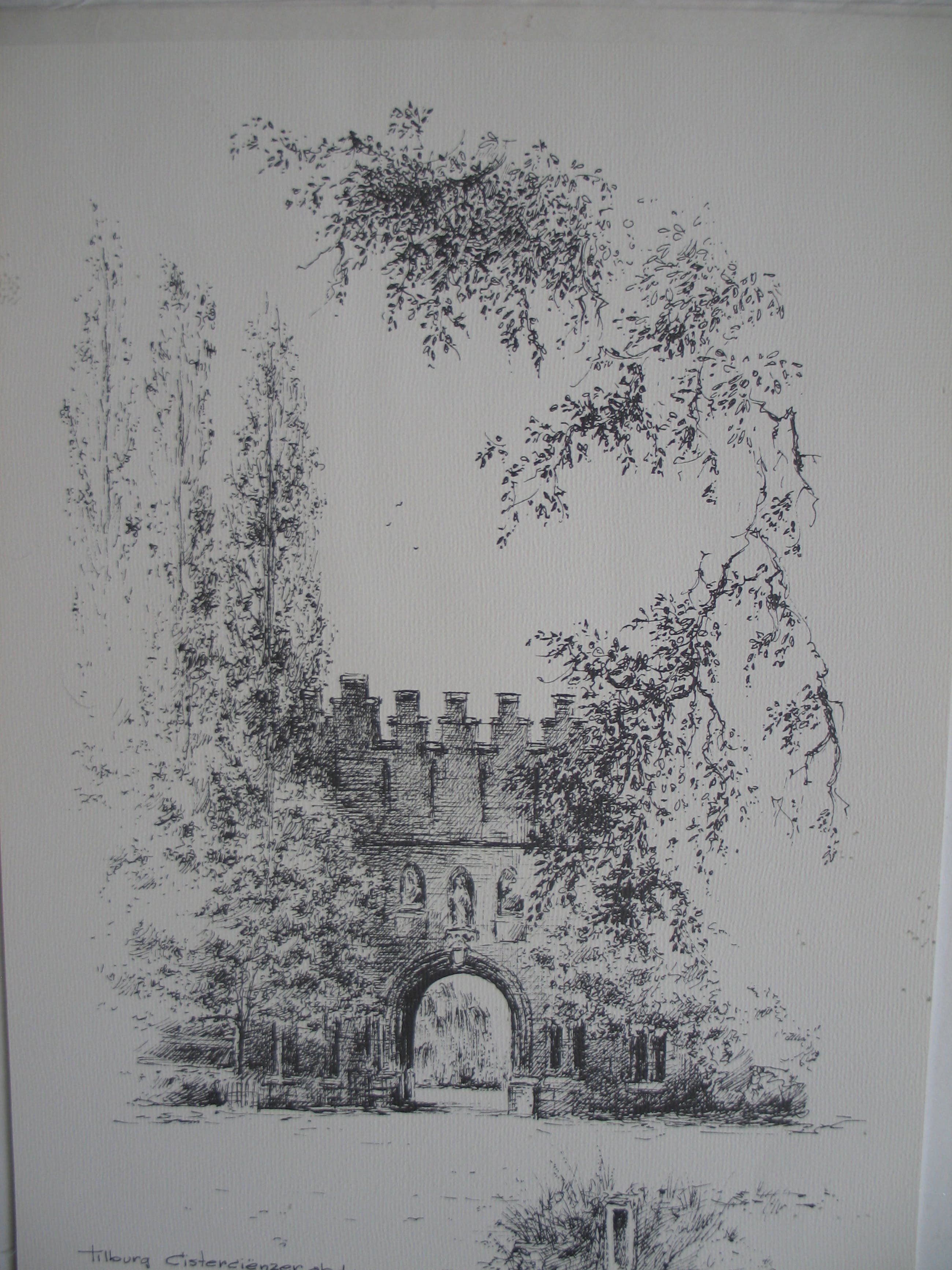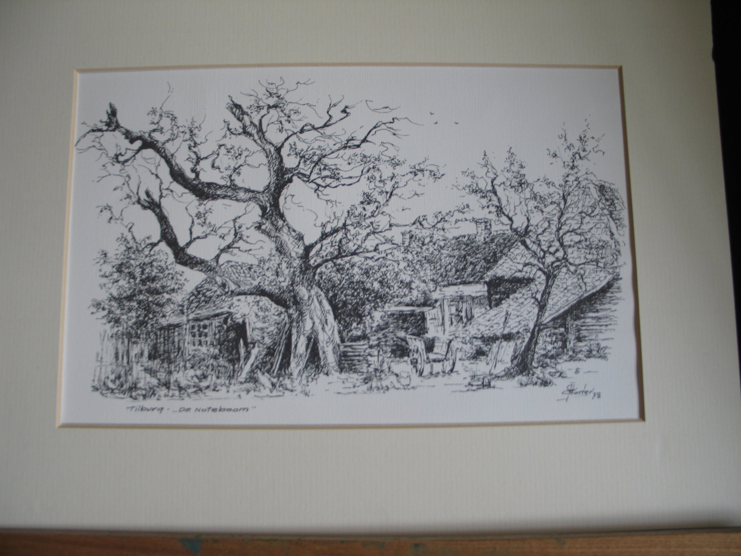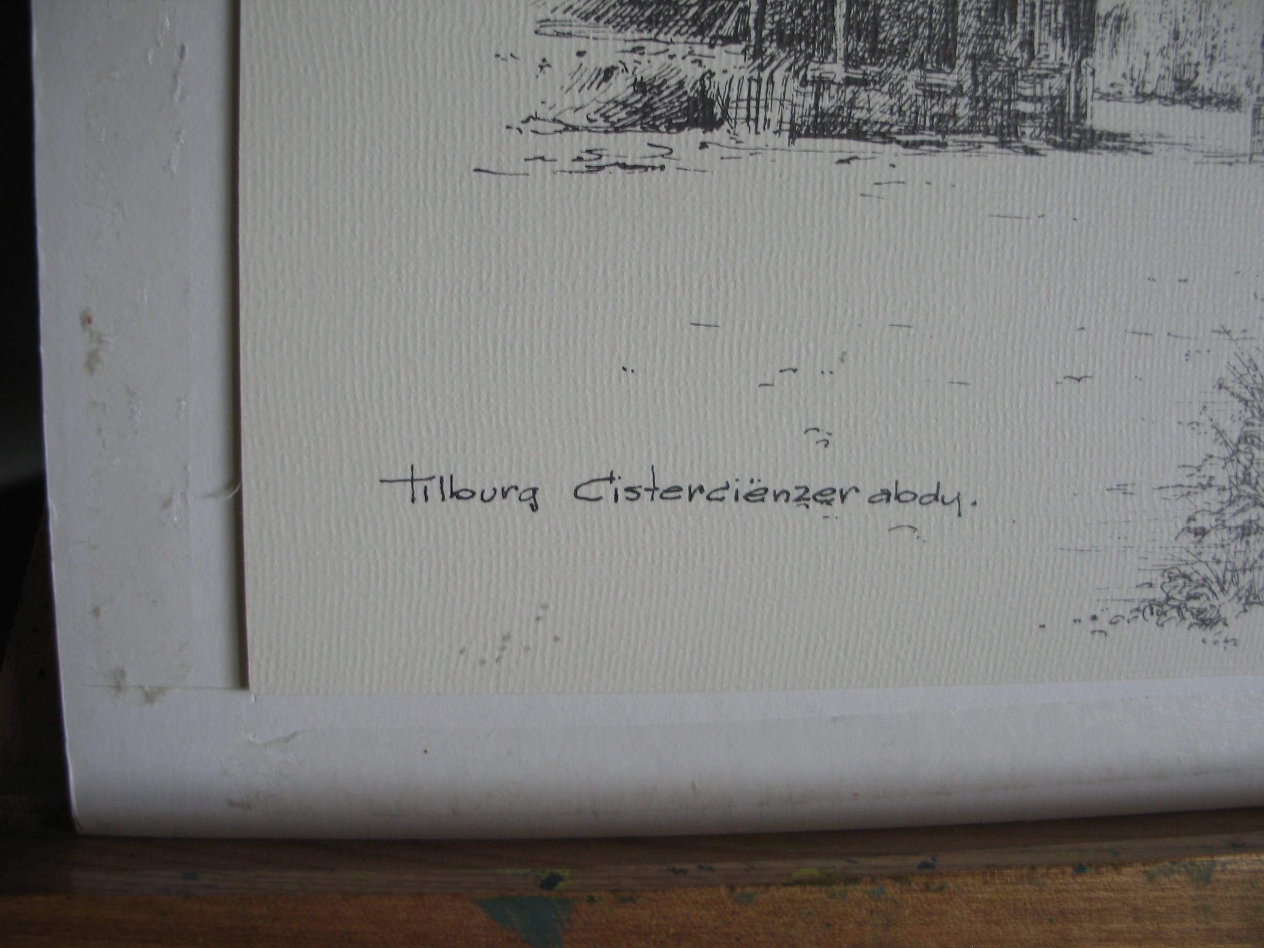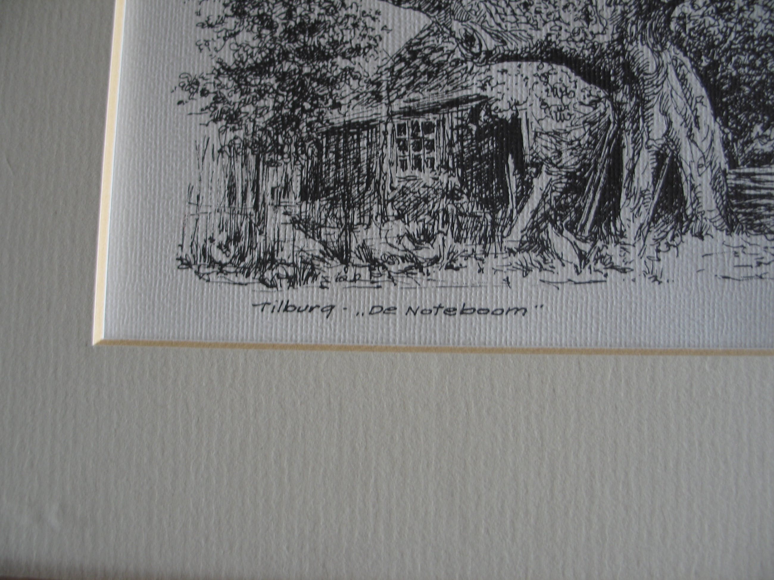 Deze tekeningen zijn in perfecte staat en heel mooi om in te lijsten. Er zijn er twee tekeningen: "De Noteboom" ( deze tekening is in passe-partout) en aan de achterkant, geplakt is de "Cisterciënzer Abdij". Beide inkttekeningen zijn in Tilburg gemaakt.