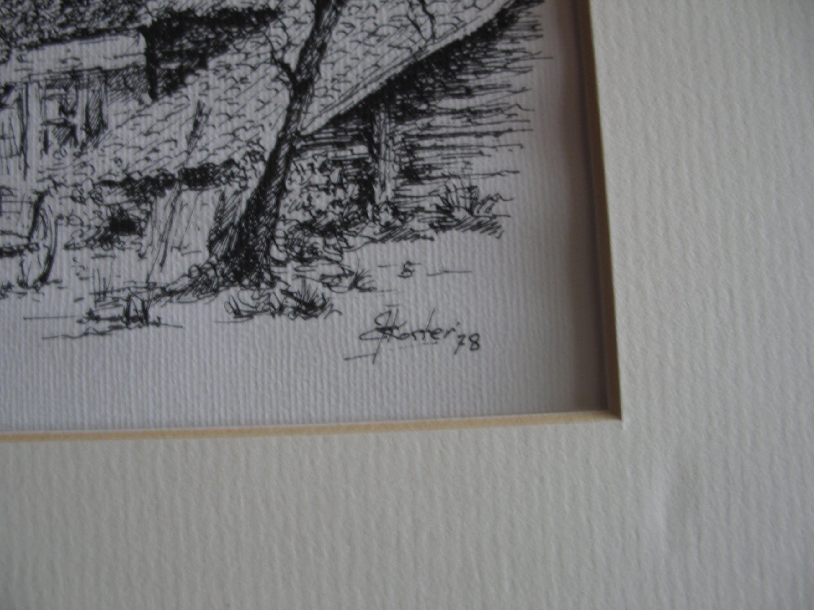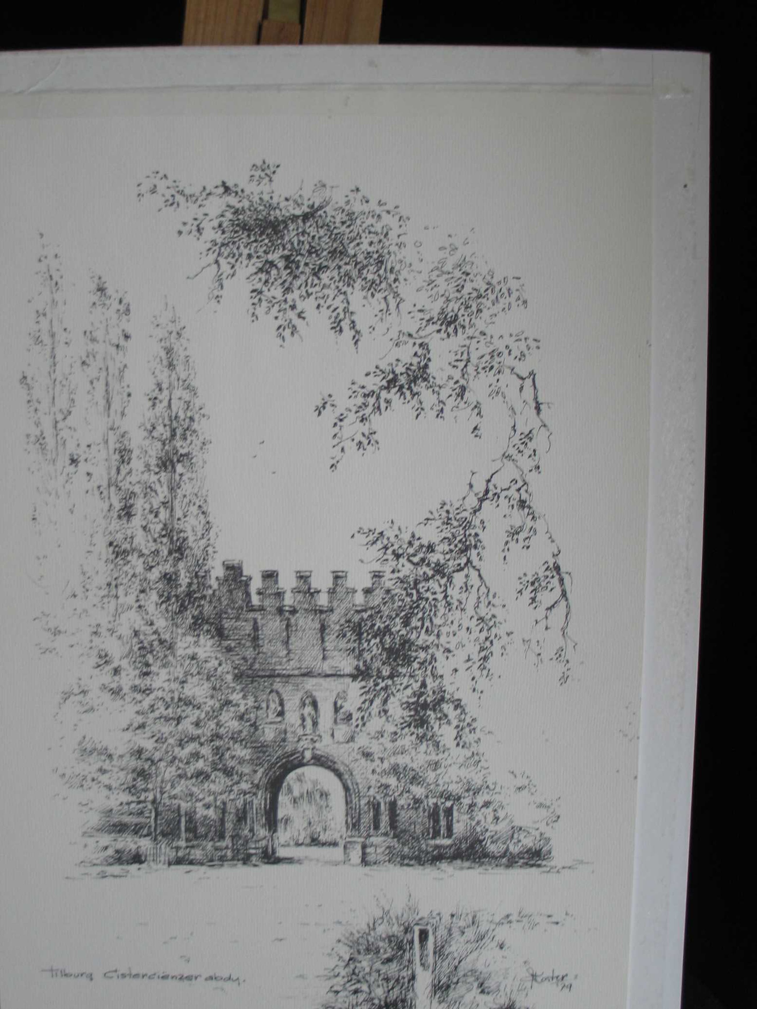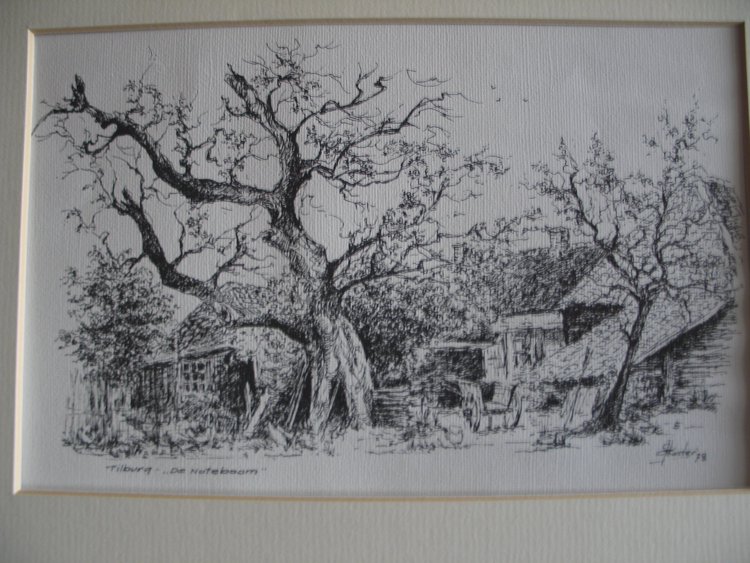 Deze tekeningen zijn in perfecte staat en heel mooi om in te lijsten. Er zijn er twee tekeningen: "De Noteboom" ( deze tekening is in passe-partout) en aan de achterkant, geplakt is de "Cisterciënzer Abdij". Beide inkttekeningen zijn in Tilburg gemaakt.