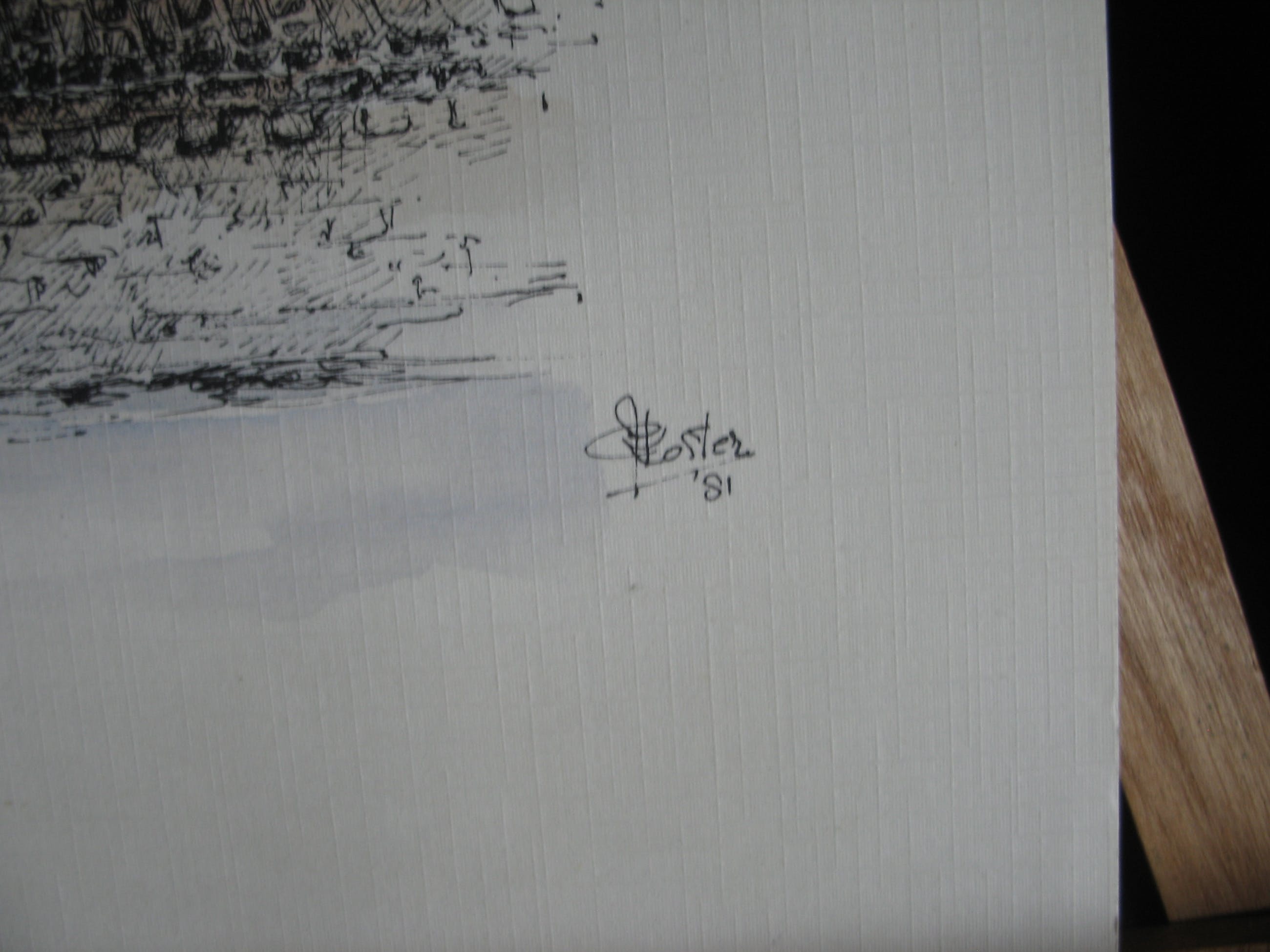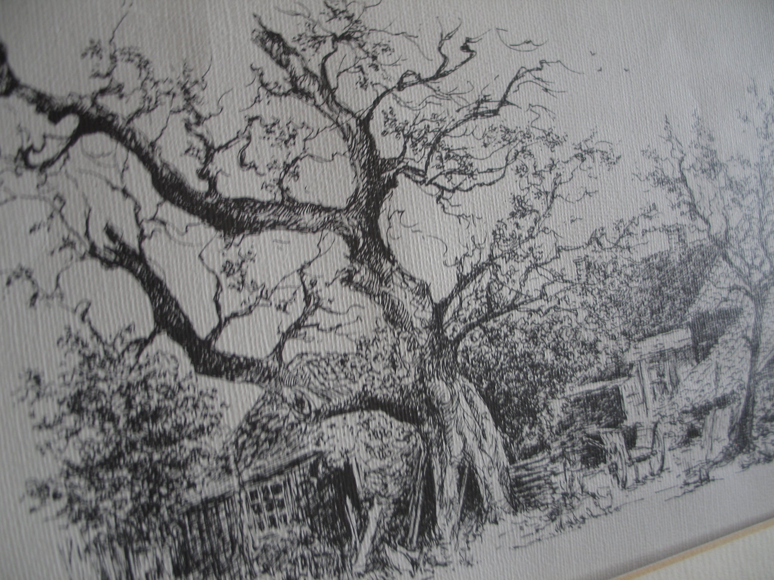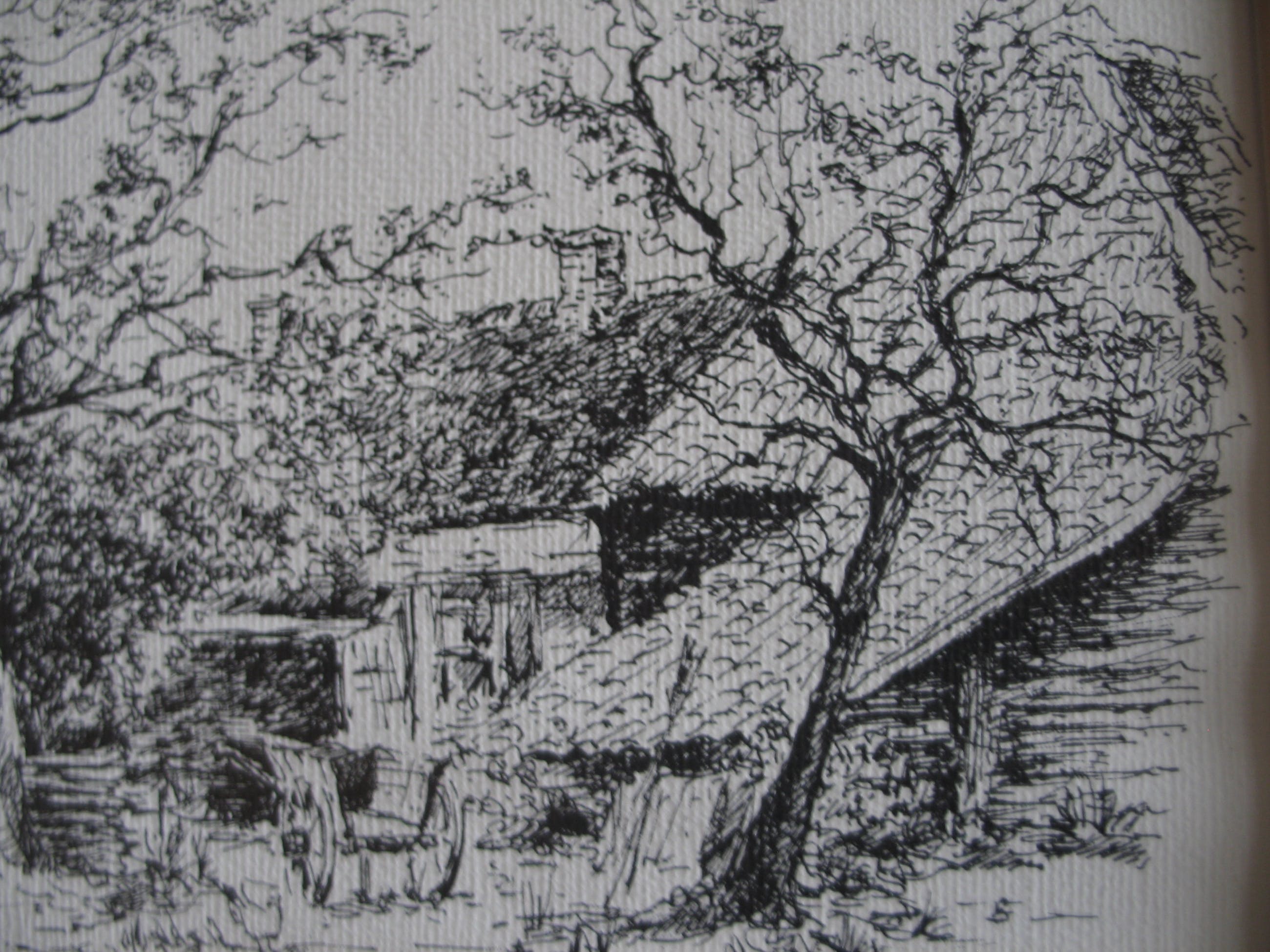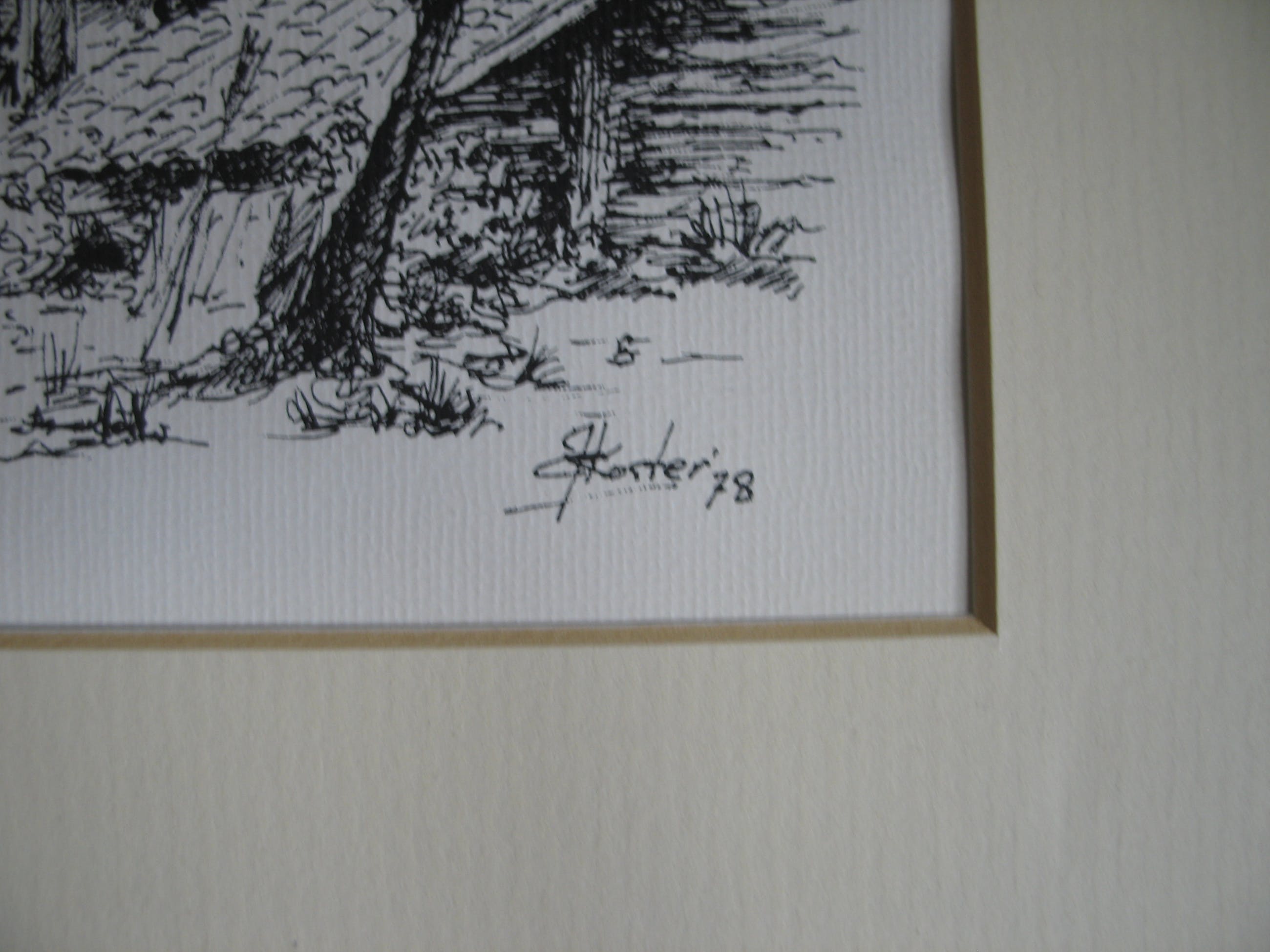 Deze tekeningen zijn in perfecte staat en heel mooi om in te lijsten. Er zijn er twee tekeningen: "De Noteboom" ( deze tekening is in passe-partout) en aan de achterkant, geplakt is de "Cisterciënzer Abdij". Beide inkttekeningen zijn in Tilburg gemaakt.