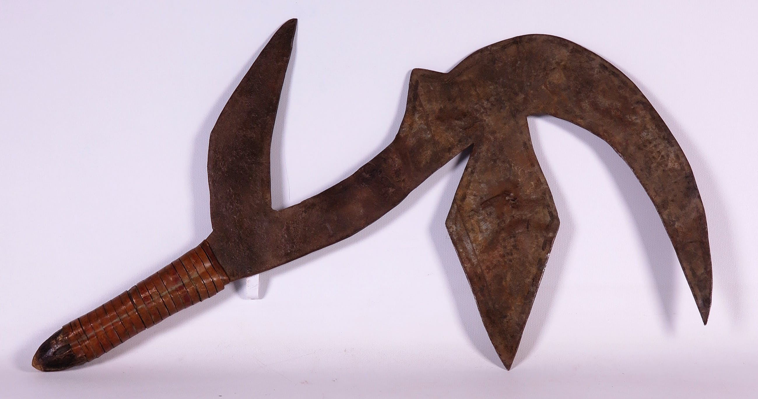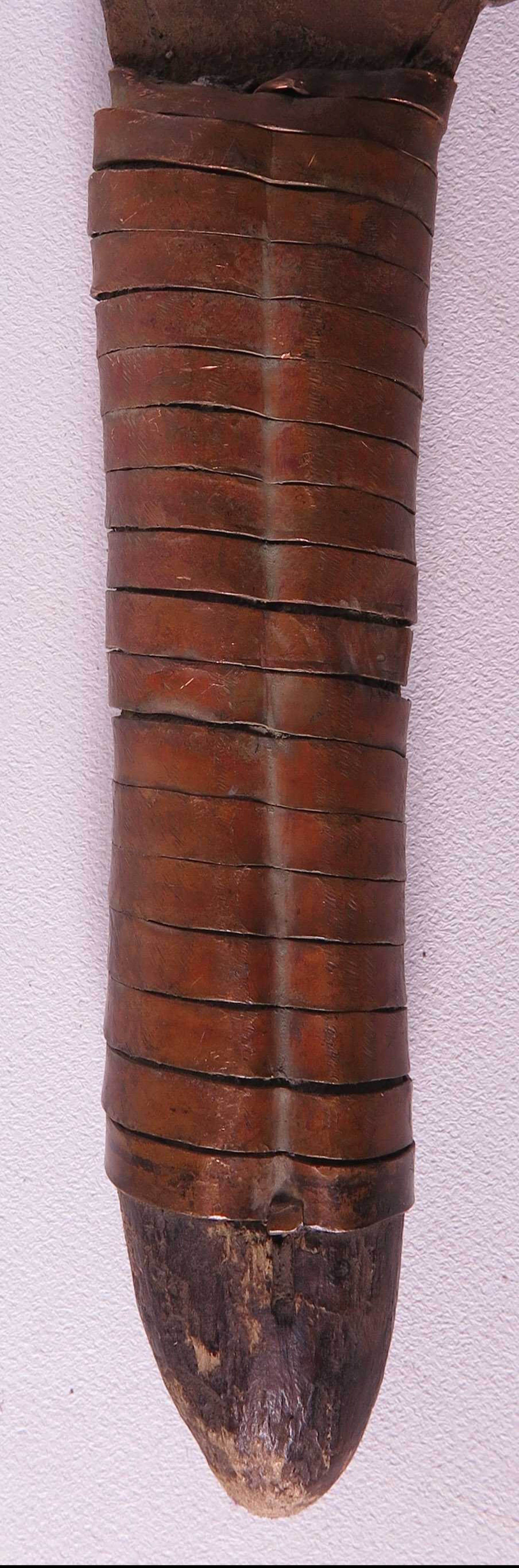 Werpmes van ijzer, met een koperen/messing handgreep. Dergelijke werpmessen fungeerden tevens als betaalmiddel. Afkomstig van de Kota-stam uit Gabon.