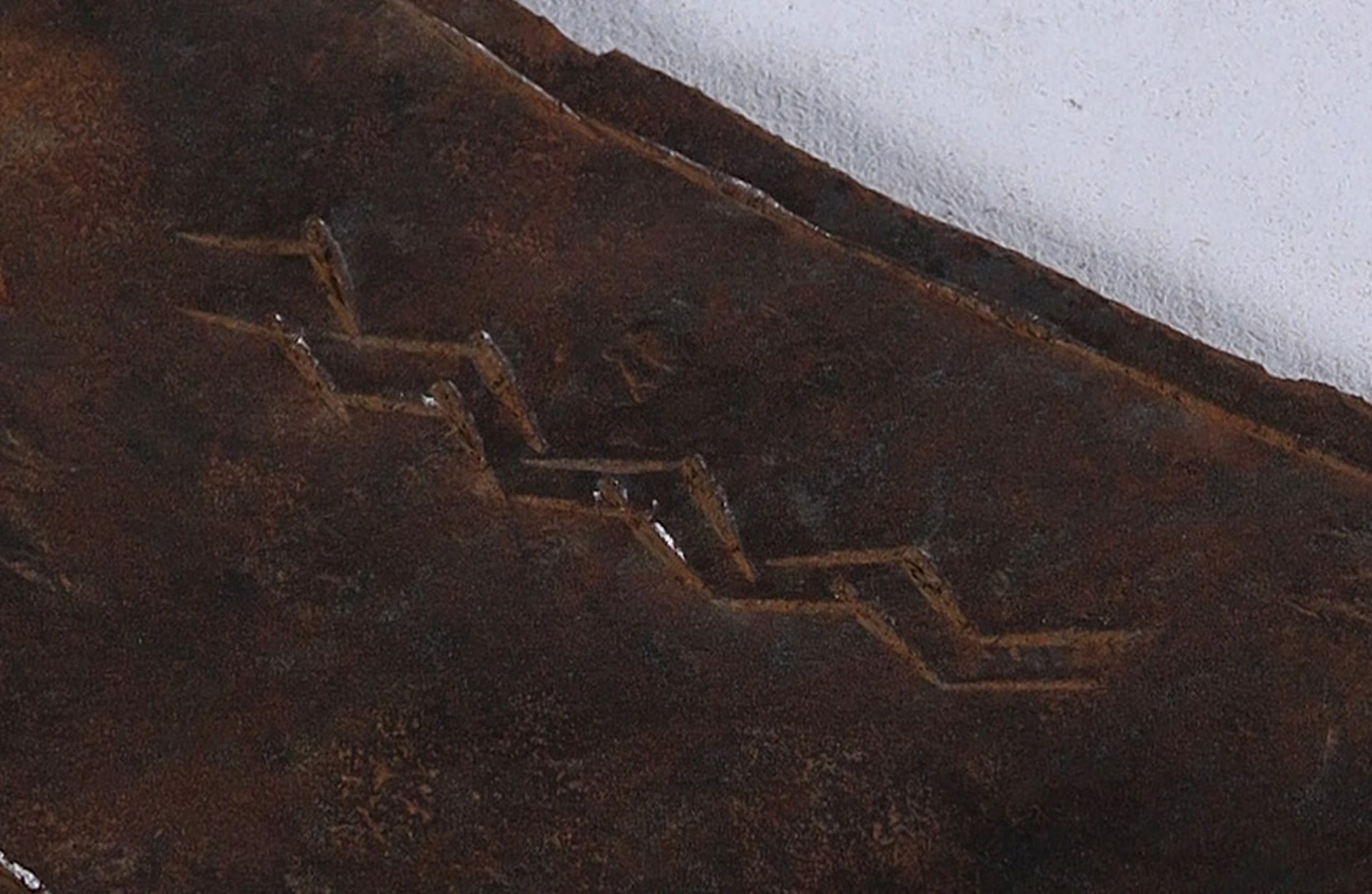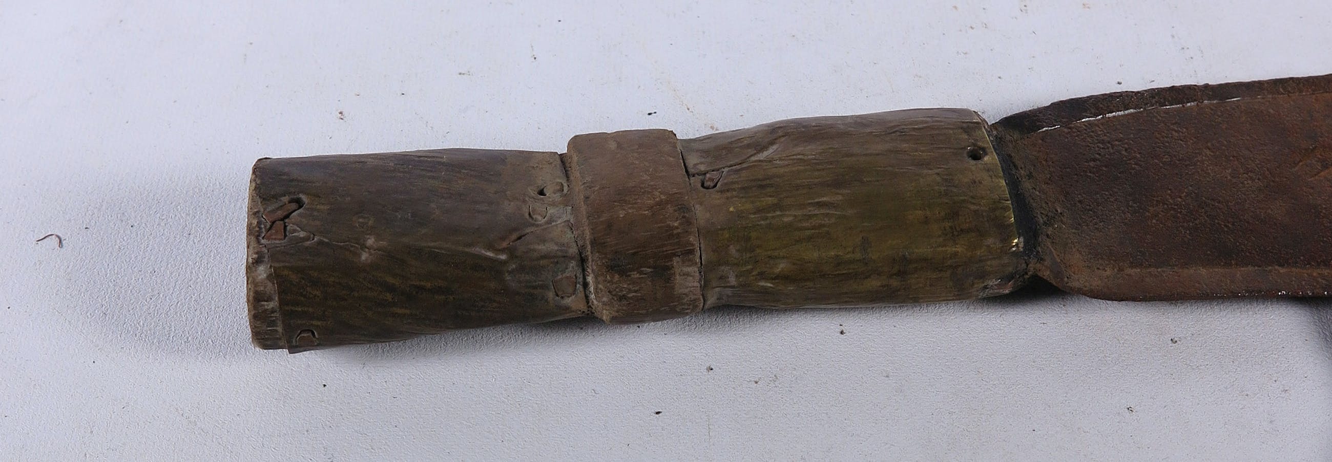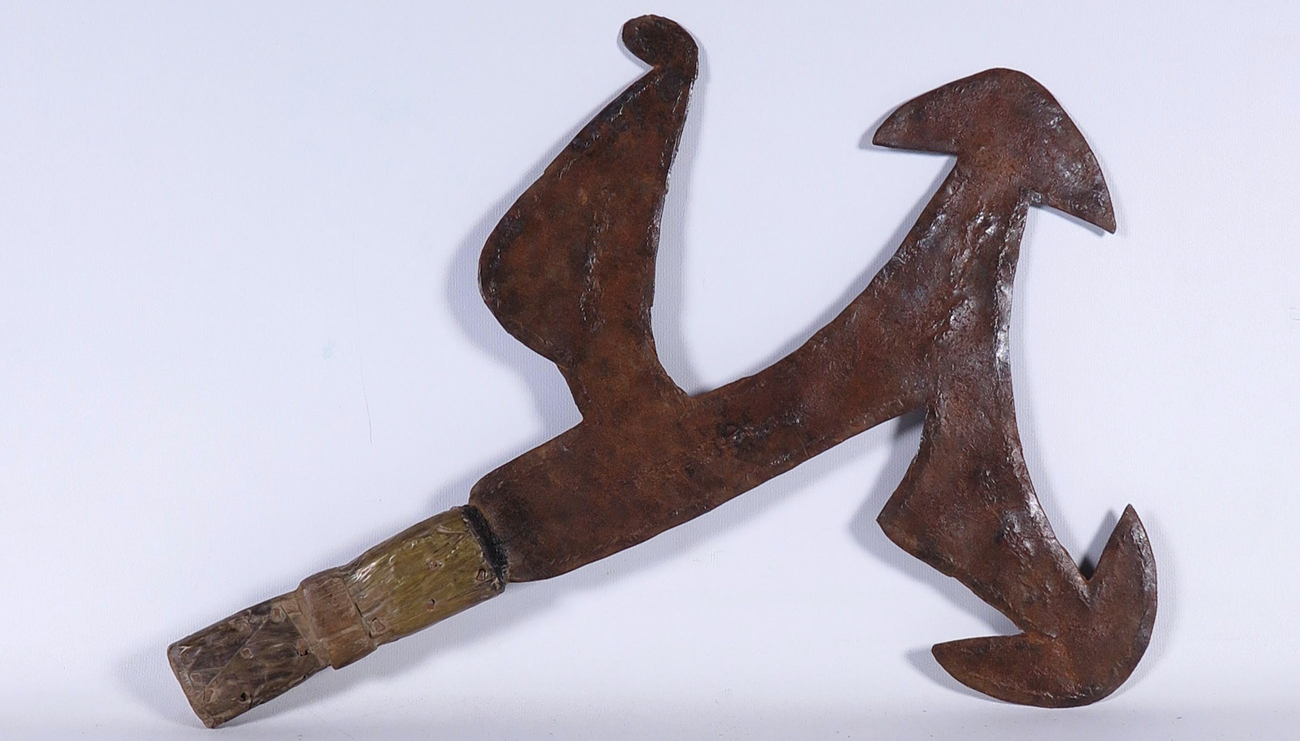 Werpmes van ijzer, met een koperen/messing handgreep. Dergelijke werpmessen fungeerden tevens als betaalmiddel. Afkomstig van de Kota-stam uit Gabon.