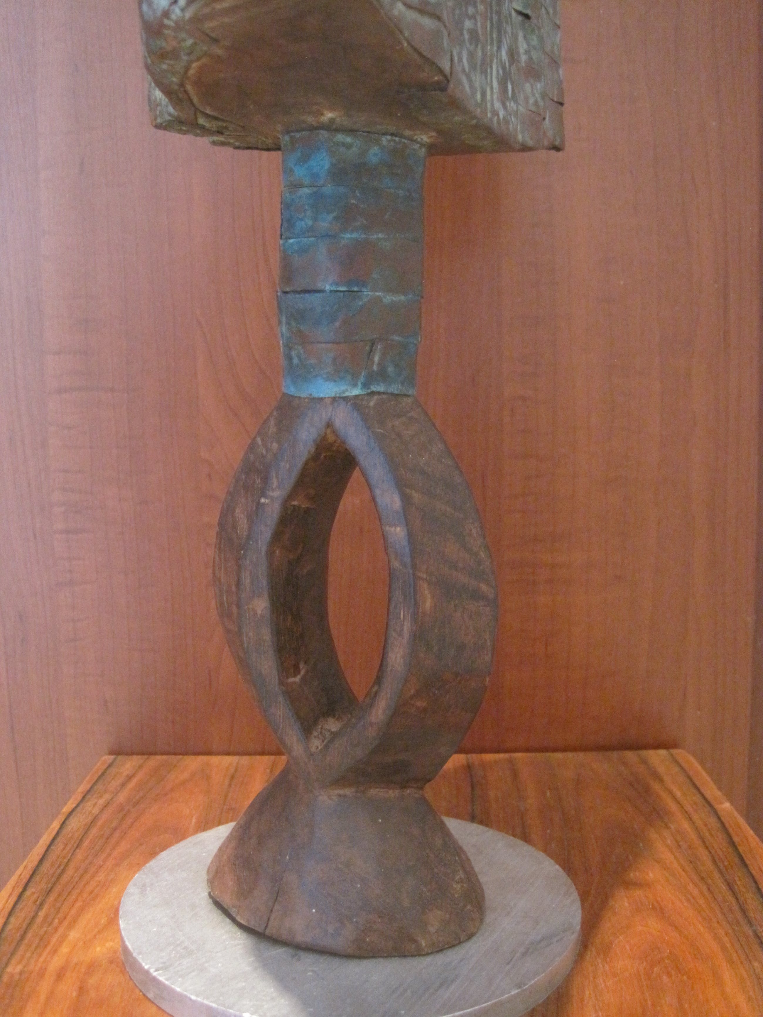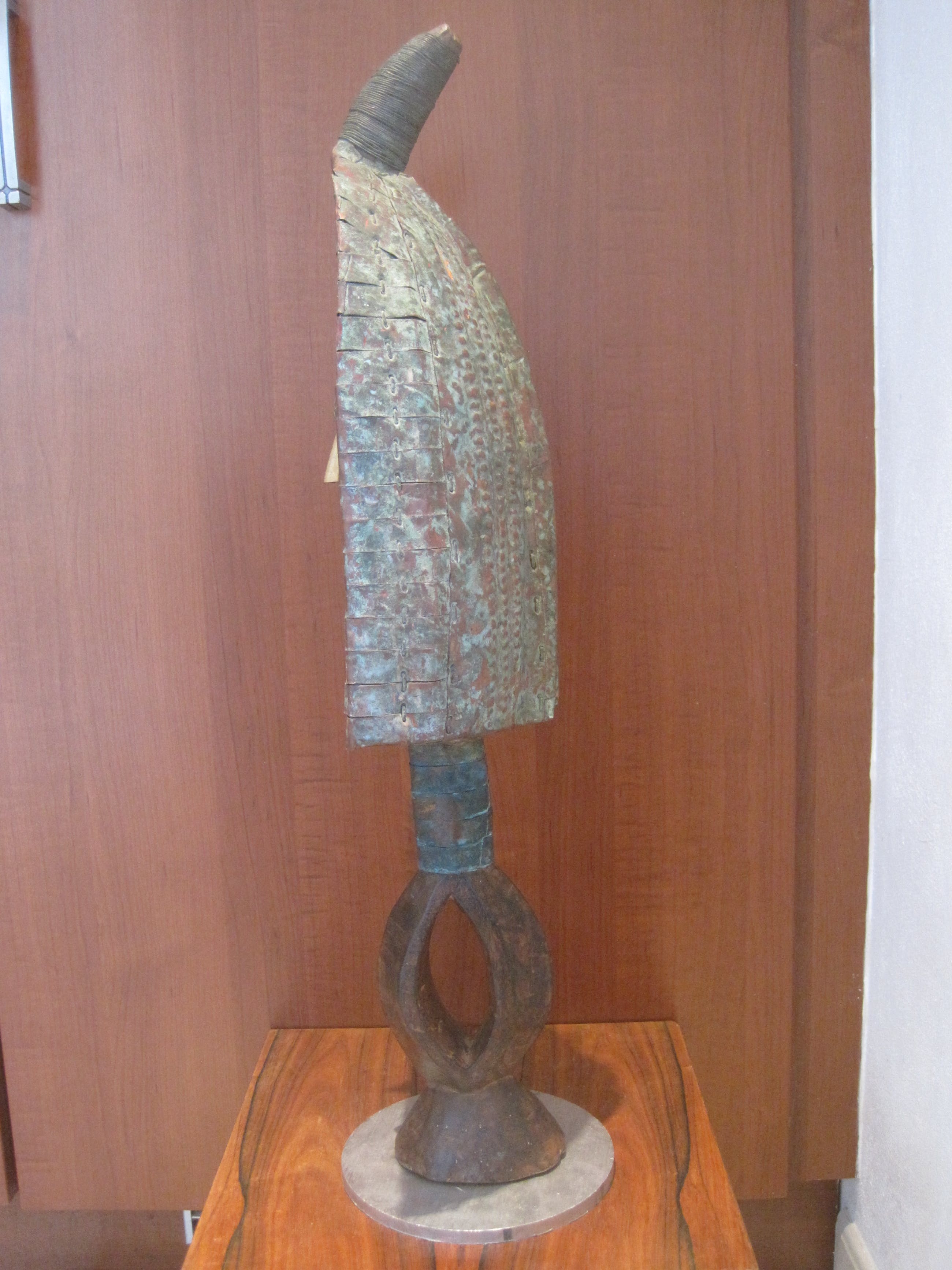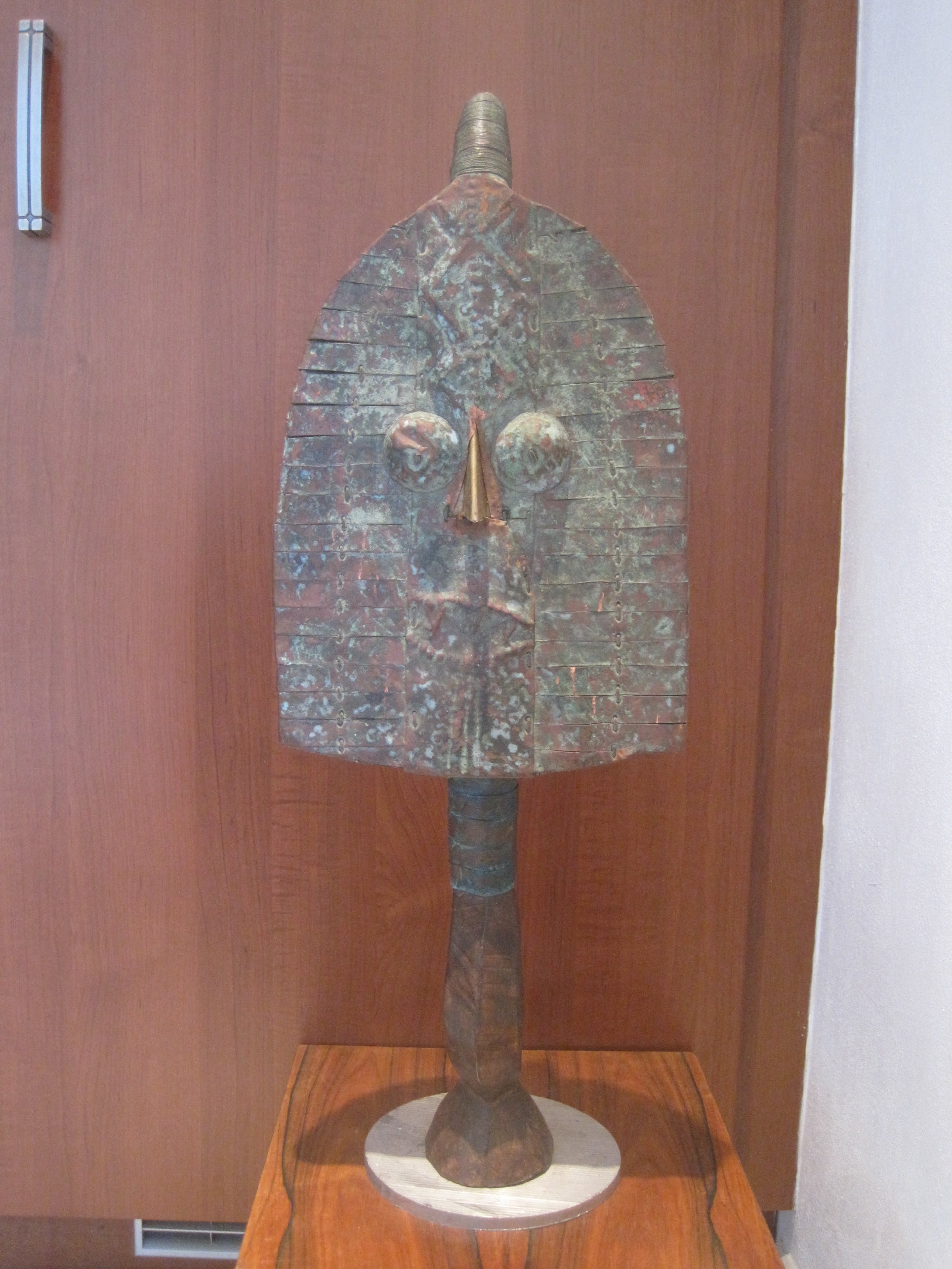 Dit beeld is gemaakt in Afrika, door het Kota/Bakota volk uit gabon. Dit soort beelden staat vaak in een pot of mand gevuld met de overblijfselen van voorouders en andere magische voorwerpen. Dit beeld is gemonteerd op een dikke aluminium plaat.