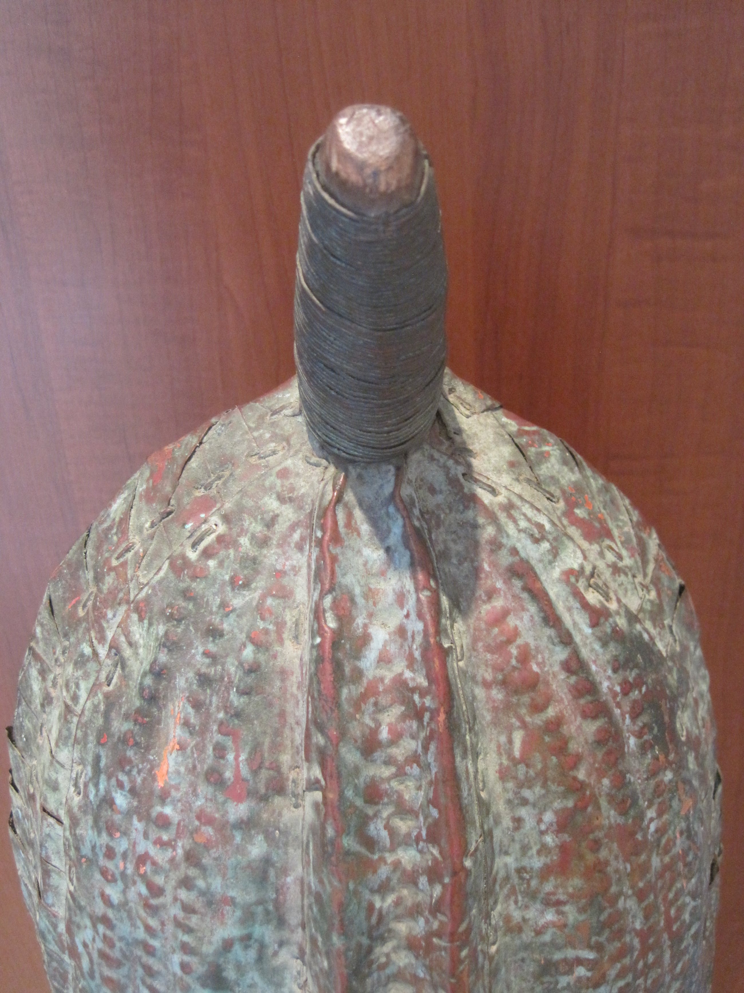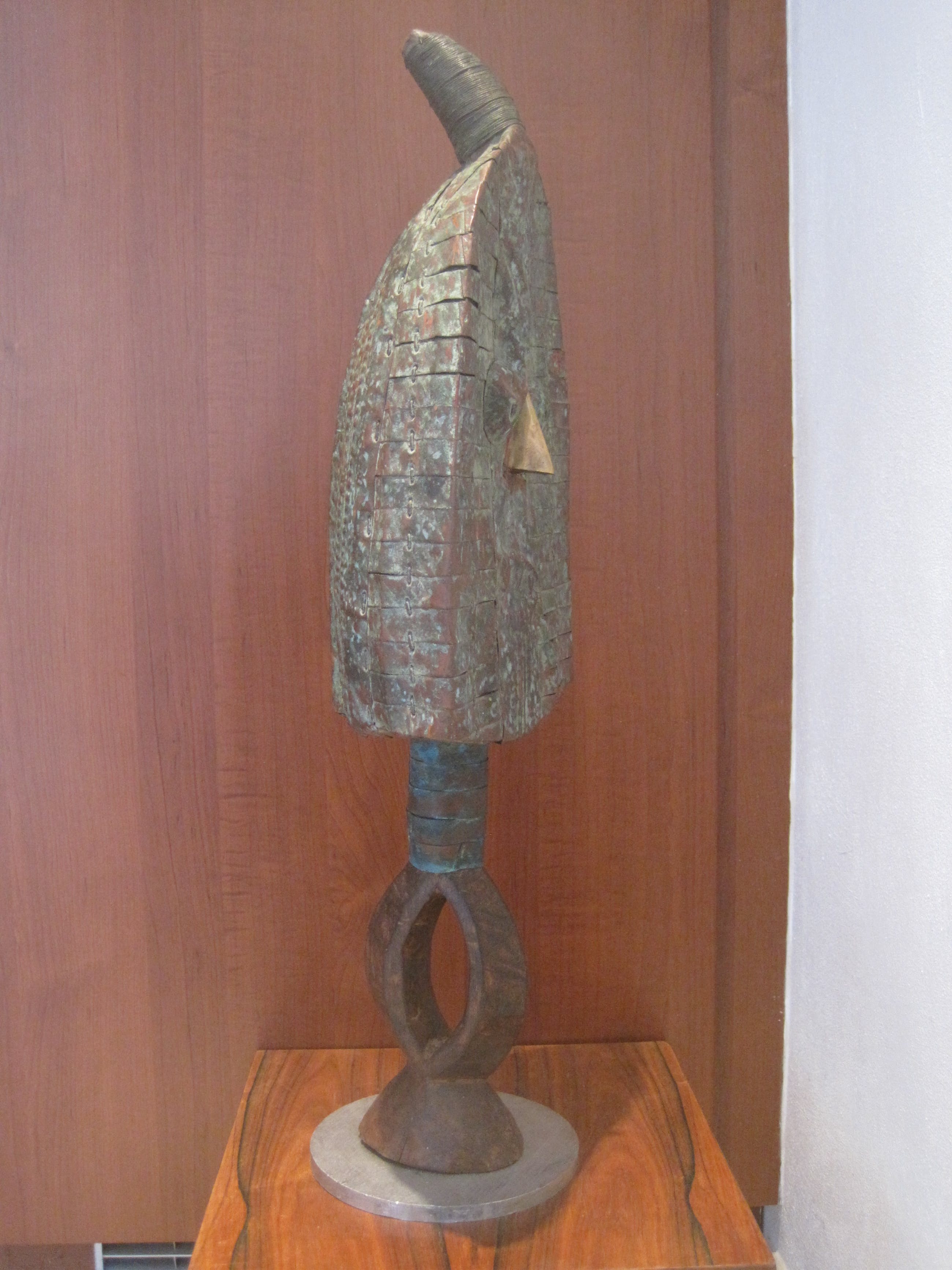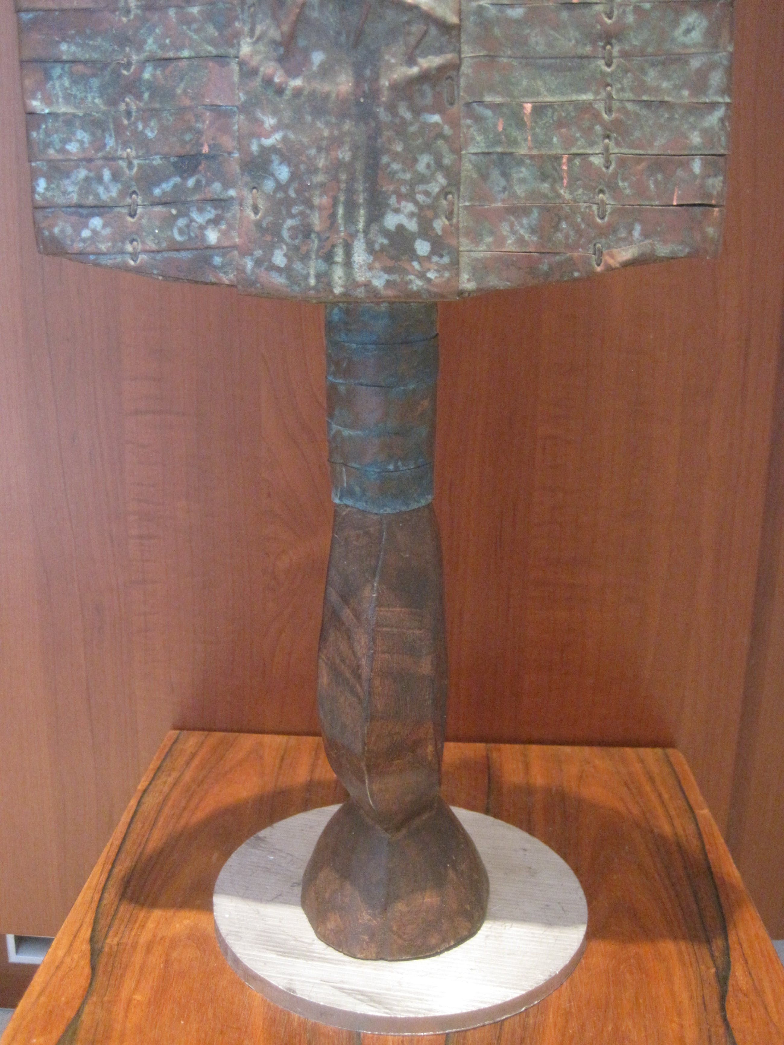 Deze zeer abstracte vorm bestaat uit een houten figuratieve sculptuur die bijna volledig is omhuld met metaalwerk van koper. In het midden zijn uitstekende ogen gedefinieerd door koperen doppen en een driehoekige koperen neus. De contouren van de figuur roepen in voor- en achteraanzicht de schematische vorm van een blad met steel op.