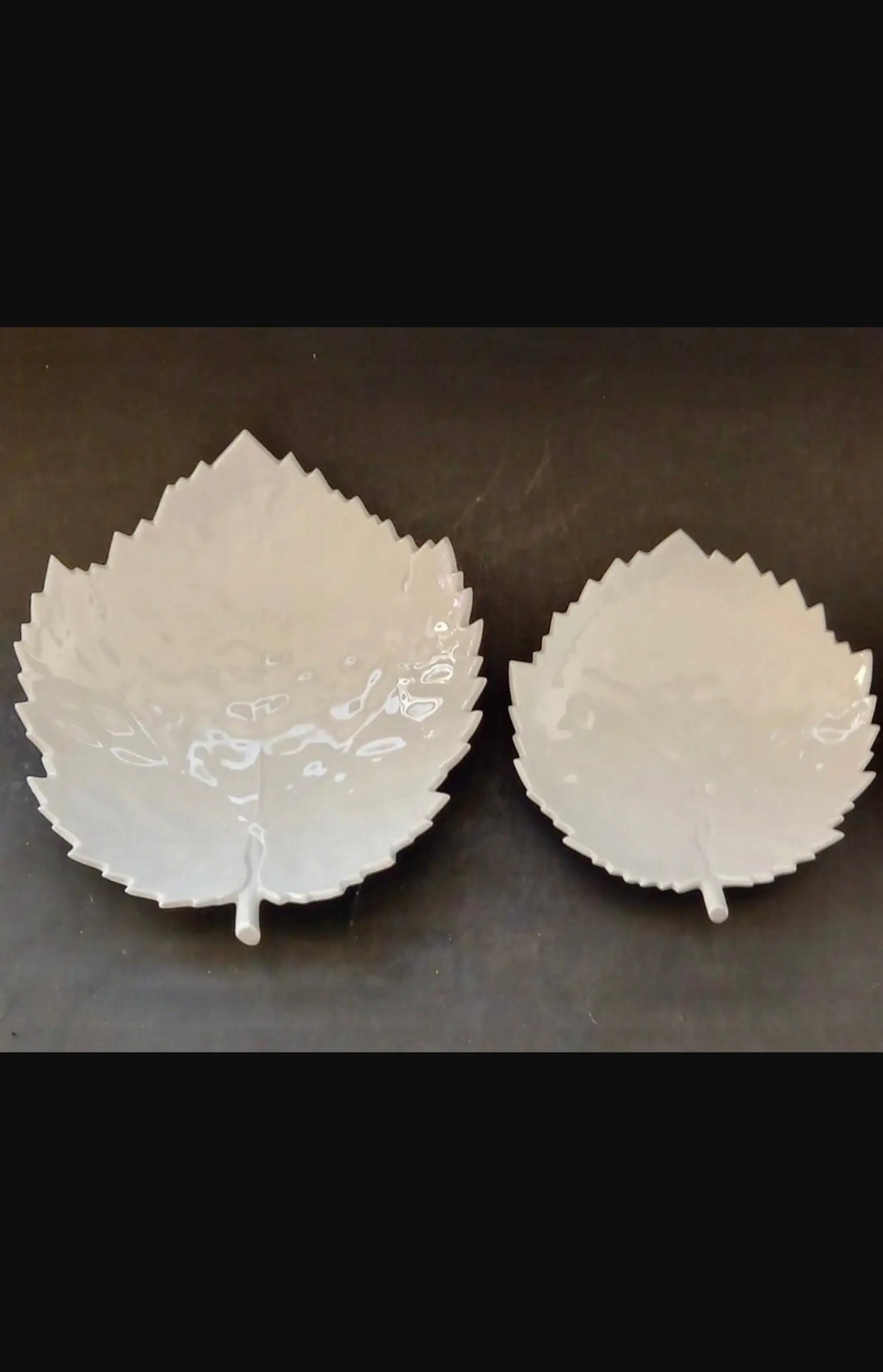 Twee schaaltjes van porselein in bladvorm van KPM (Königliche Porzellan Manufaktur) Berlin. Een schaaltje van circa 16 cm en een van circa 12 cm. Zeer decoratief en in zeer goede staat zonder beschadigingen. Zowel te gebruiken als amuse of hapjes schaaltjes of als schaaltje voor bijvoorbeeld ringen, ketting etc. naast het bed.