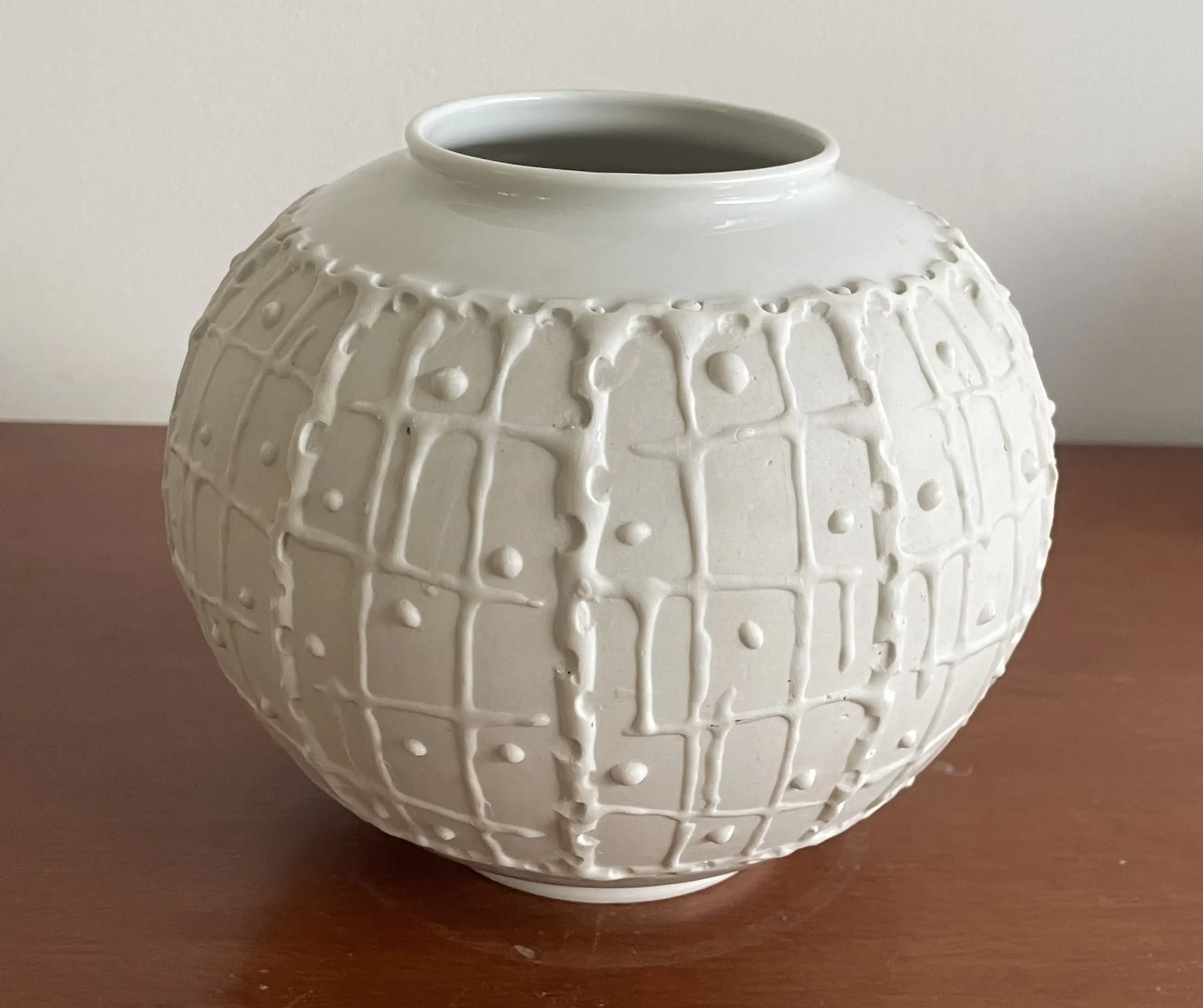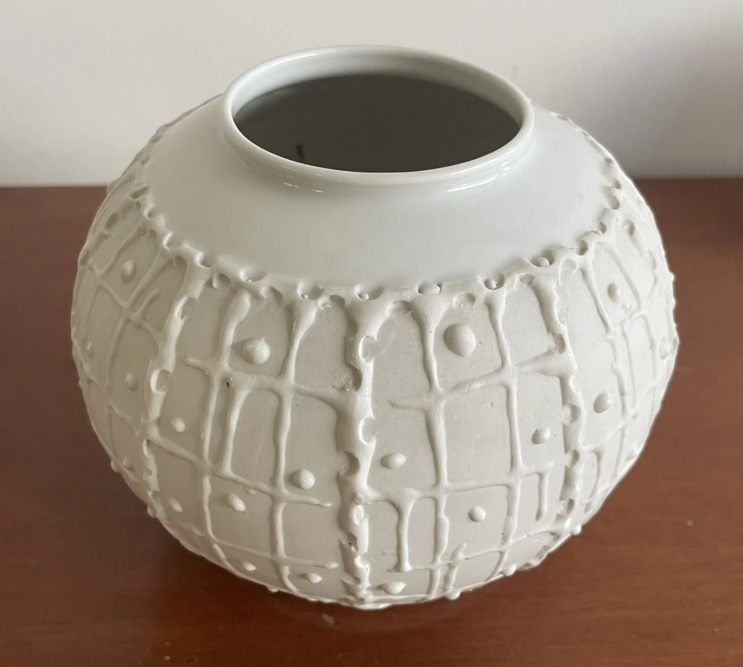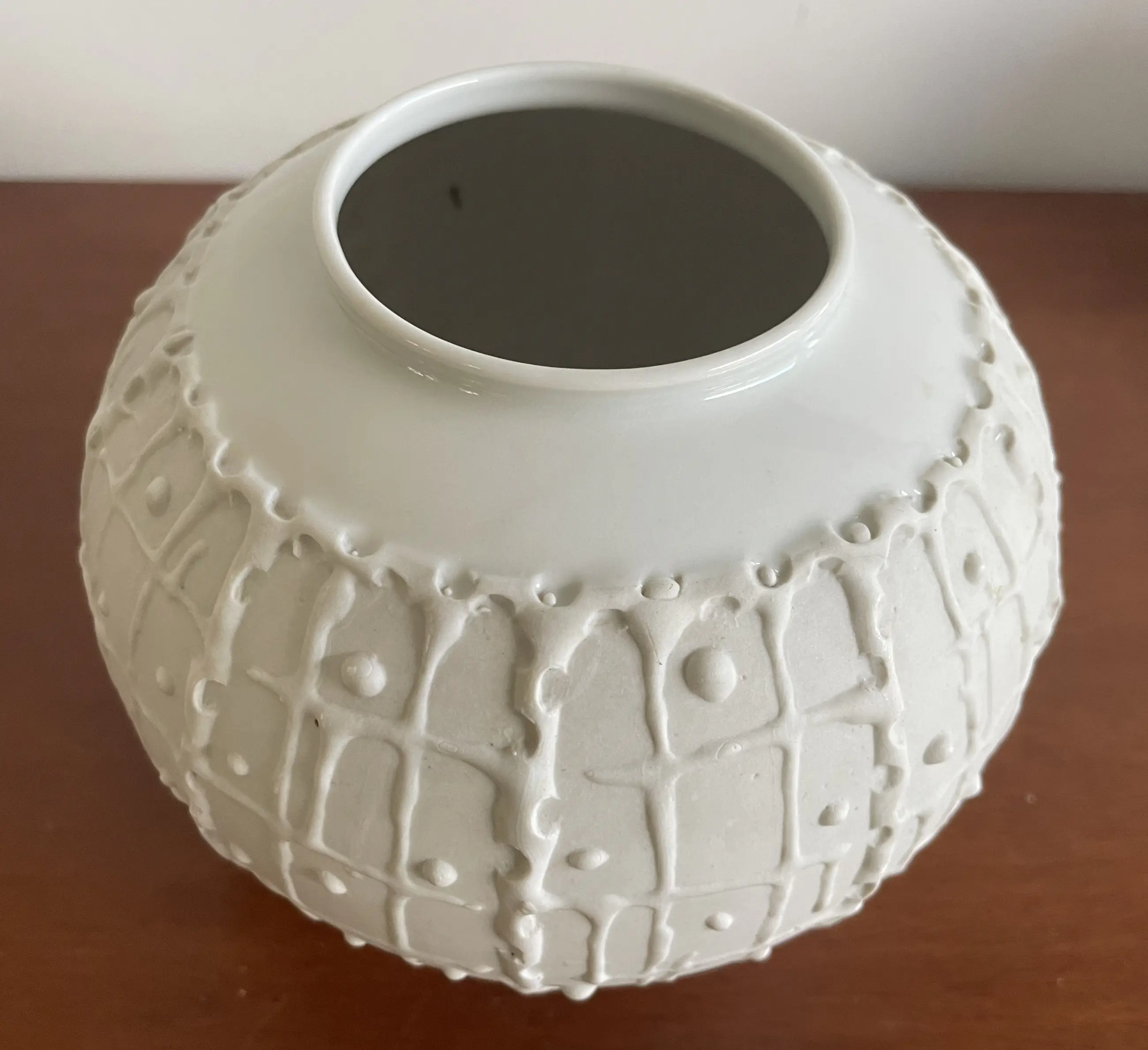 Deels biscuit en deels geglazuurd porseleinen bolvaasje in de Op Art stijl van Royal KPM Bavaria model 671/2. In prefecte conditie. Voorzien van een modelnummer aan de onderkant.