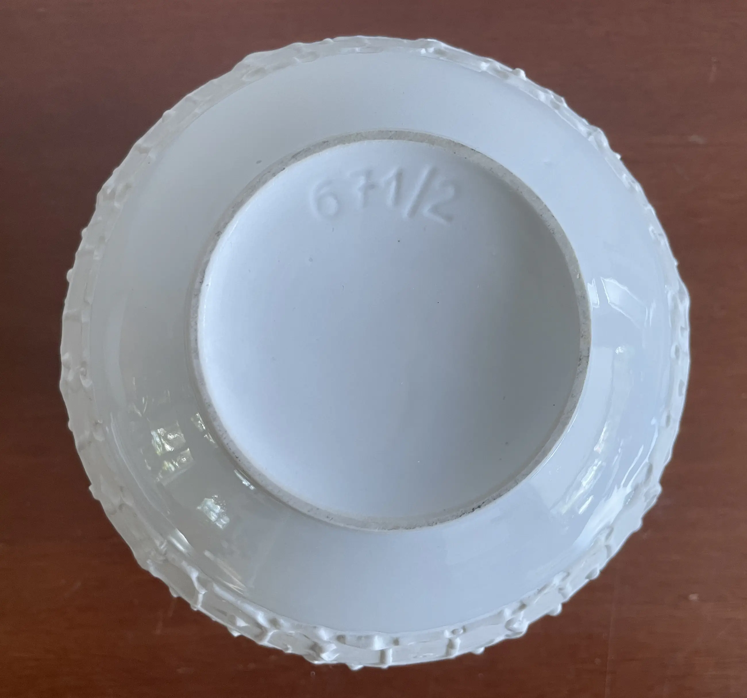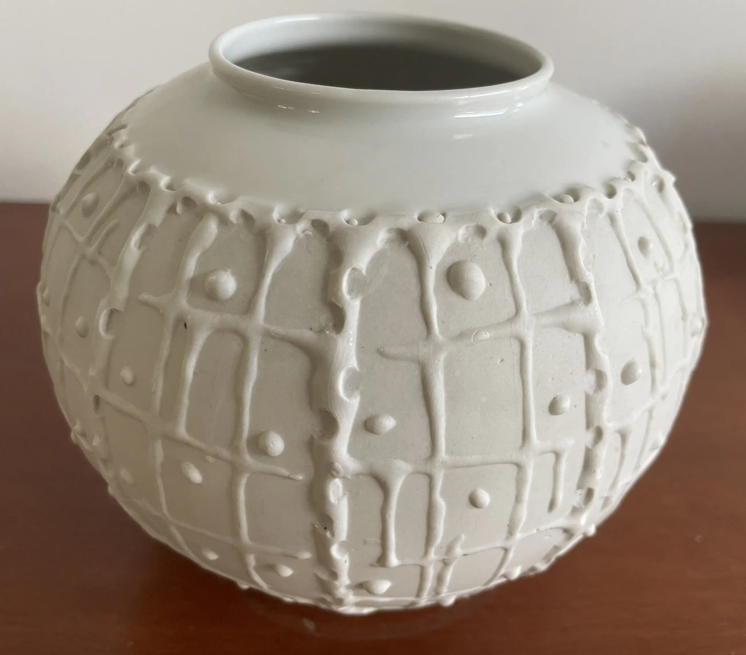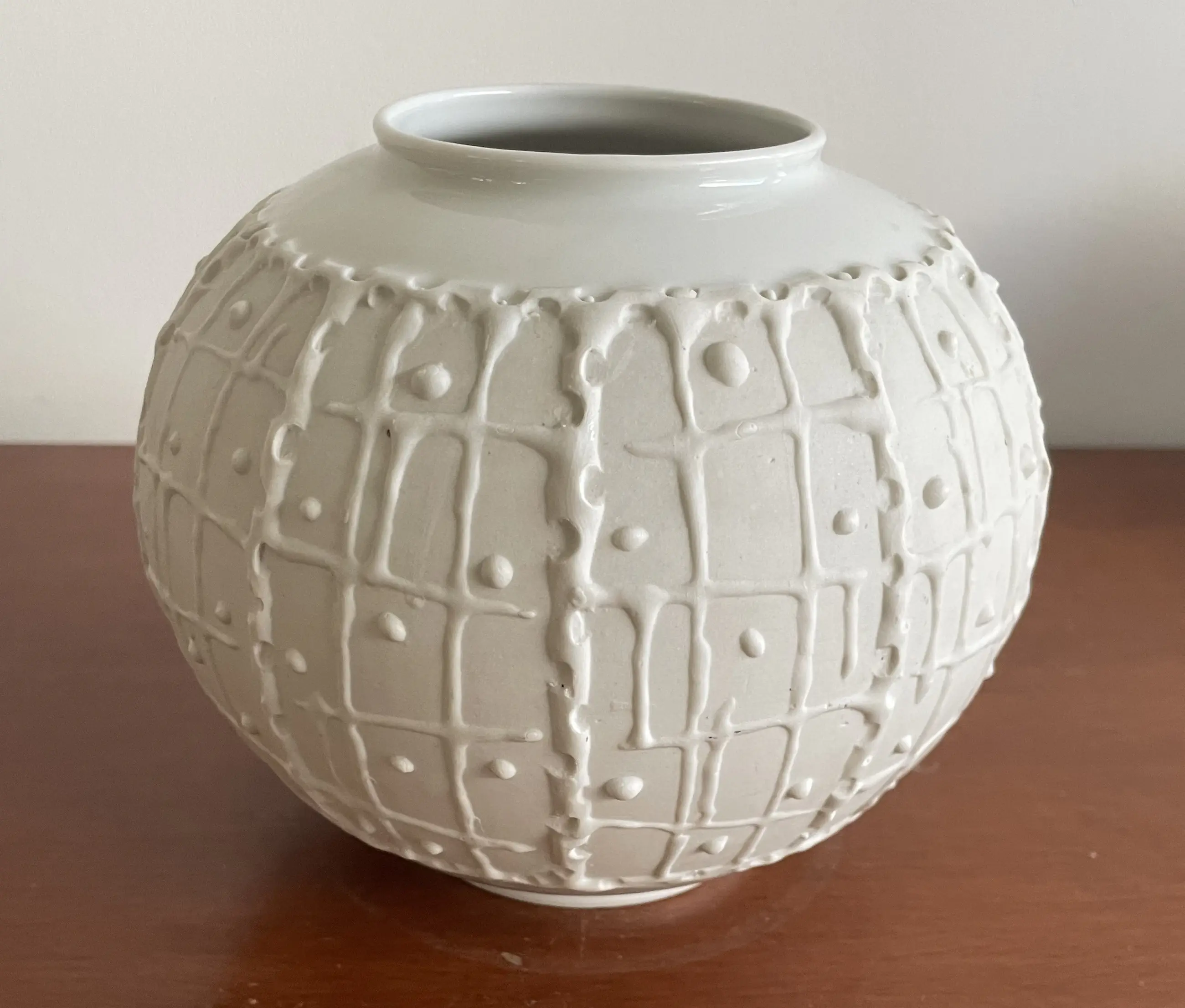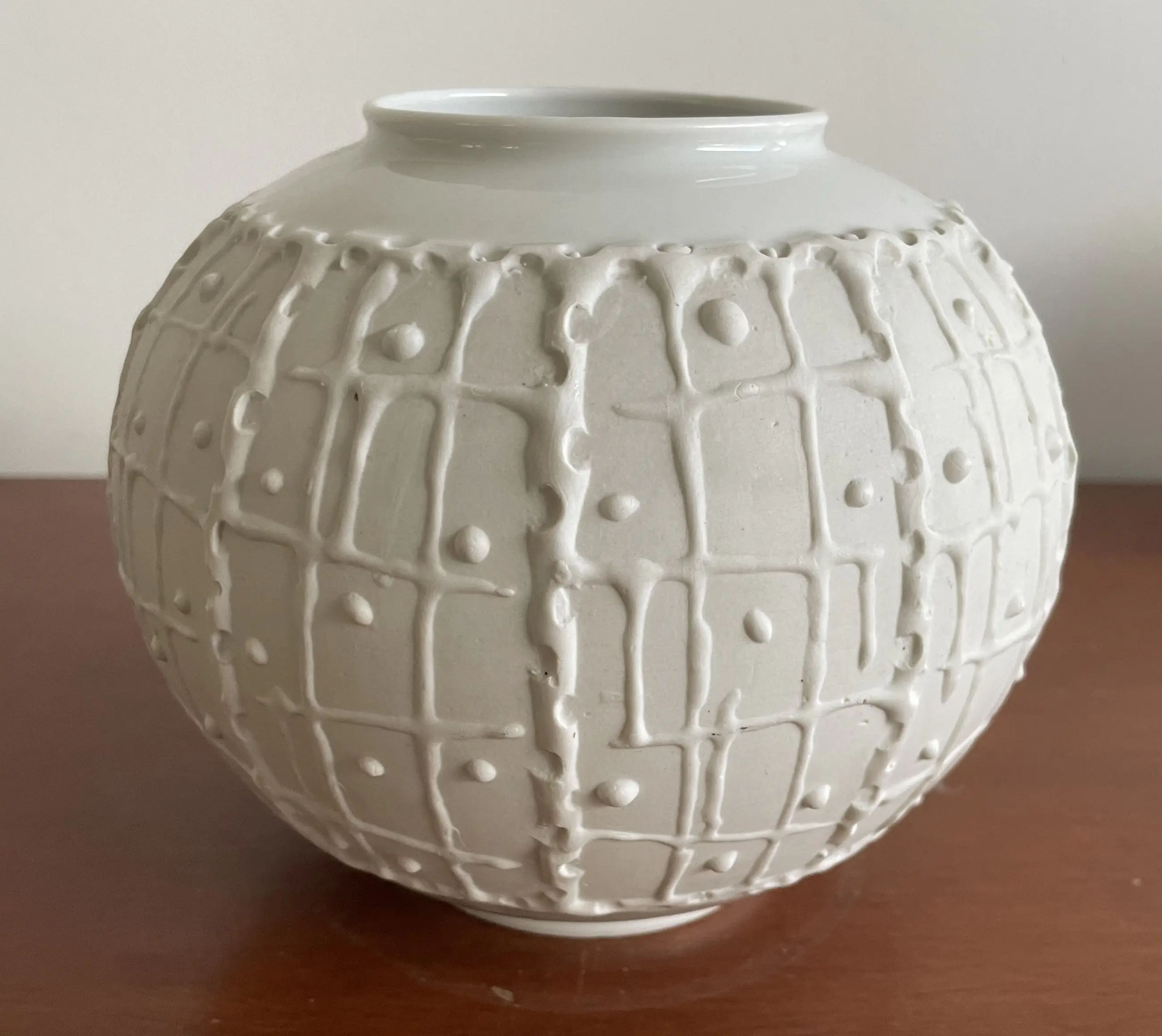 Deels biscuit en deels geglazuurd porseleinen bolvaasje in de Op Art stijl van Royal KPM Bavaria model 671/2. In prefecte conditie. Voorzien van een modelnummer aan de onderkant.