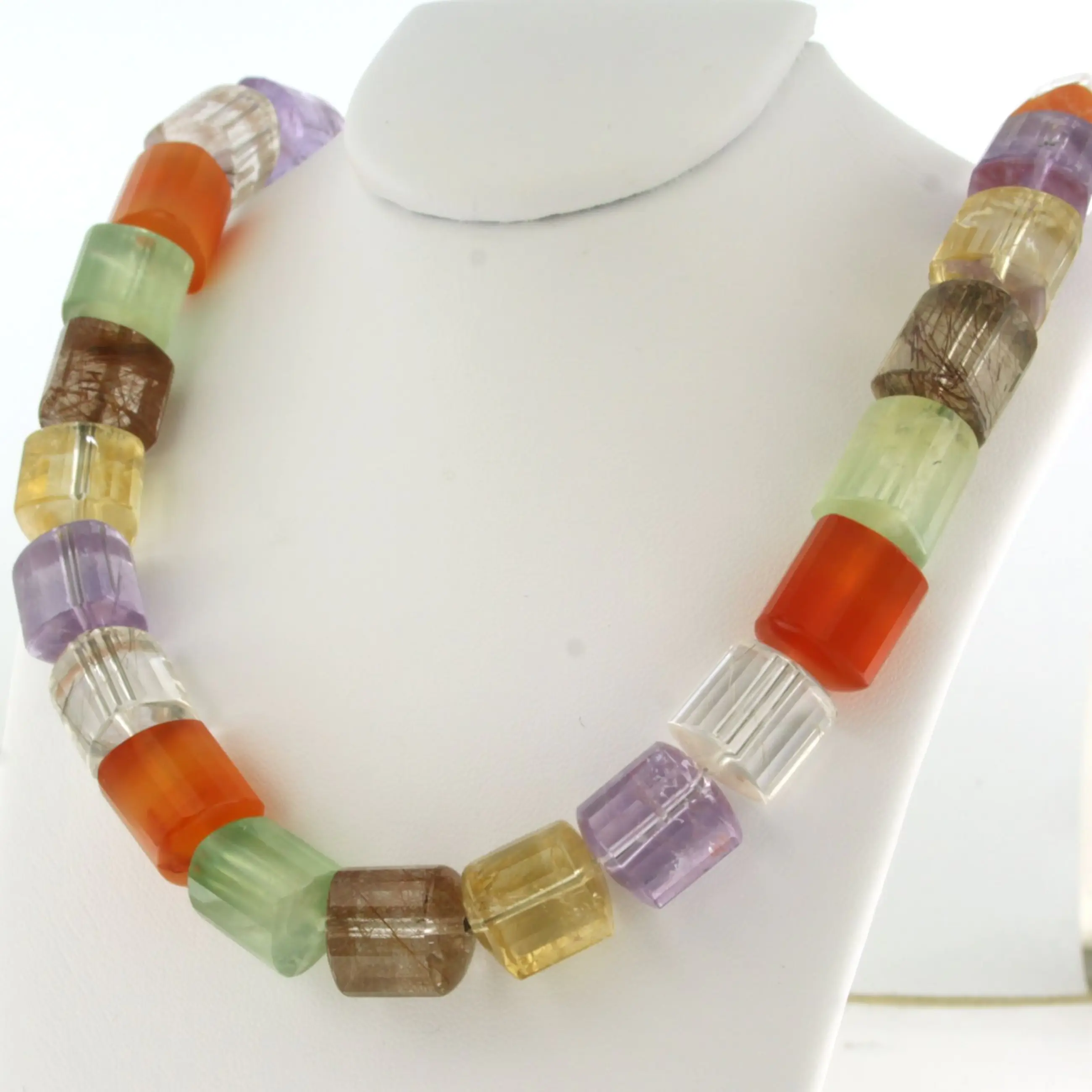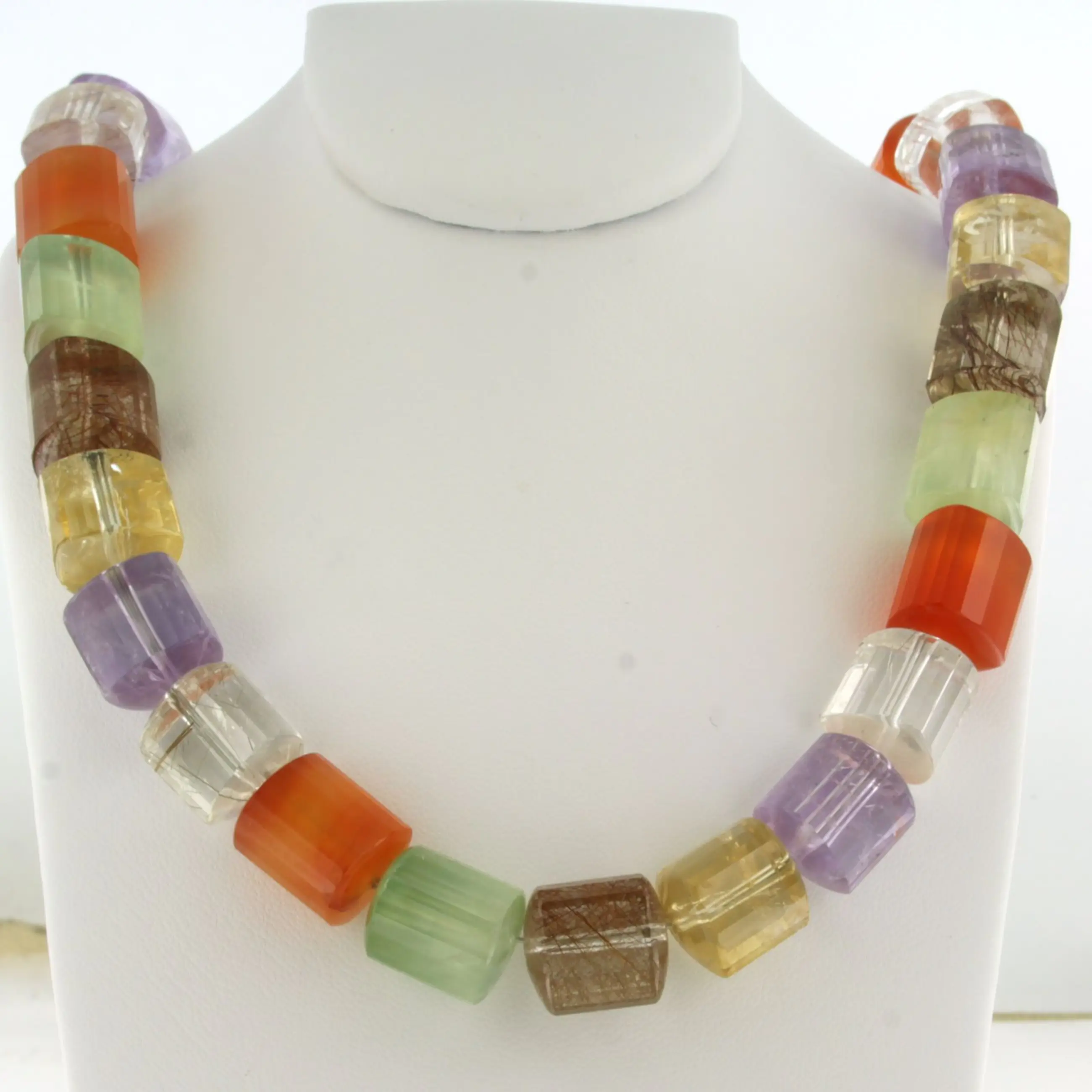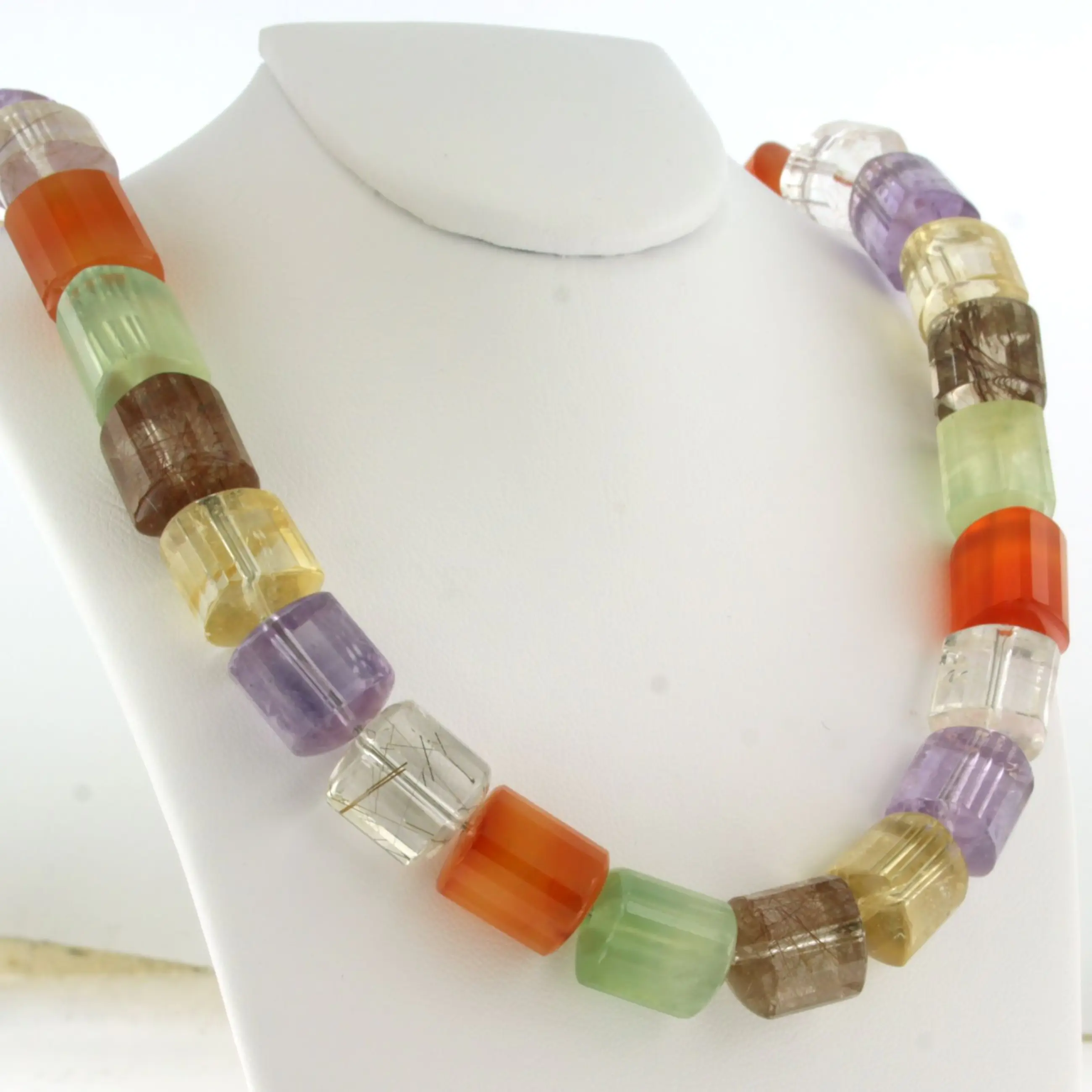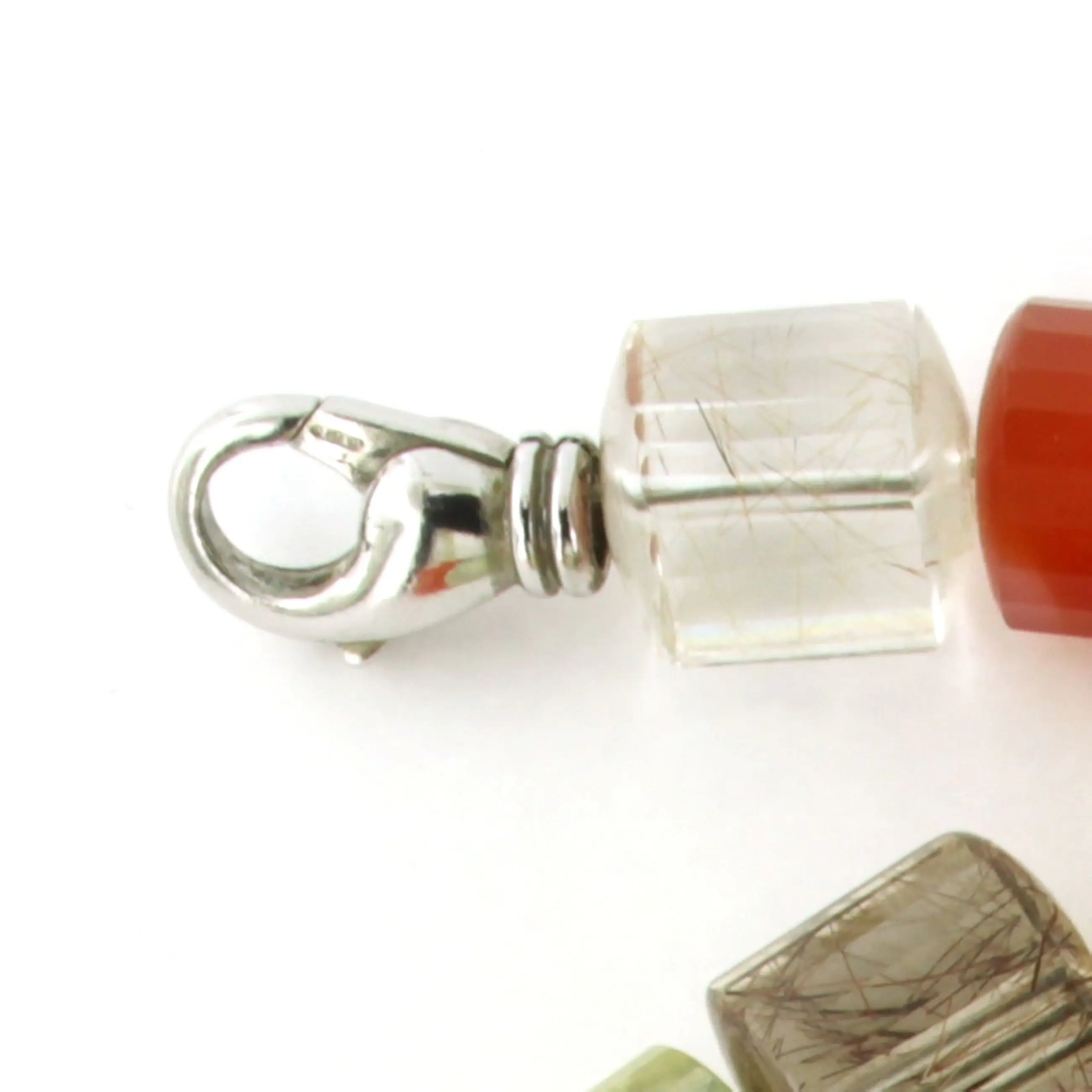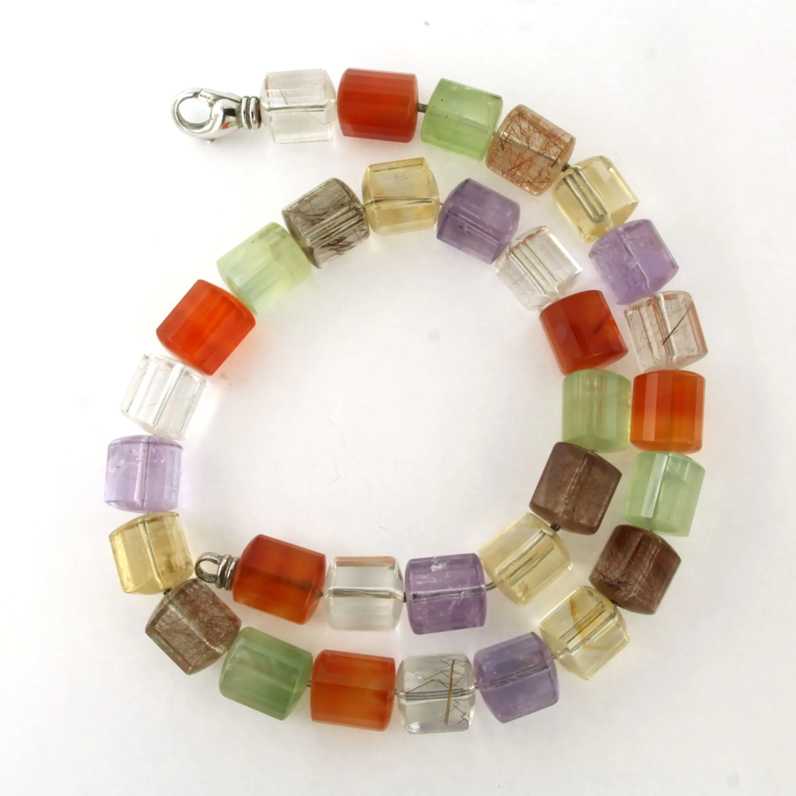Zilveren slot aan een kralen collier van carneool, amethist, groene amethist, bergkristal, citrien en rutiel kwarts - 45cm lang