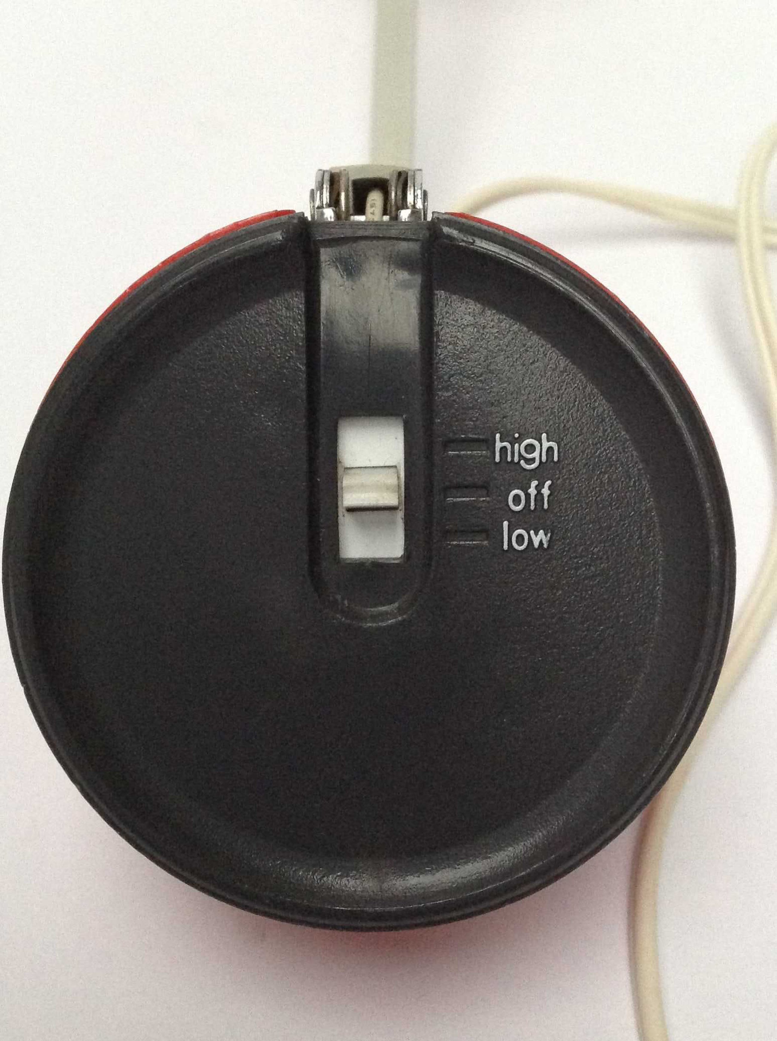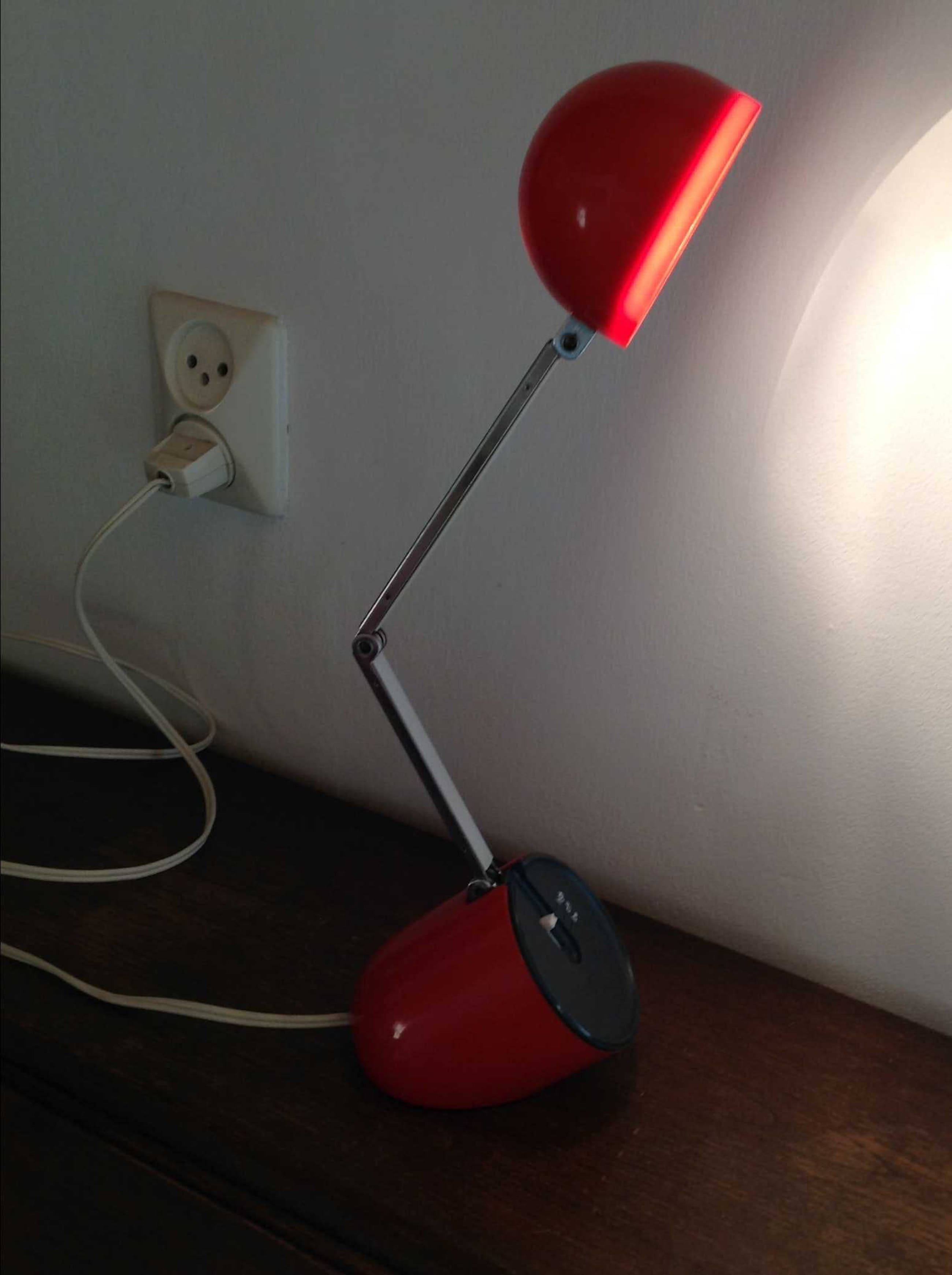 De lamp is rood van kleur en heeft een kunststof voet. Het kapje van kunststof heeft een metalen binnenwerk.