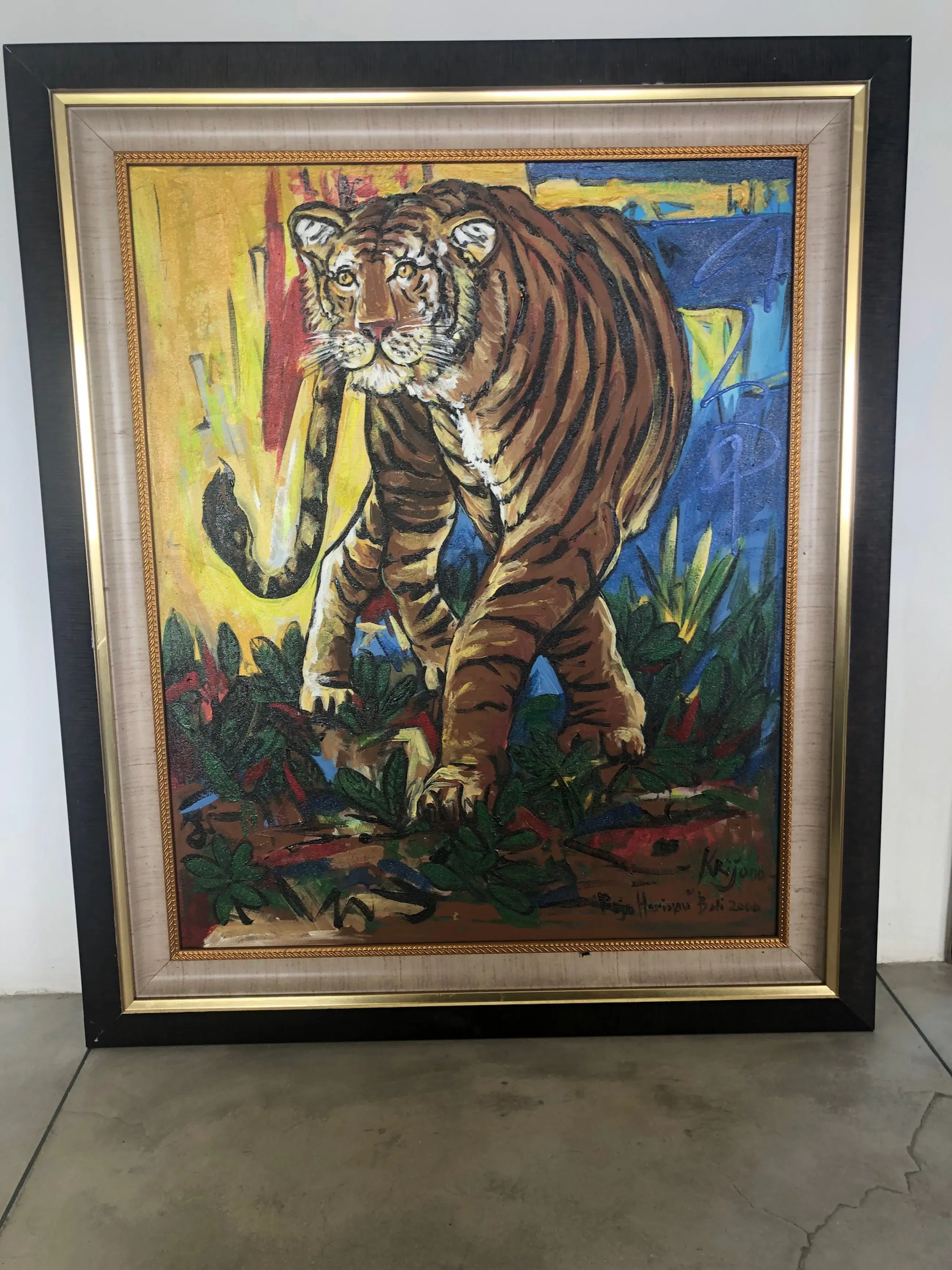 The artist had a distinguished style that differentiates him from his counterparties. In his expressionistic paintings, he used bright colours accompanied by spontaneous bold lines and brush strokes. In the use of colours, Krijono strongly believed that he could use any colour to satisfy the needs of his works. He refused to mix paints to create colours. He justifies this by saying that he is a painter not a mixer. Since moving to Ubud, he transformed his style to a strong, modern expression filled with colours and reflecting the Balinese surroundings. His expressive and flamboyant works have been exhibited extensively around the world. Krijono has participated in solo and group exhibitions in Indonesia, Singapore, Malaysia, Japan, Italy, France, Belgium and in The Hague, the Netherlands. One of his collectors, Gianni Versace admired Krijono’s use of colours especially red, green and gold.