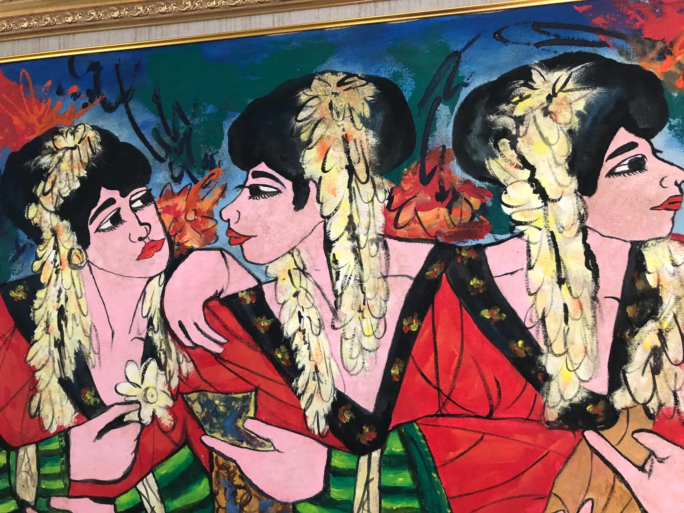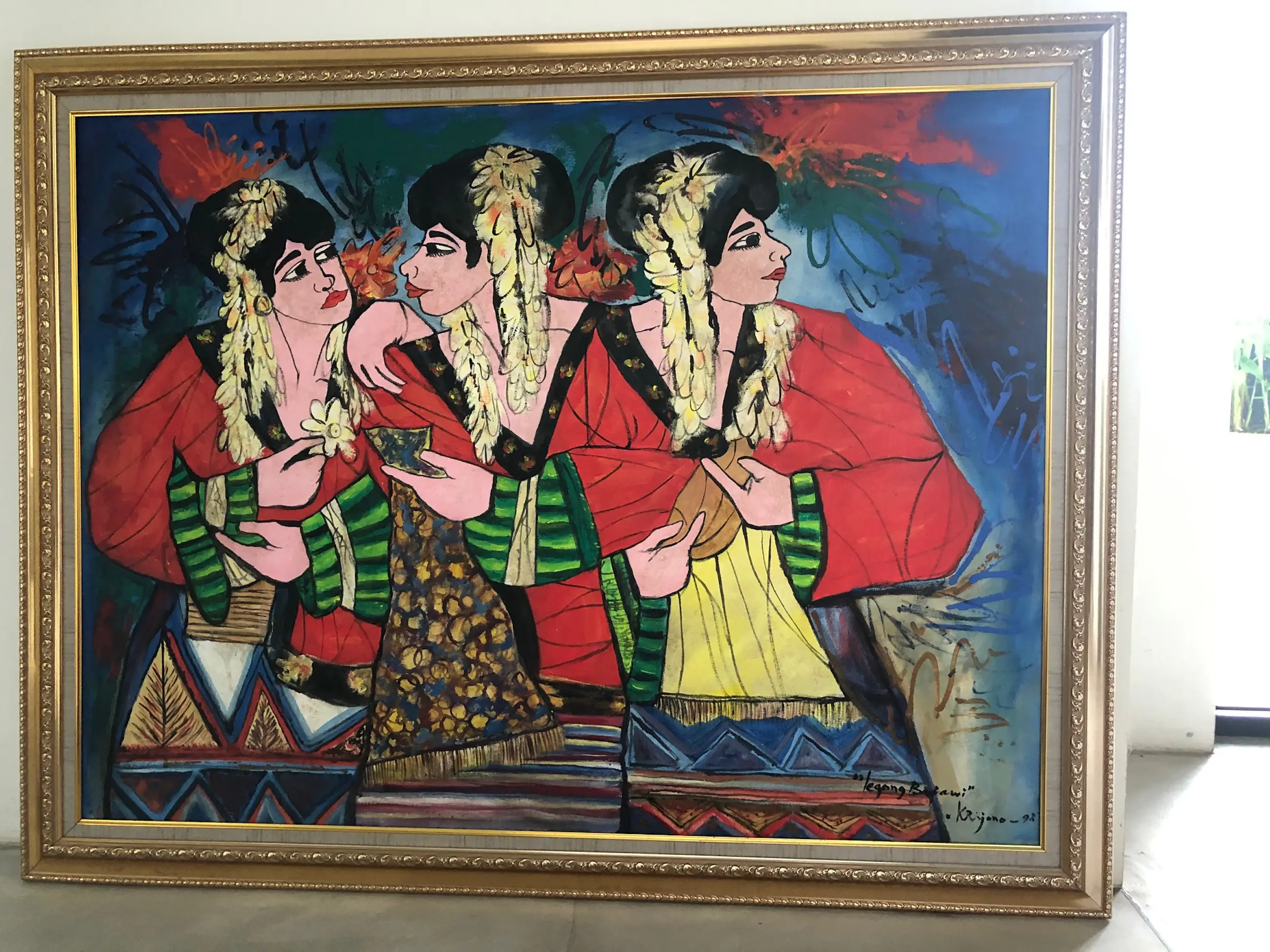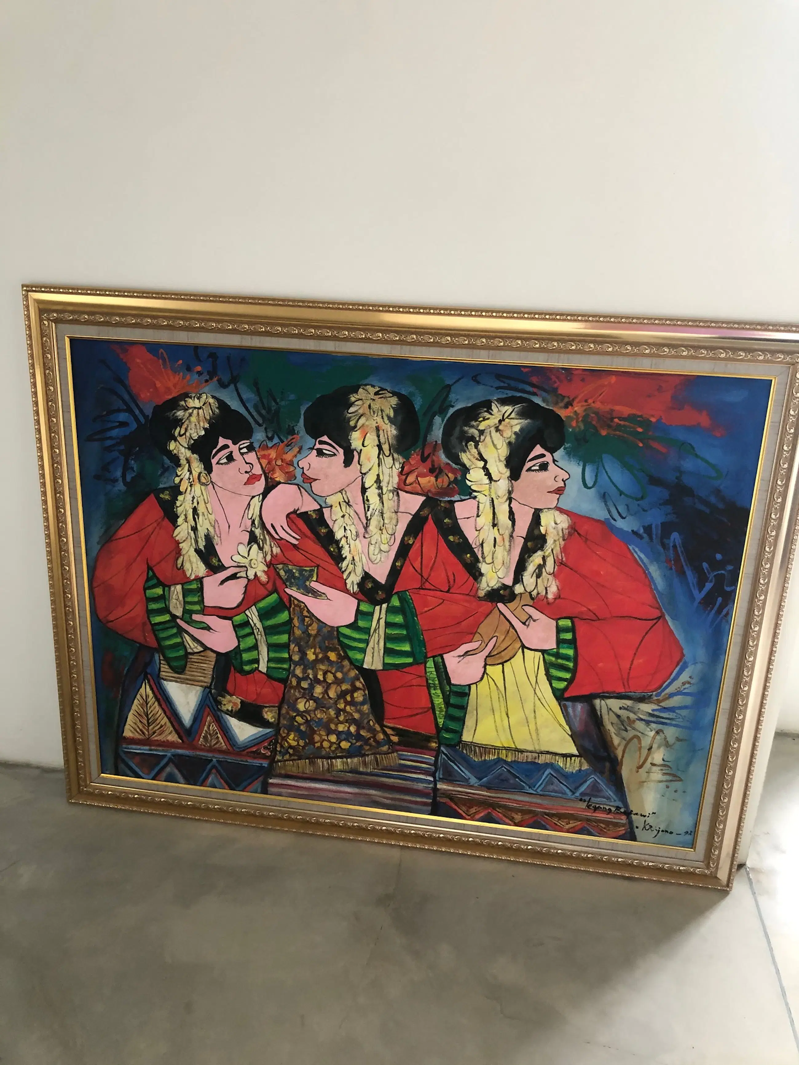 The artist had a distinguished style that differentiates him from his counterparties. In his expressionistic paintings, he used bright colours accompanied by spontaneous bold lines and brush strokes. In the use of colours, Krijono strongly believed that he could use any colour to satisfy the needs of his works. He refused to mix paints to create colours. He justifies this by saying that he is a painter not a mixer. Since moving to Ubud, he transformed his style to a strong, modern expression filled with colours and reflecting the Balinese surroundings. His expressive and flamboyant works have been exhibited extensively around the world. Krijono has participated in solo and group exhibitions in Indonesia, Singapore, Malaysia, Japan, Italy, France, Belgium and in The Hague, the Netherlands. One of his collectors, Gianni Versace admired Krijono’s use of colours especially red, green and gold.
