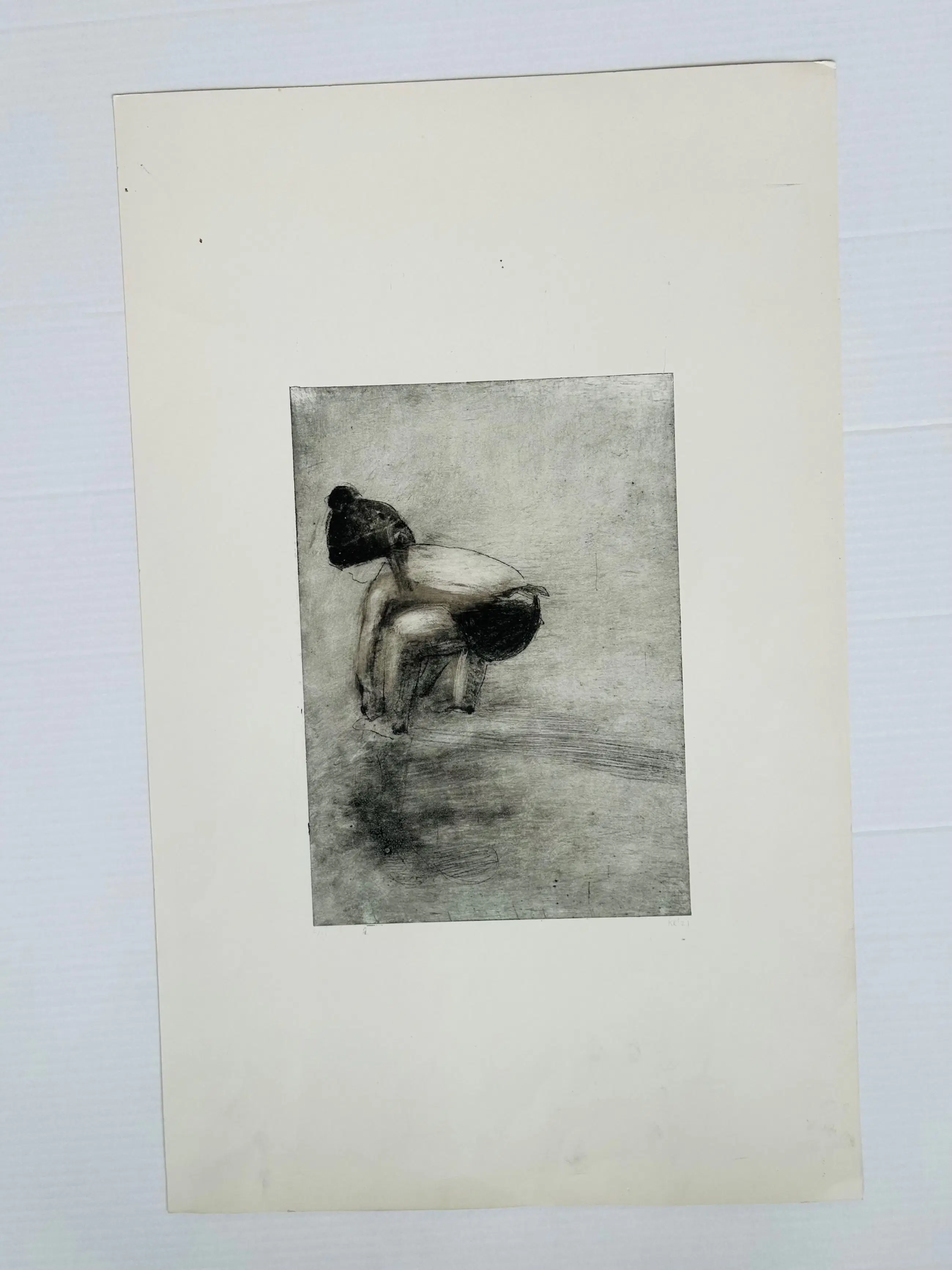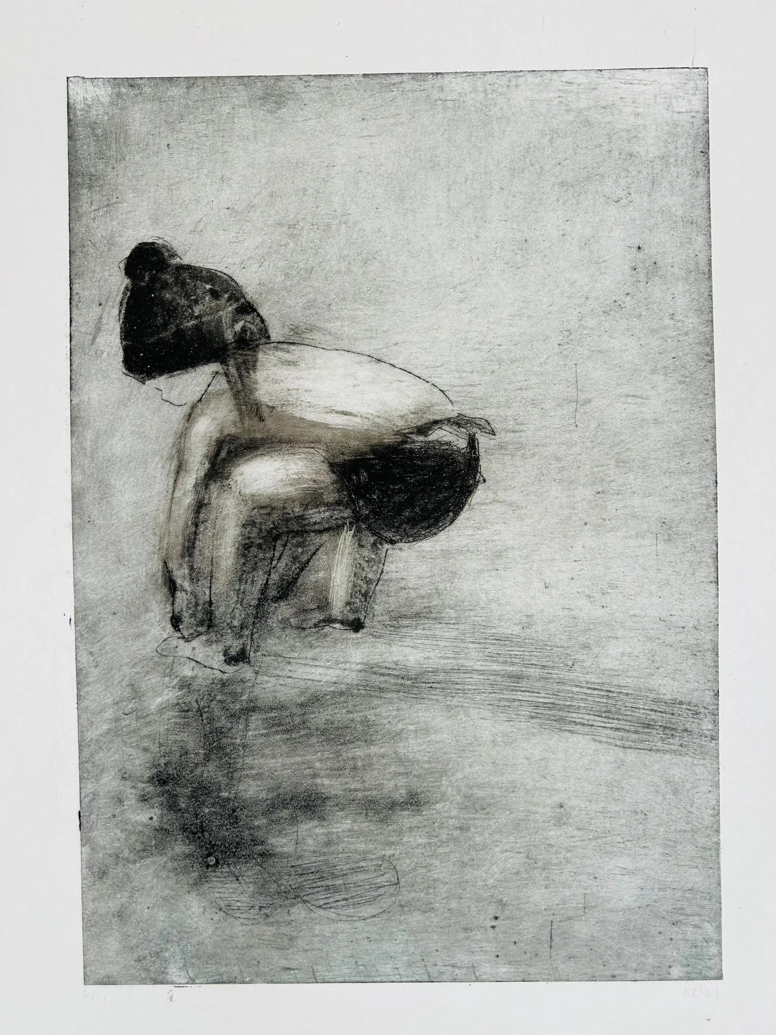 Uit een grote collectie konden wij werk verwerven  van de Nederlandse kunstenaar Krin Rinsema. Poëtisch en zeer fraai gemaakt werk om te verstillen of bij weg te dromen. Het werk verkeert in perfecte conditie. De vlekjes en zwarte vegen in de witrand rondom het kunstwerk zijn gemaakt door de kunstenaar in het proces en kunnen worden afgedekt met een passe partout maar onderdeel van het maak en bewerkproces van de kunstenaar. De indruk van de ets is kleiner dan de papiermaat.