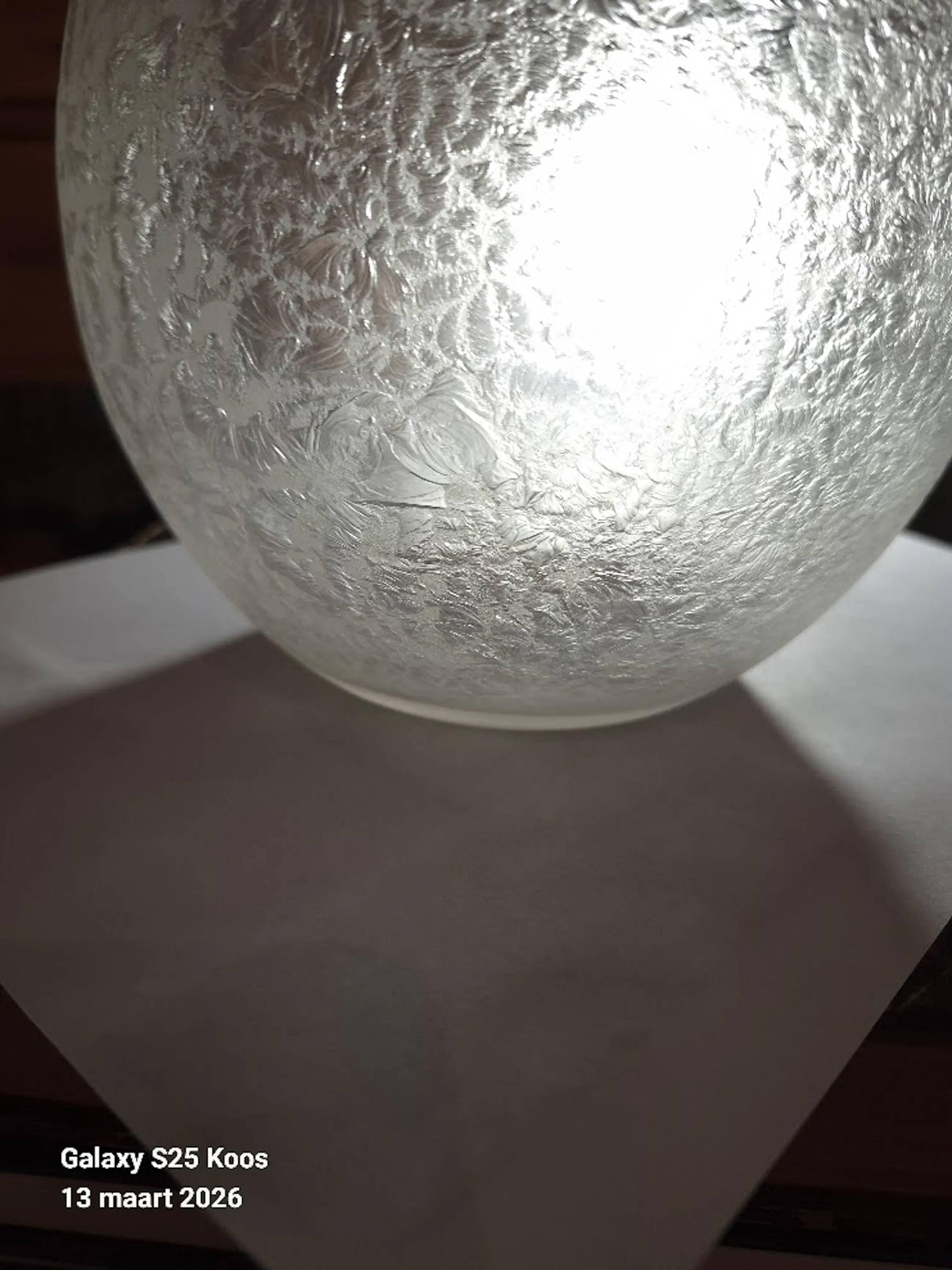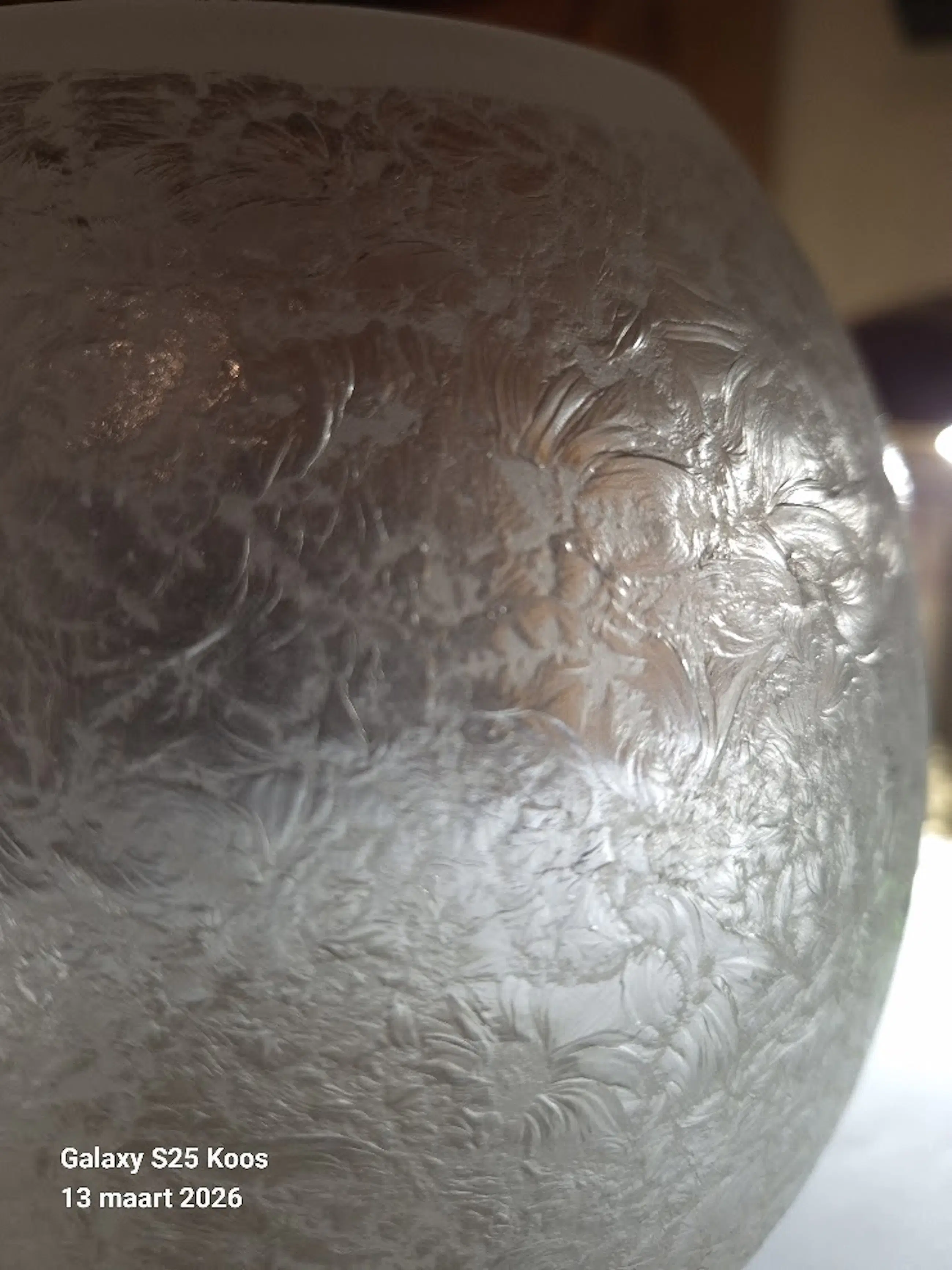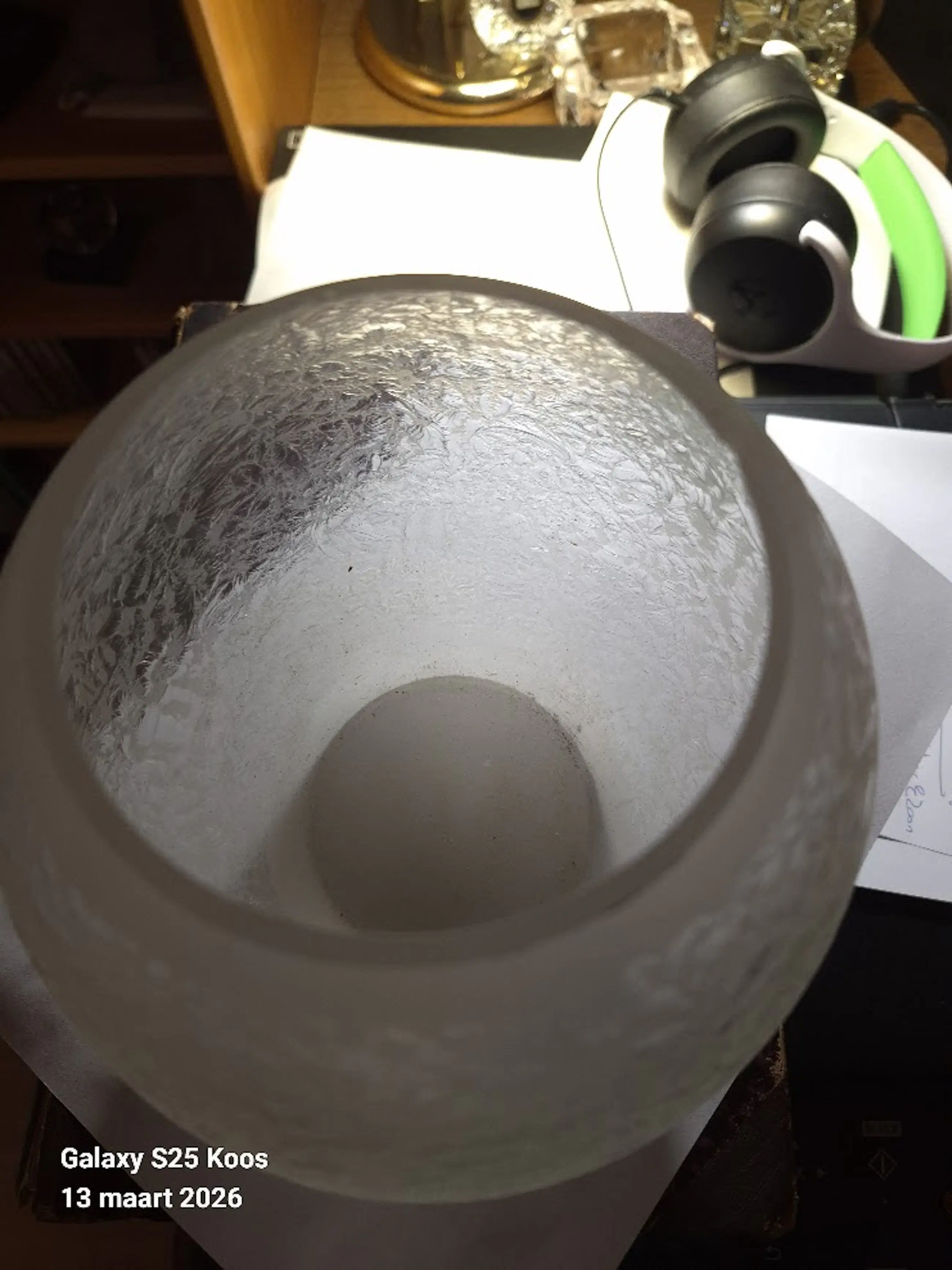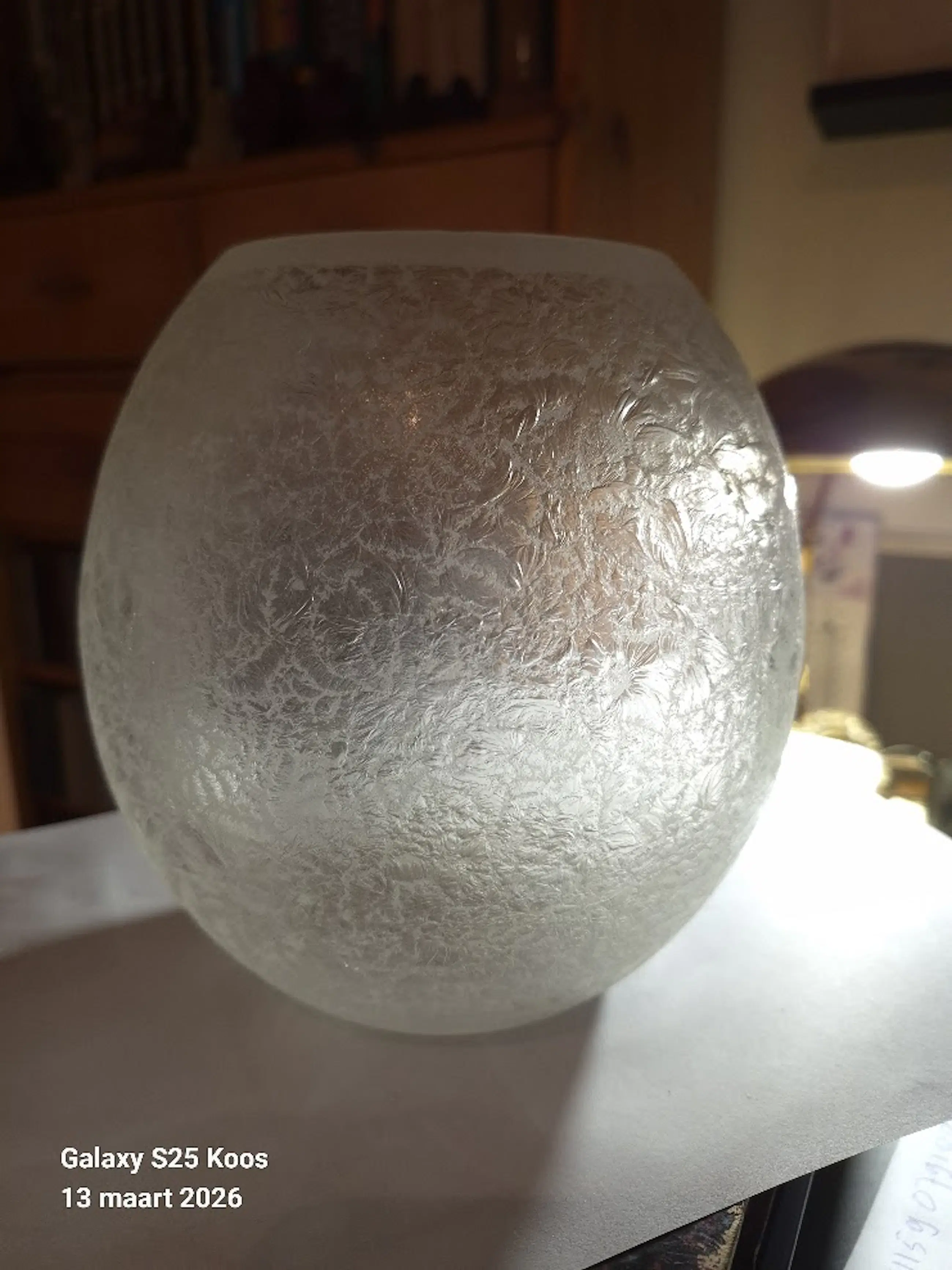 Mooie vaas, Blise decor MontBlanc van de kristalunie in Maastricht. Vaas is in 1939 ontworpen door W.J.Rozendaal.Het glas is gesatineerd en heeft daardoor een bevroren patroon; De vaas heeft twee kleine beschadigingen aan de bovenran maar die zij bijna onzichtbaar.