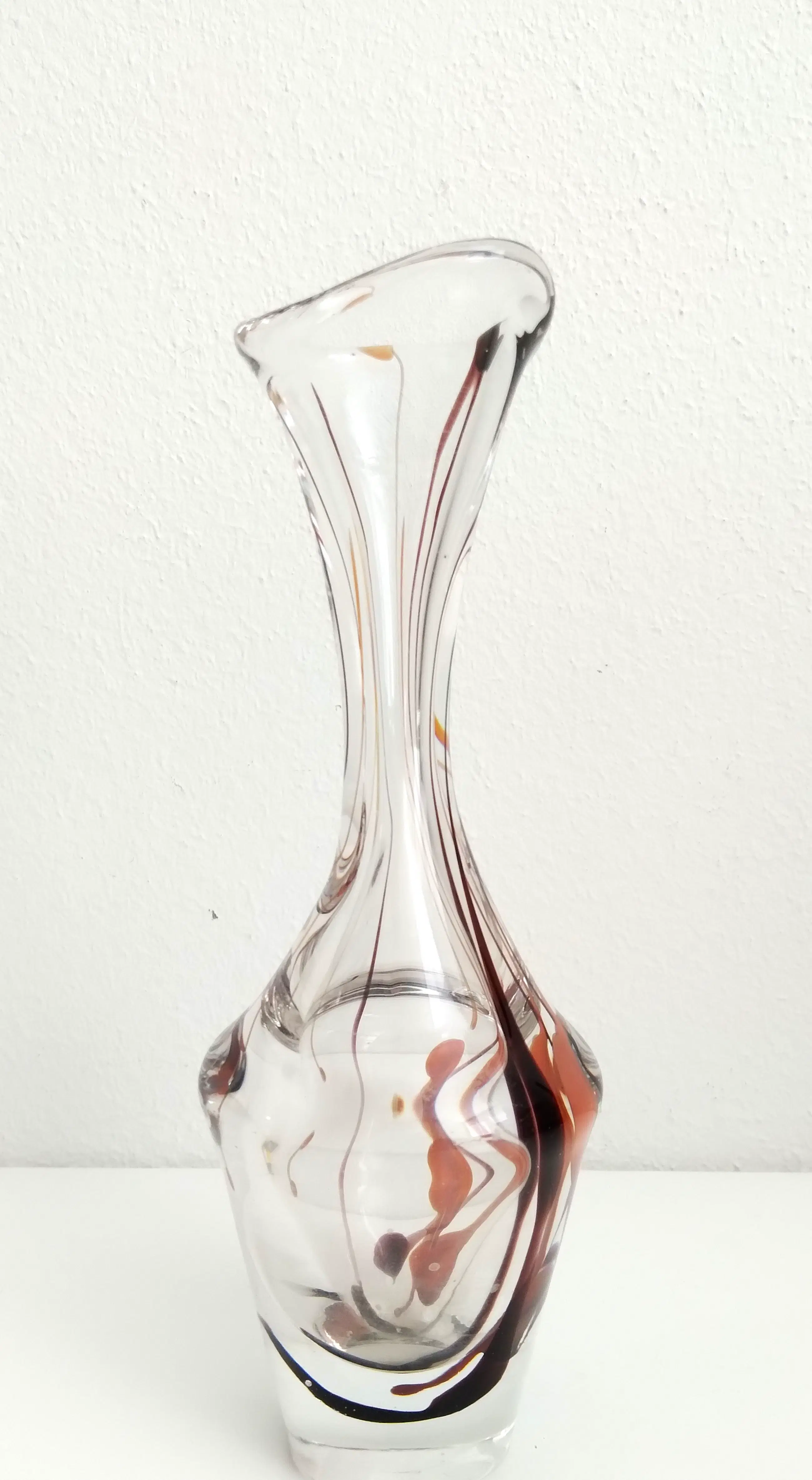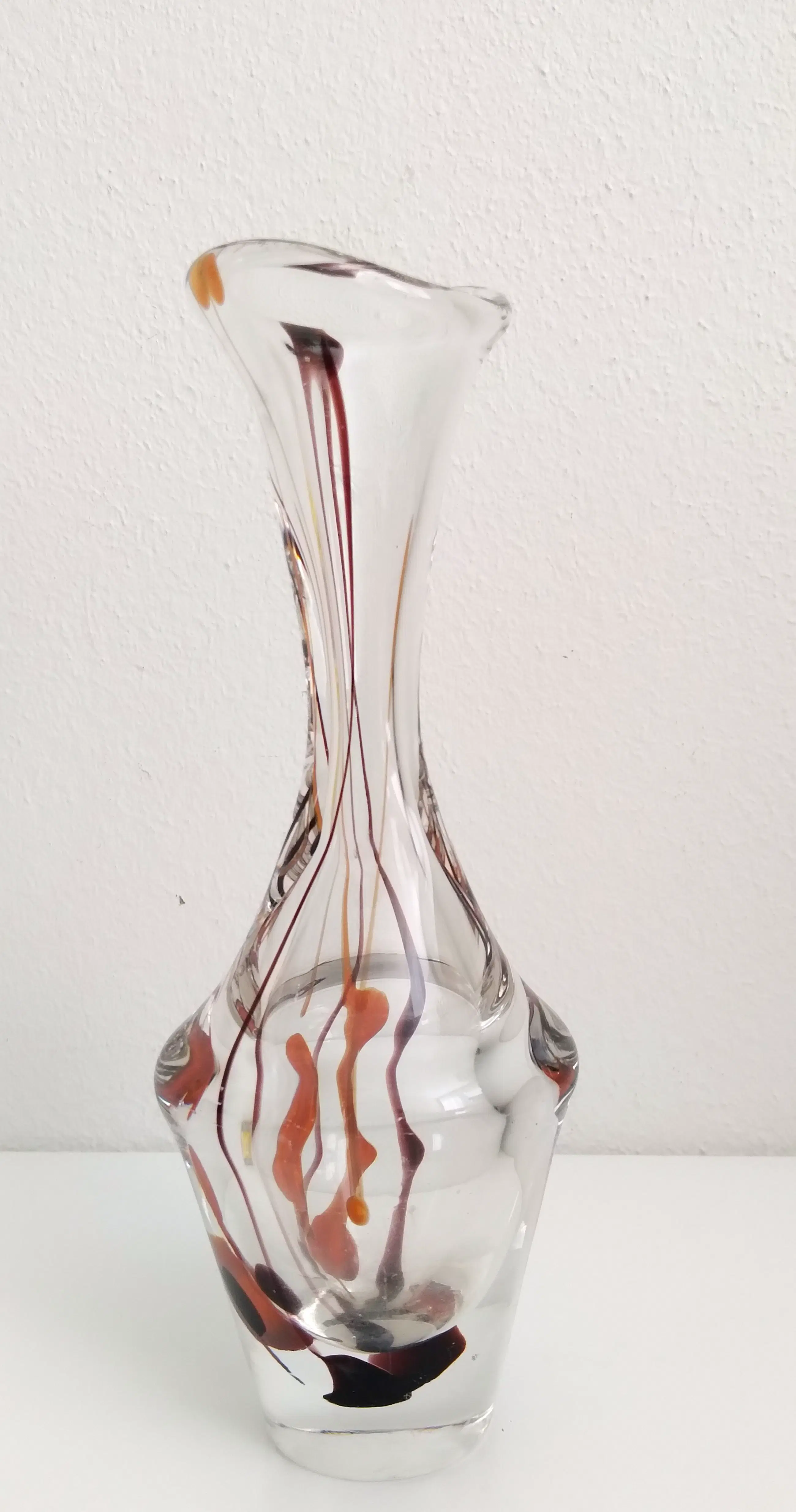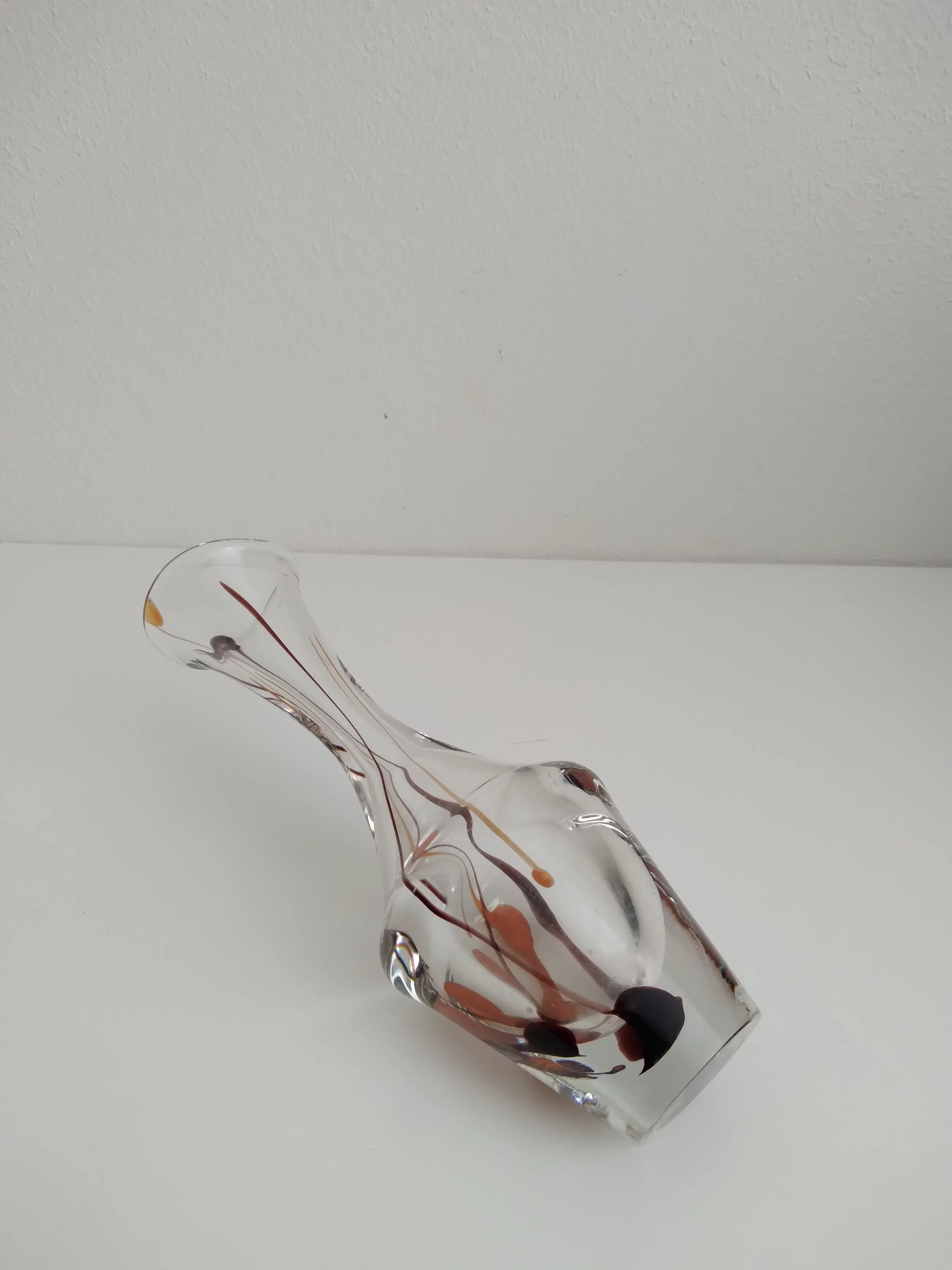 Sierlijke dikwandige vaas met ingesloten zacht oranje en bruinkleurige linten.