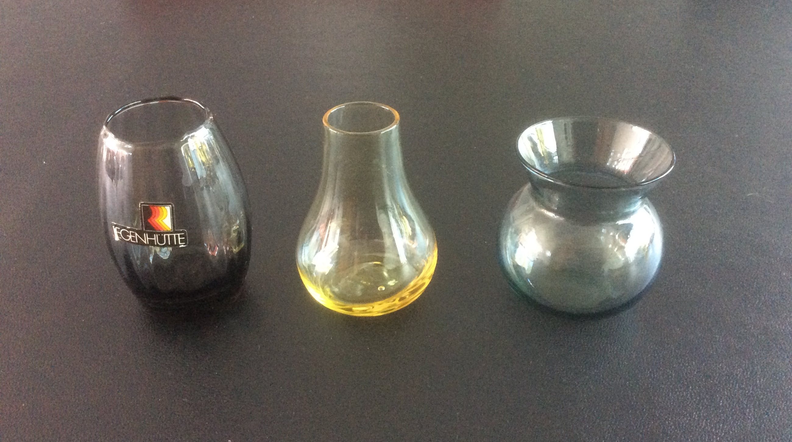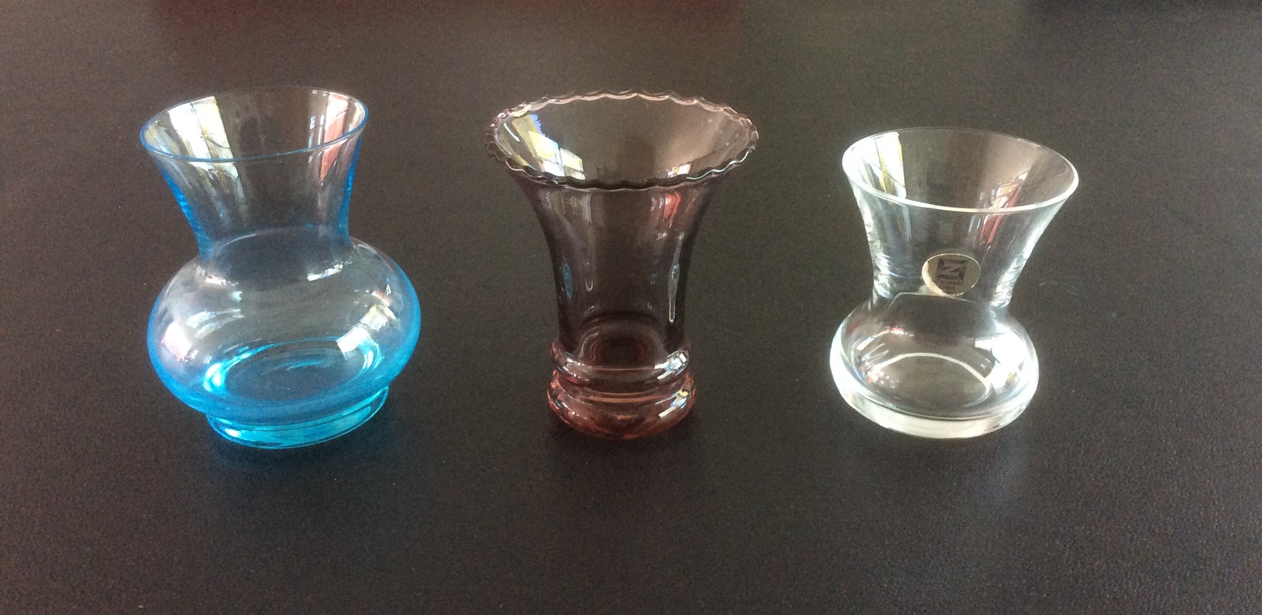 Een verzameling van negen kleine vaasjes in hoogte variërend van 7 cm tot 9 cm. De herkomst van de vaasjes is niet bekend, maar waarschijnlijk o.a. van Maastricht, Tsjechië, Regenhütte, Zwiesel en Leerdam. Alle vaasjes zijn helder. De twee paarse vaasjes missen een klein schilfertje aan de bovenrand.