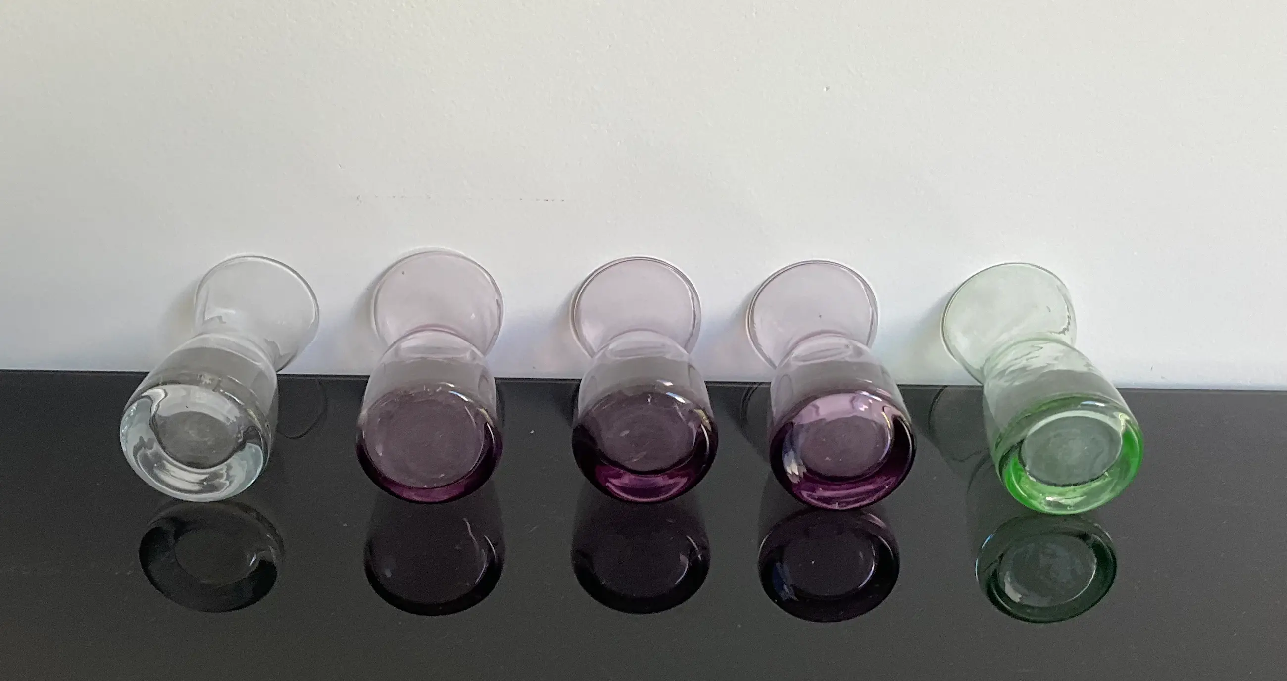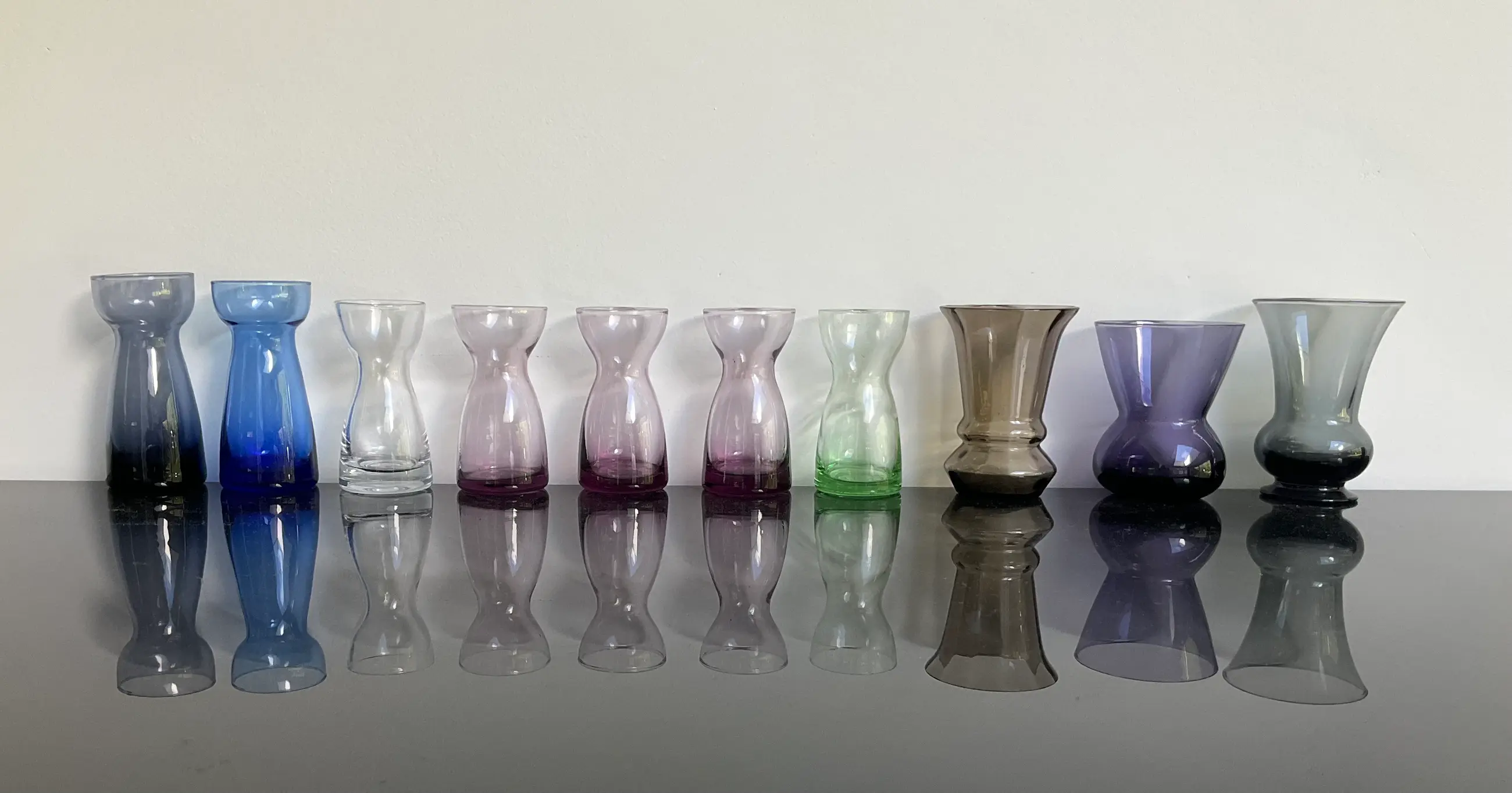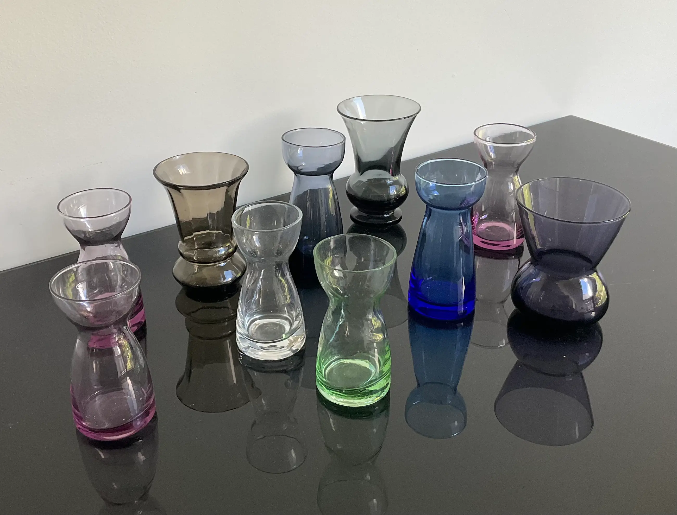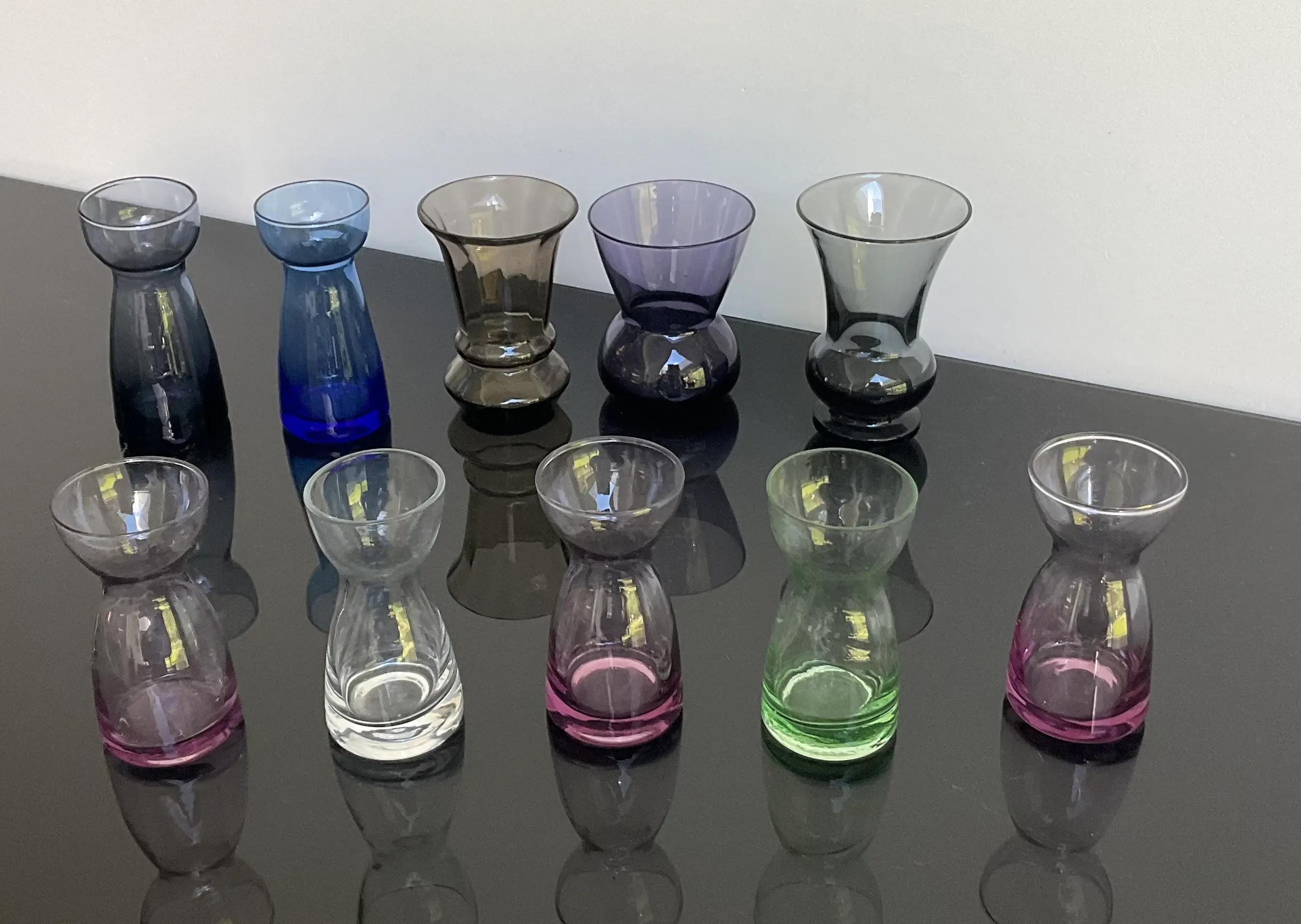 Verzameling van negen bijzondere mini vaasjes. Van Kristal Unie e.a. De hoogte van de vaasjes varieert van 7,5 tot 9 cm. Alle vaasjes zijn helder en gaaf.