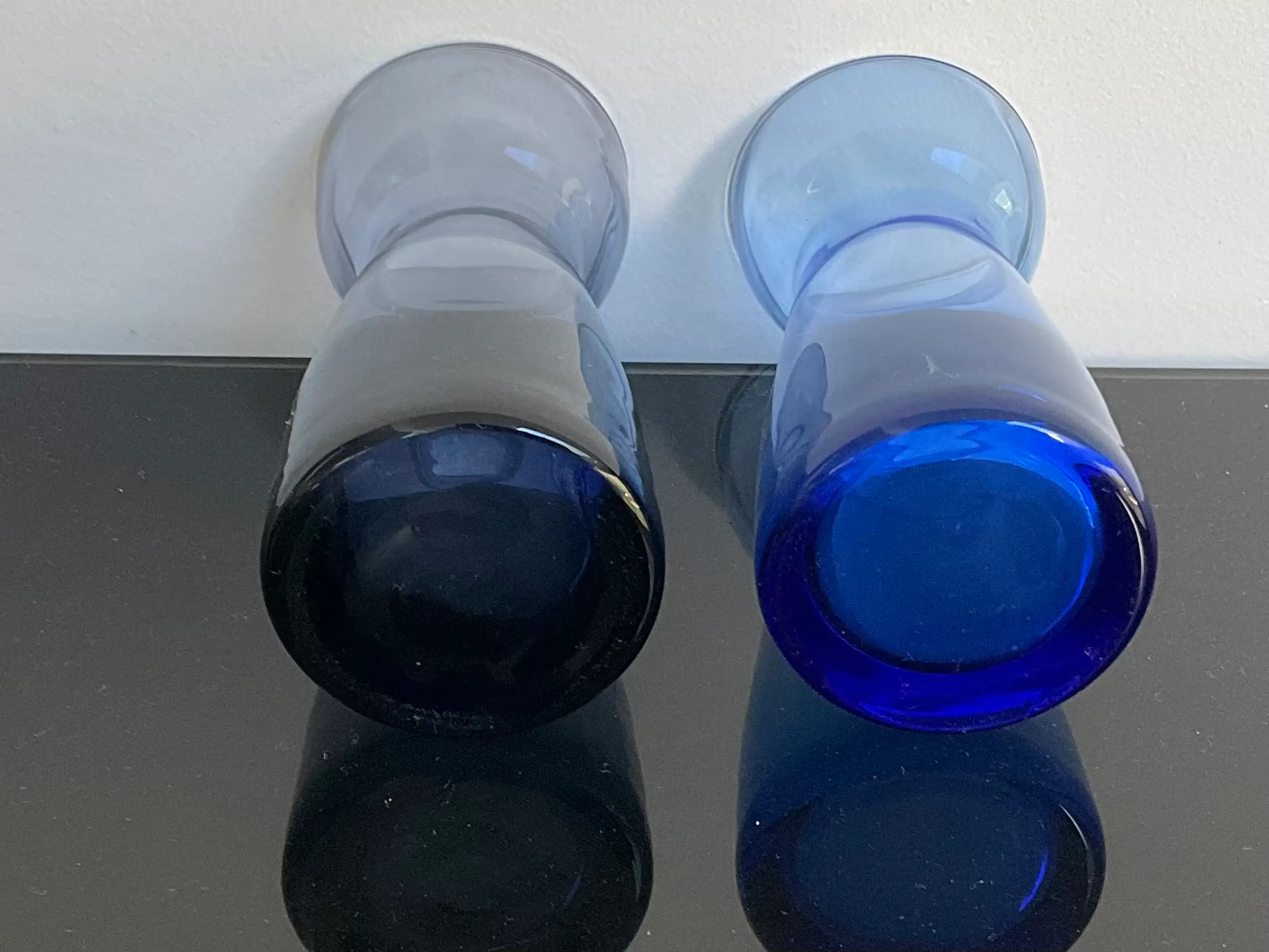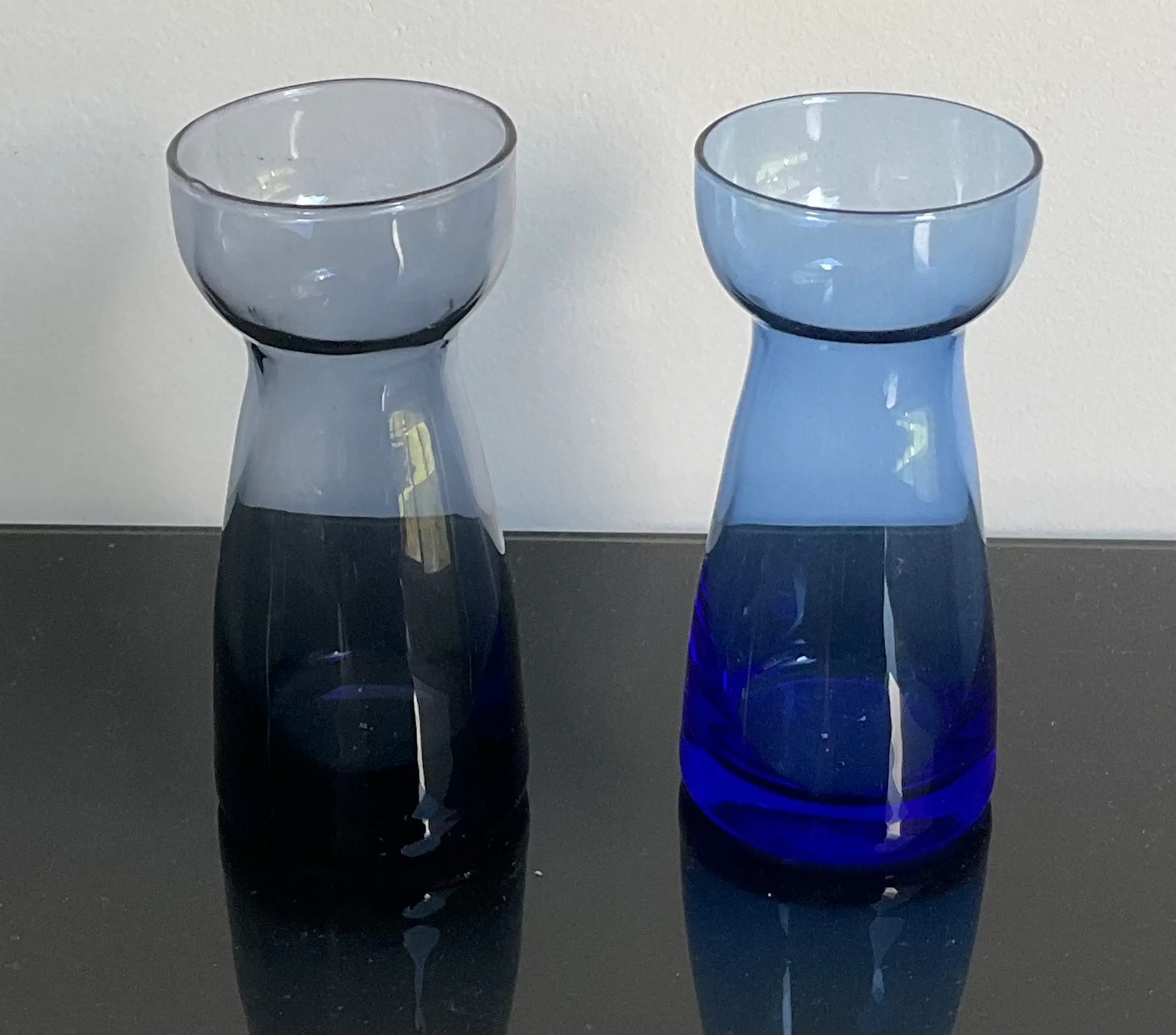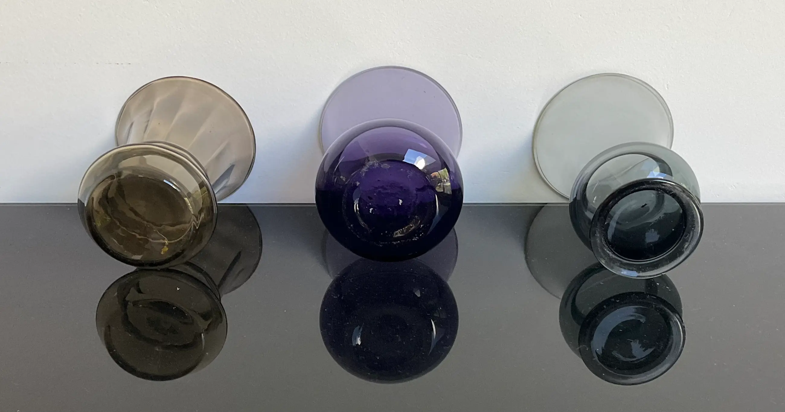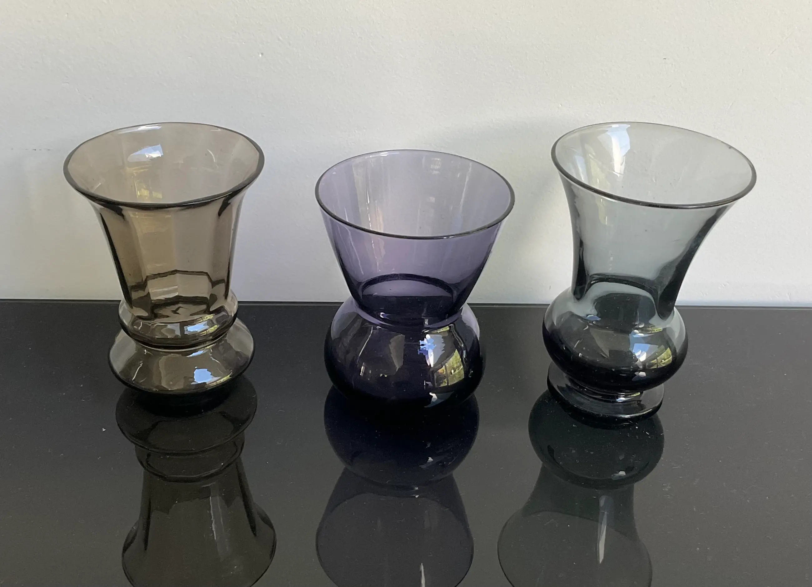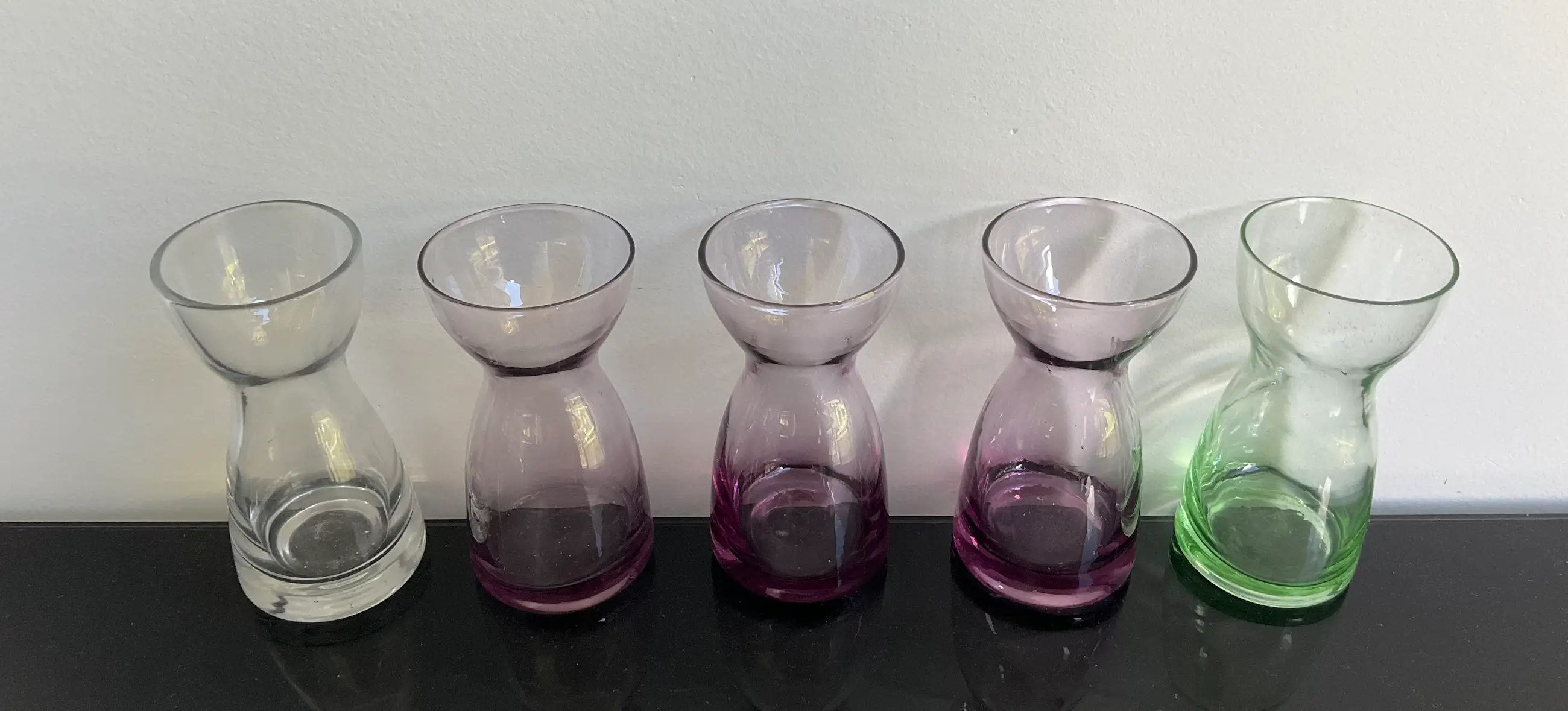 Verzameling van negen bijzondere mini vaasjes. Van Kristal Unie e.a. De hoogte van de vaasjes varieert van 7,5 tot 9 cm. Alle vaasjes zijn helder en gaaf.