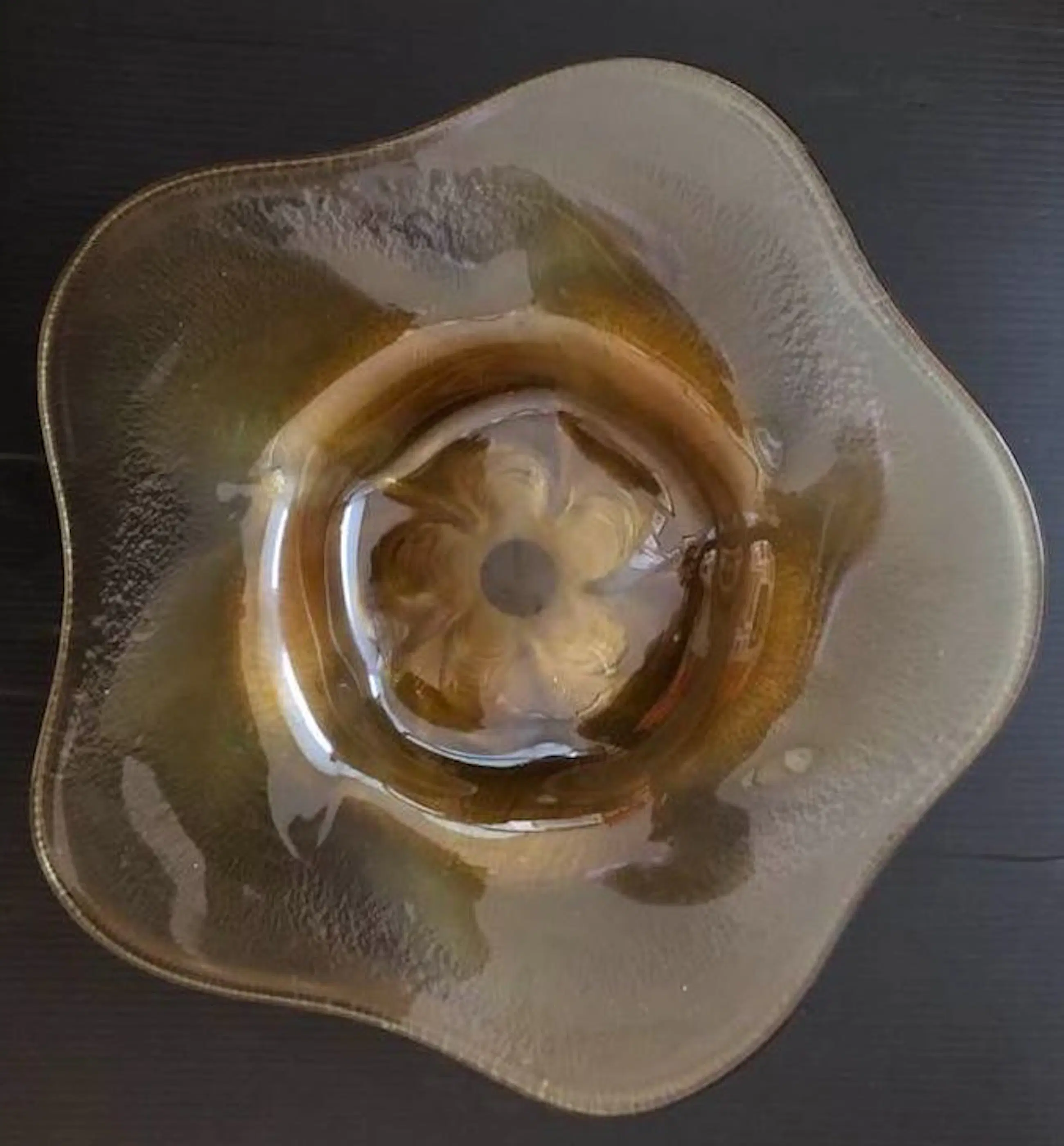 Goudgele glazen craquelè schaal "Coquille" met ingeslepen bloemmotief ontworpen door W.J. Rozendaal in 1938