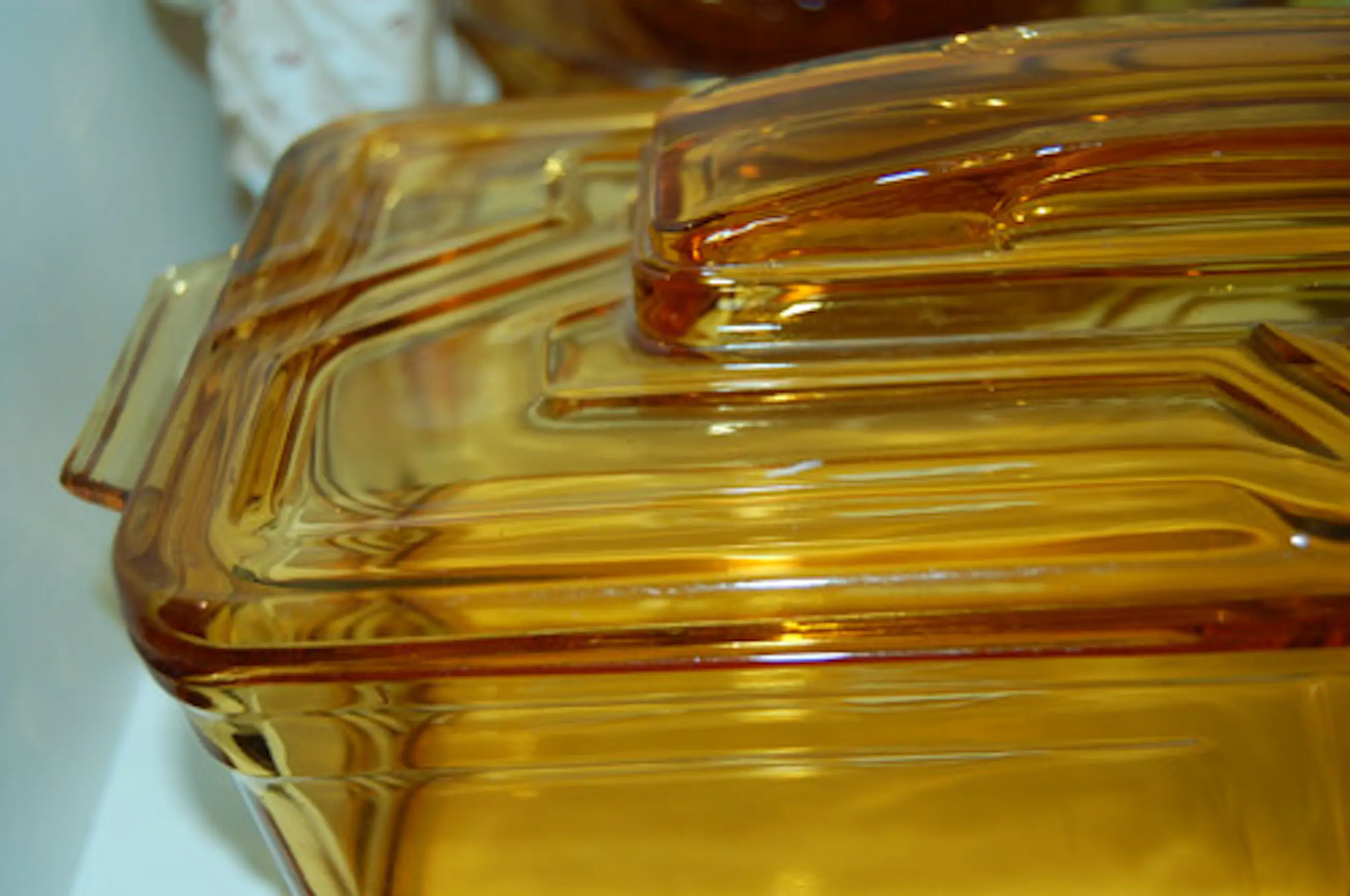 Zeldzame persglazen koek- of cake doos Uitvoering: Kristalunie Maastricht Kleur: Okergeel/amber Periode: Art Deco Afmeting: 28 x 12 x 10 cm Jaar: ca 1930 Conditie: puntgaaf