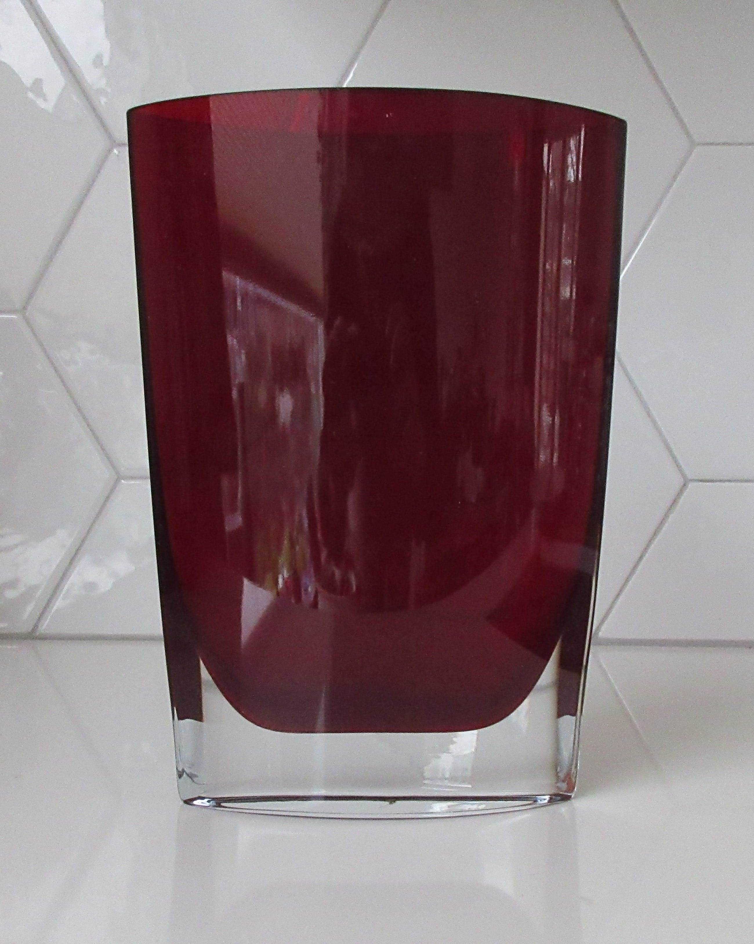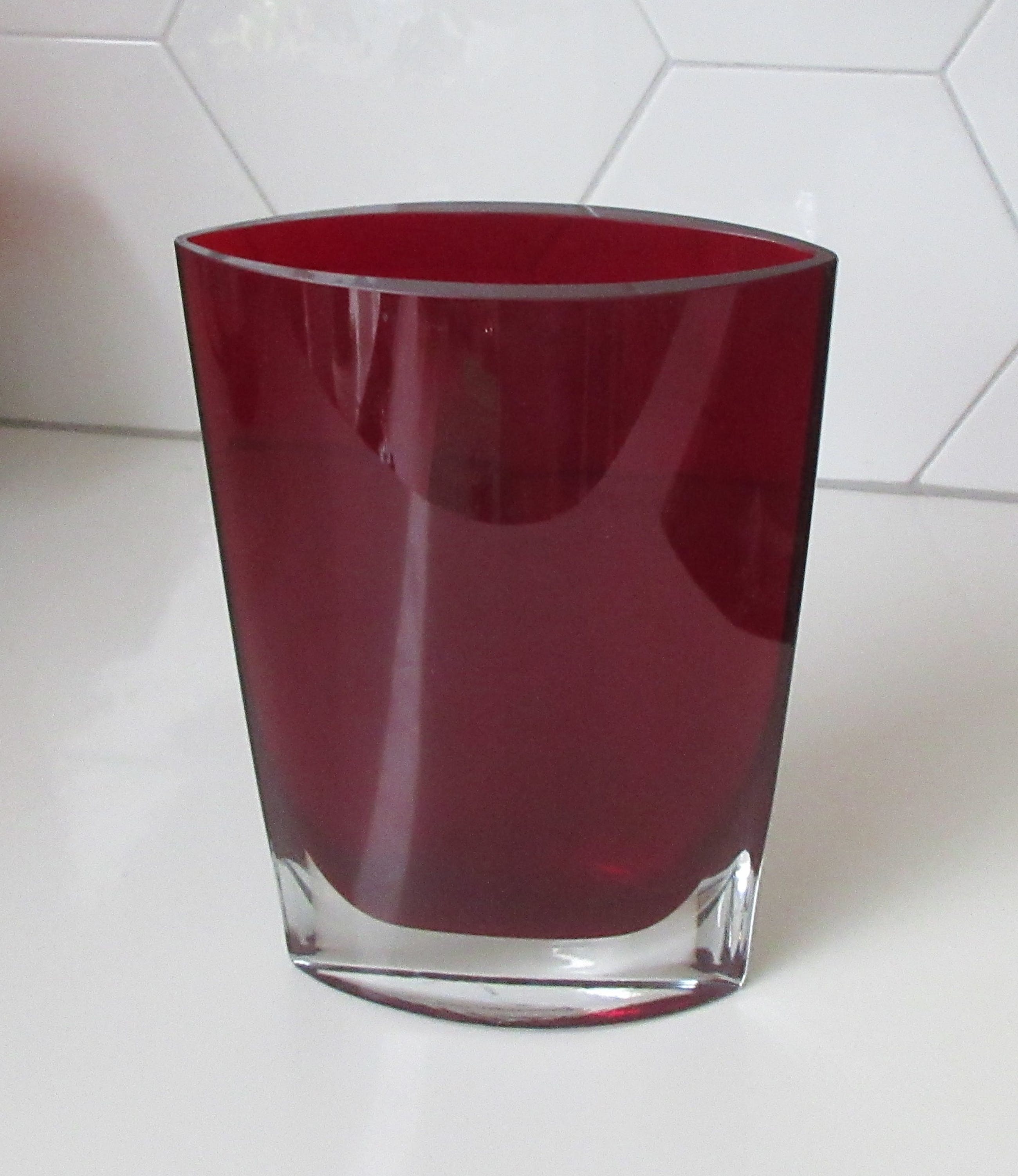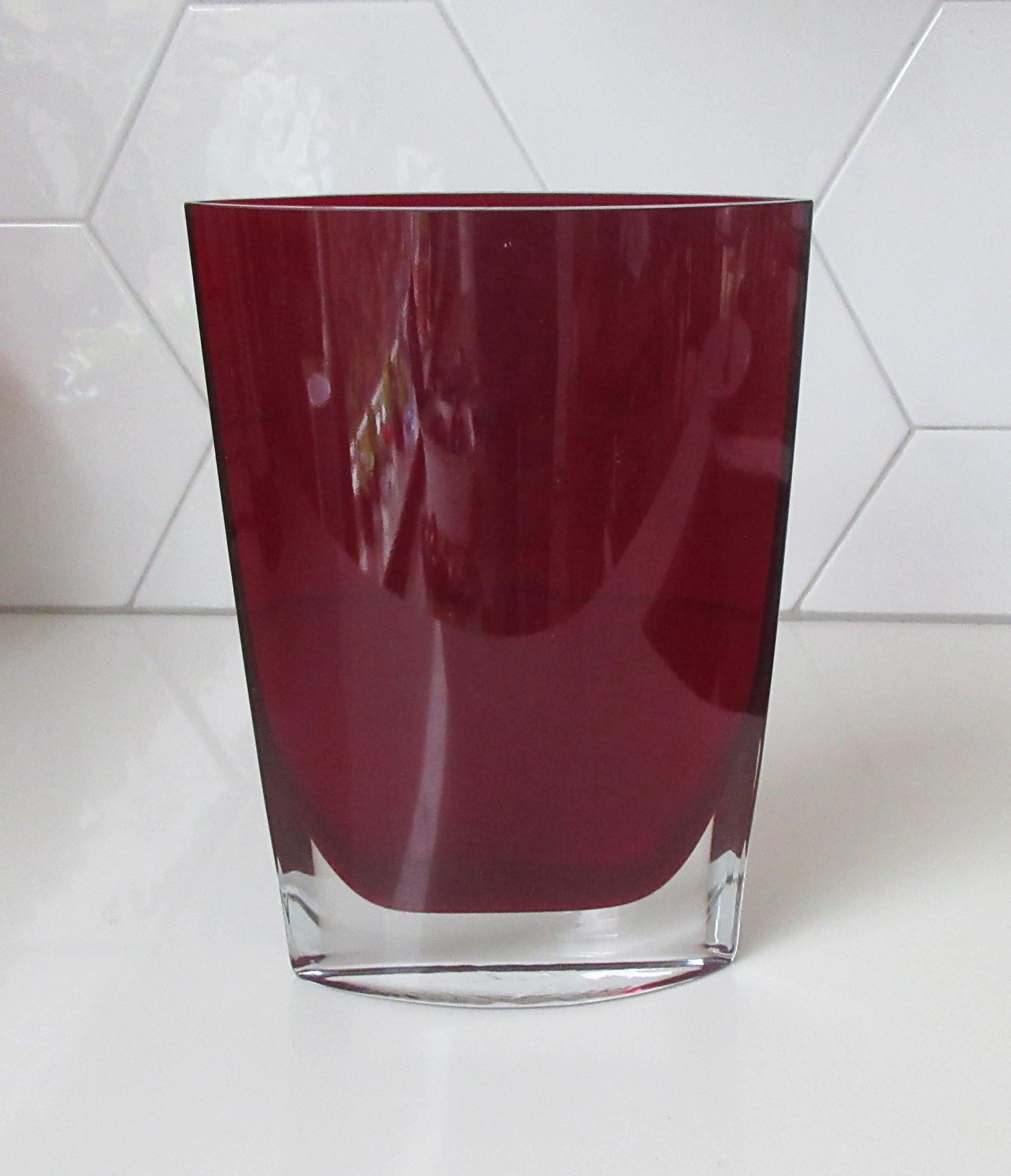 Dieprode ovale kristallen vaas van Krosno uit Polen. In prima conditie. Niet gemerkt wel voorzien van geploijste pontil merk.