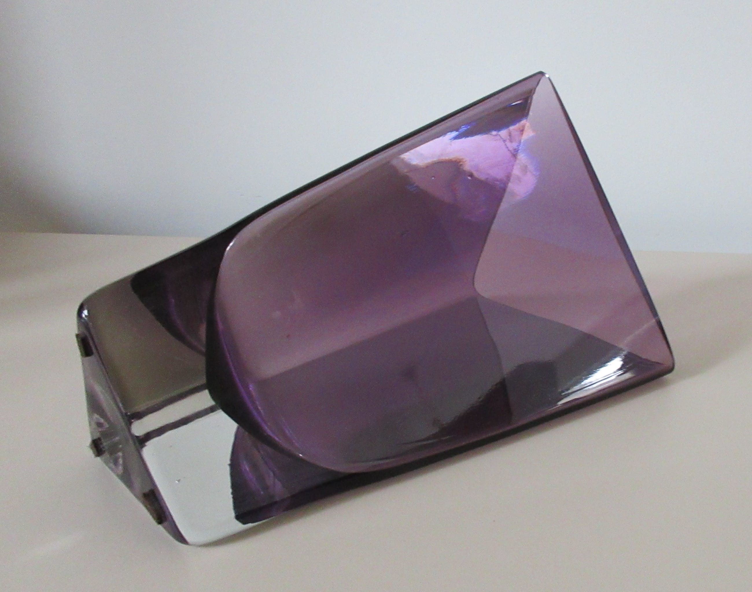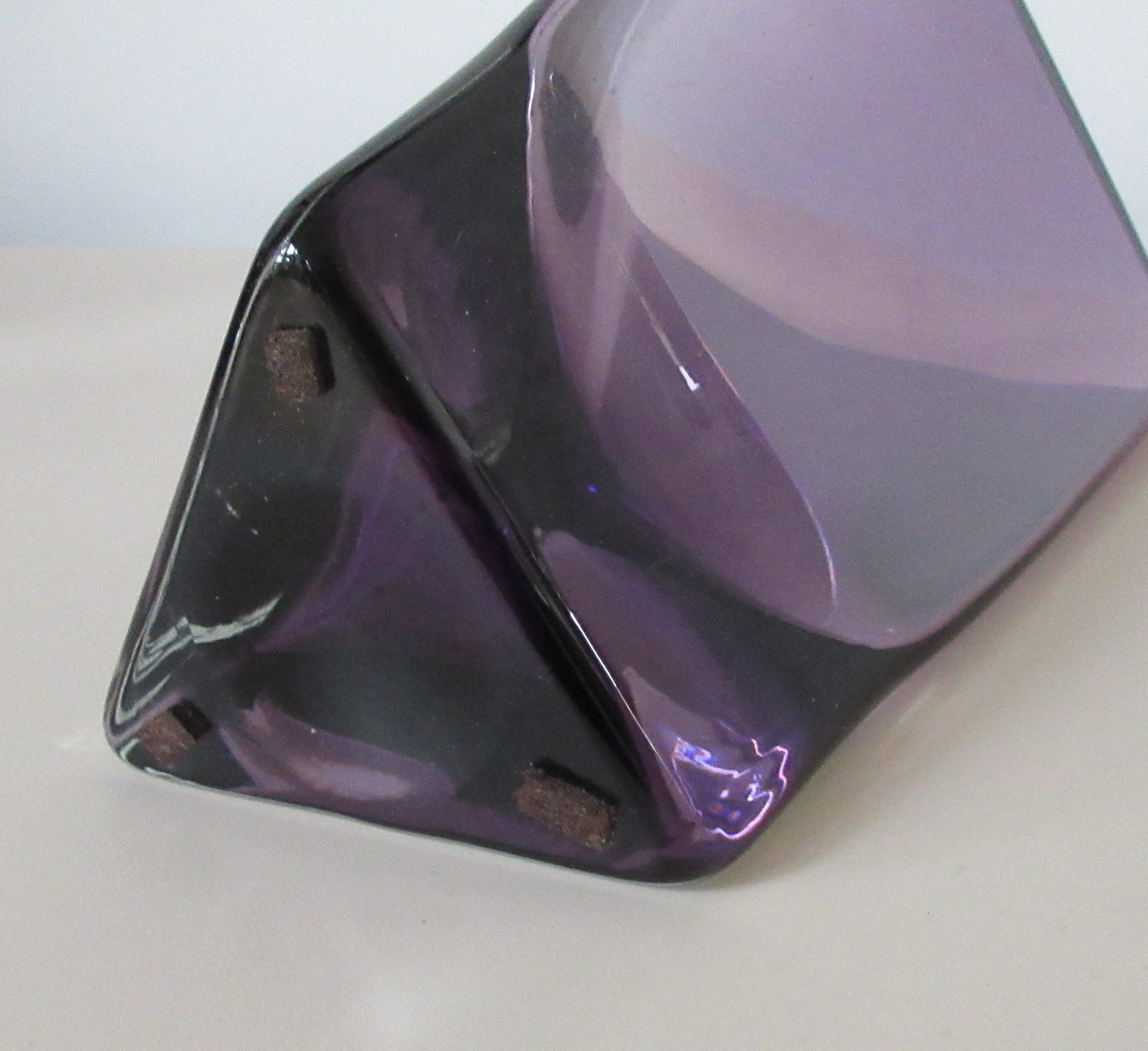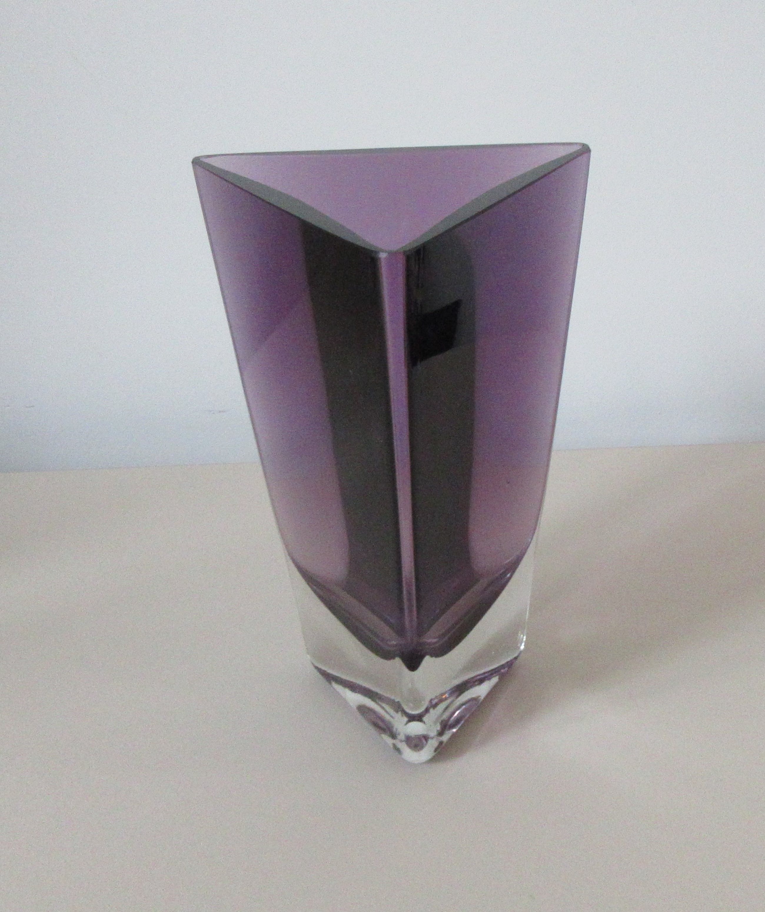 Dubbelwandige paarse en blank glazen driehoek vaas van Krosno uit Polen. Ongemerkt. In perfecte conditie.