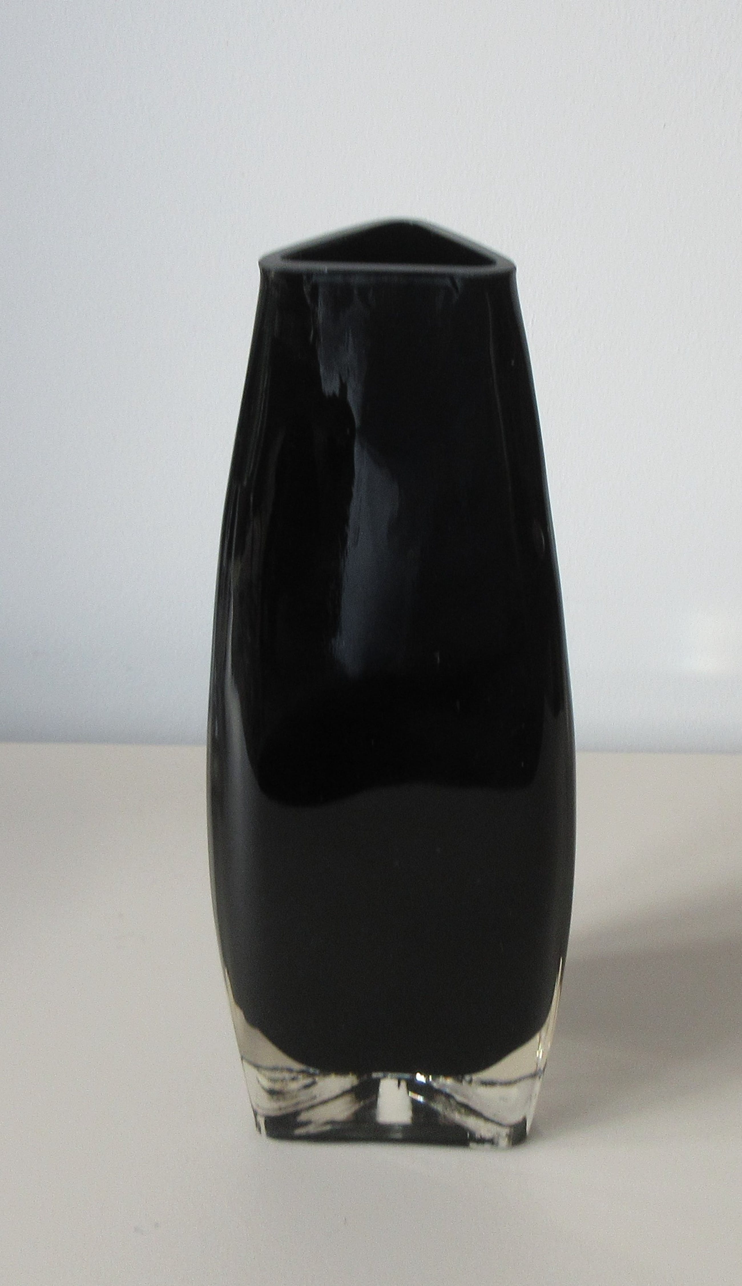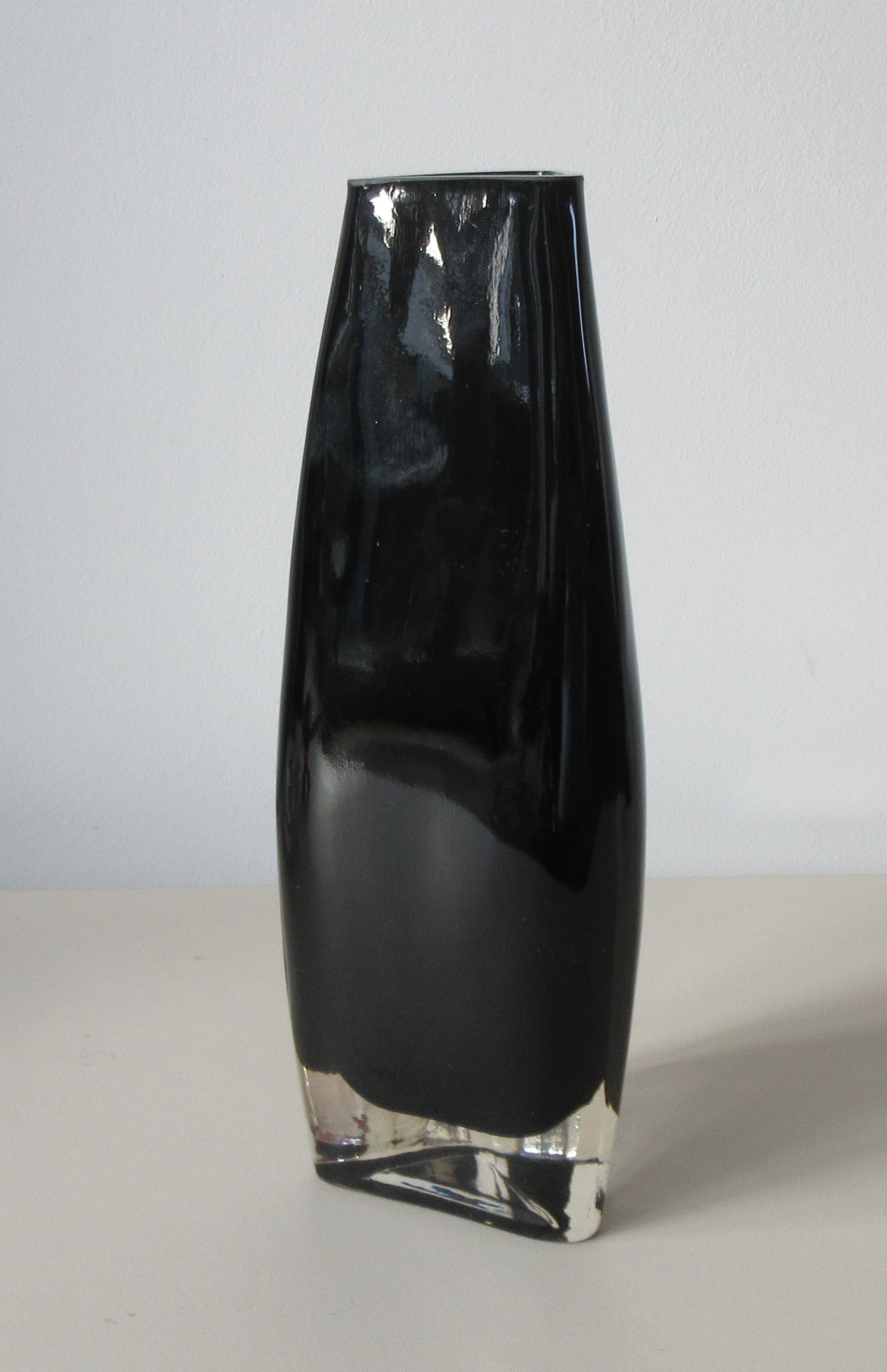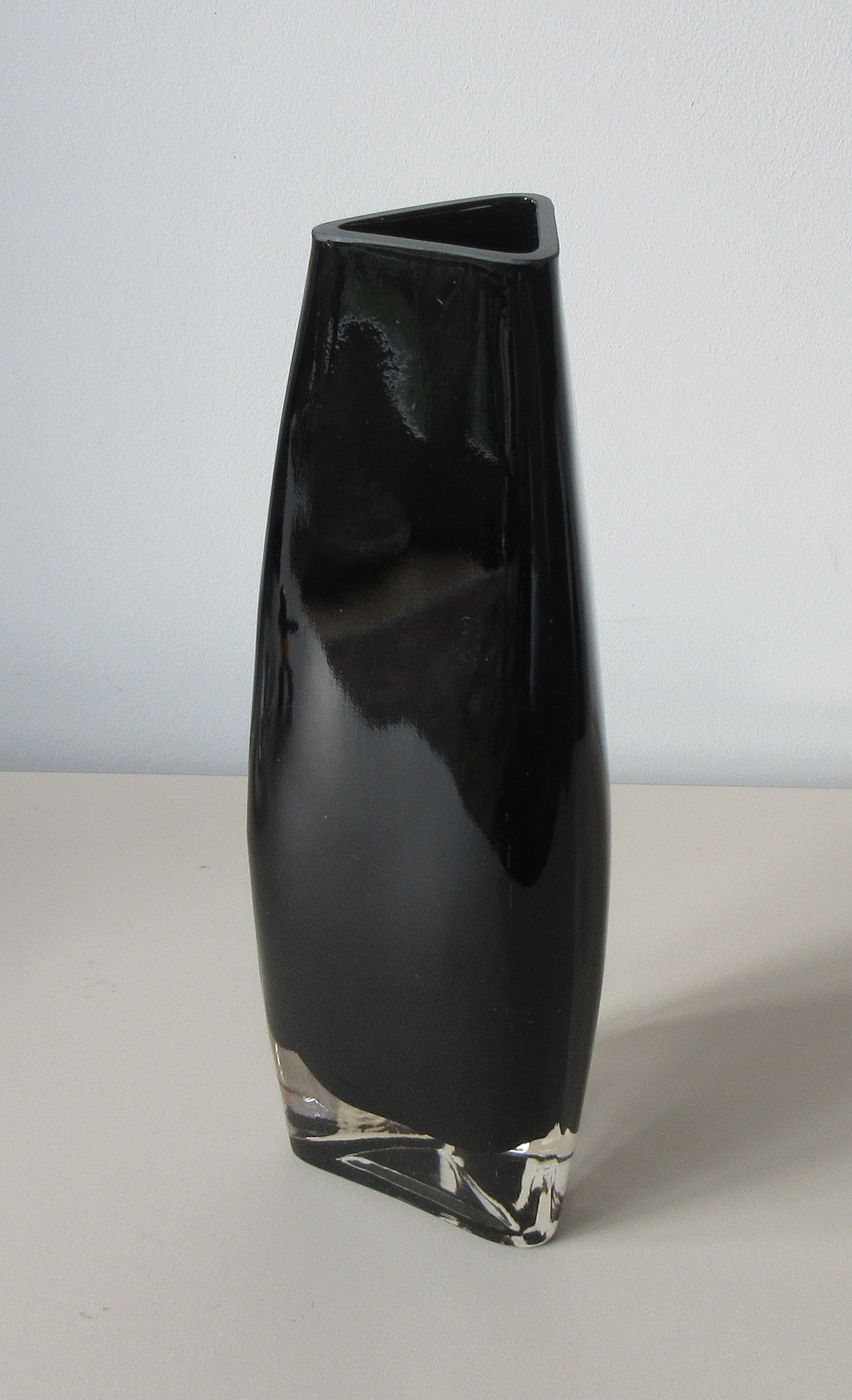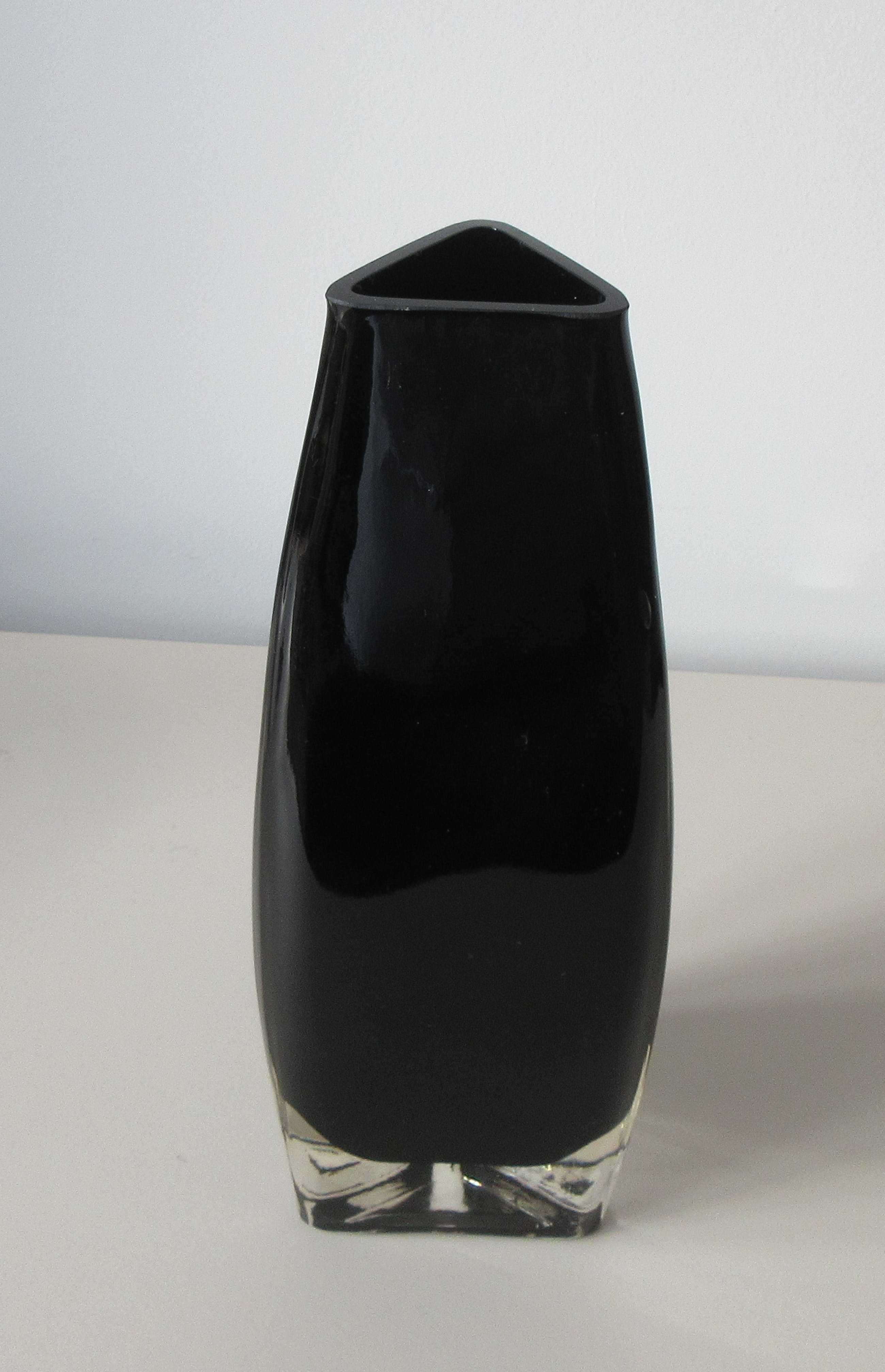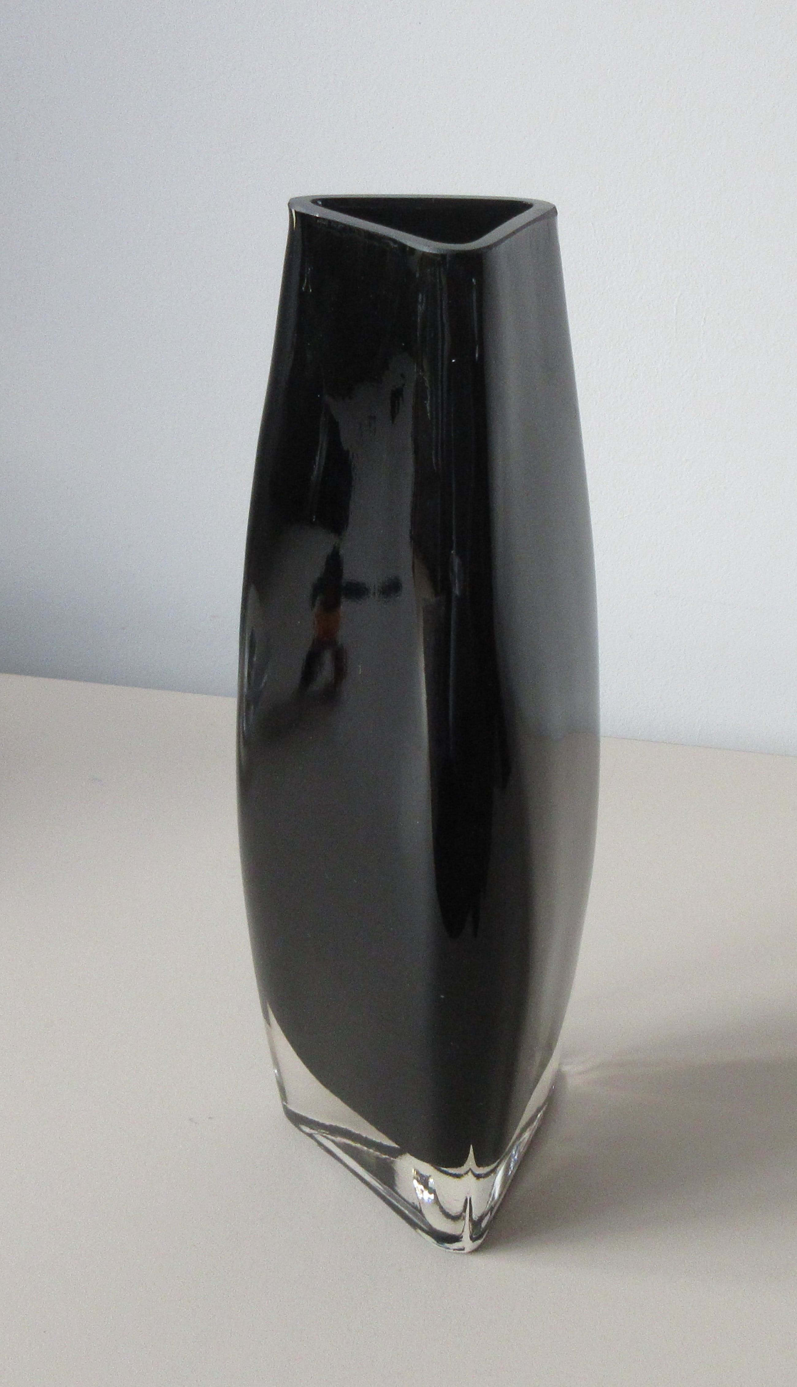 Dubbelwandige zwart en blank glazen Triangel vaas van Krosno uit Polen. Niet gemerkt. In zeer goede conditie, heeft een luchtbelletje in het glas.