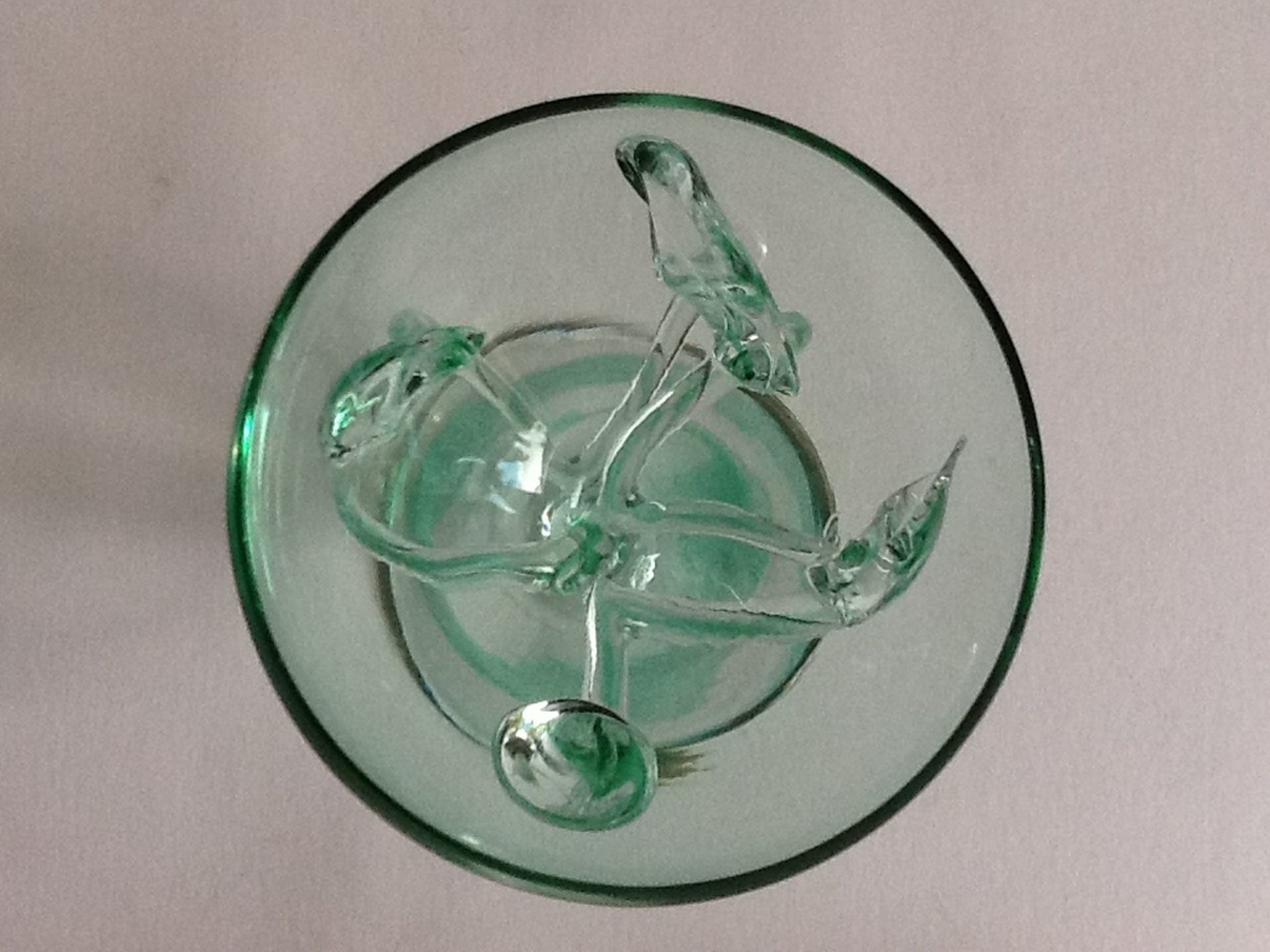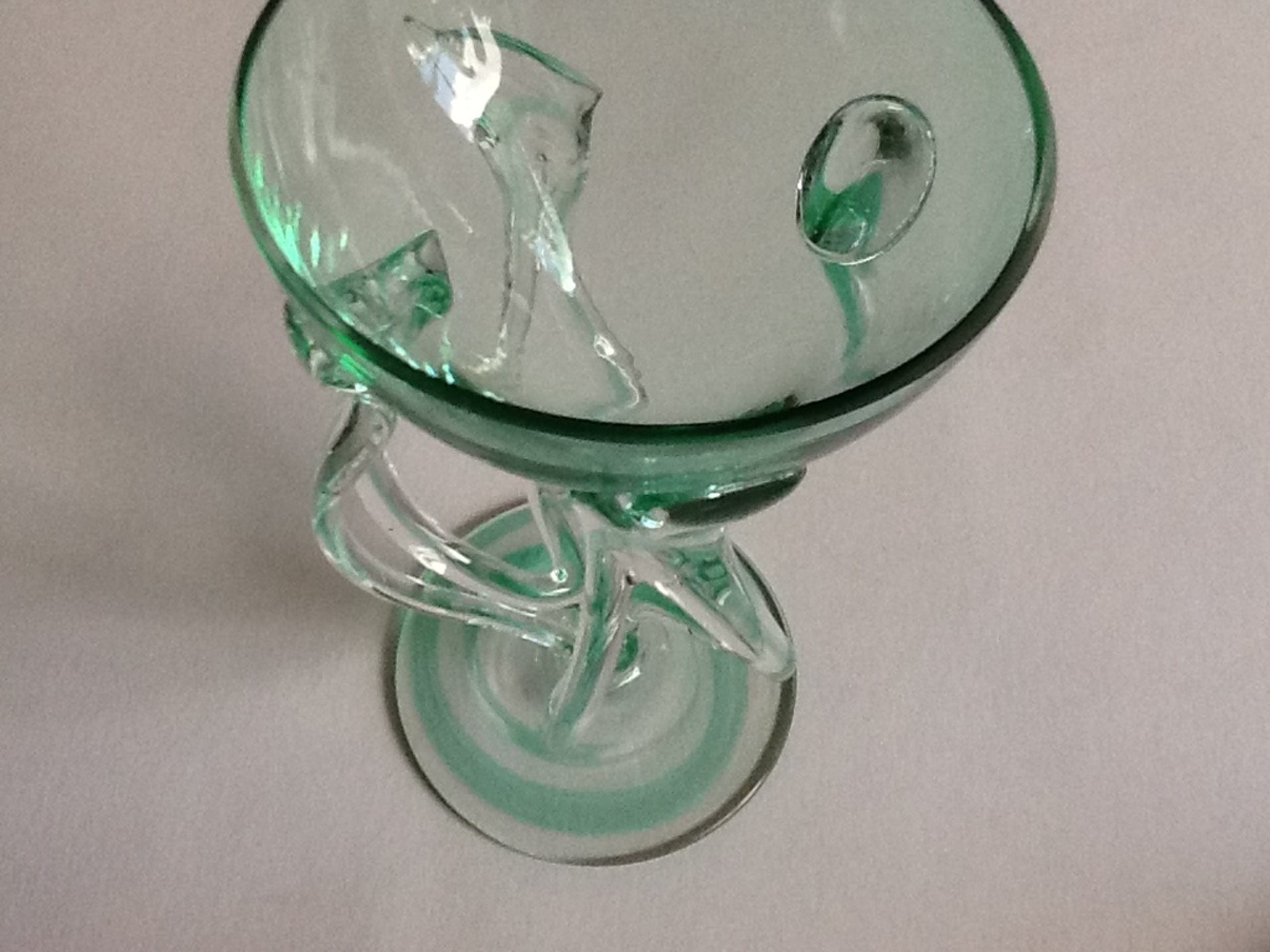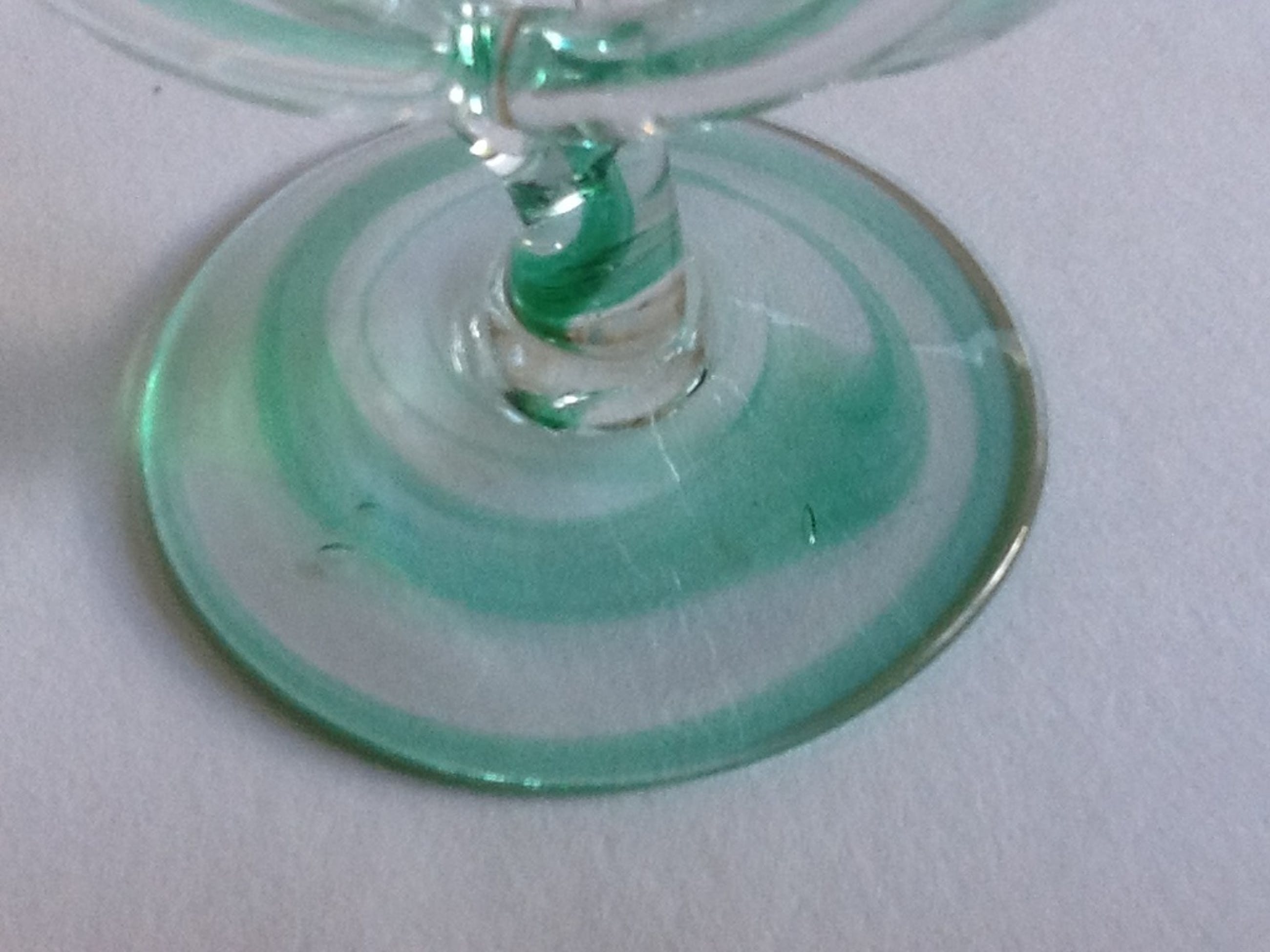 de kleur is licht zeegroen. De bokaal heeft geen beschadigingen, in de voet zitten drie kleine luchtbelletjes (zie foto)