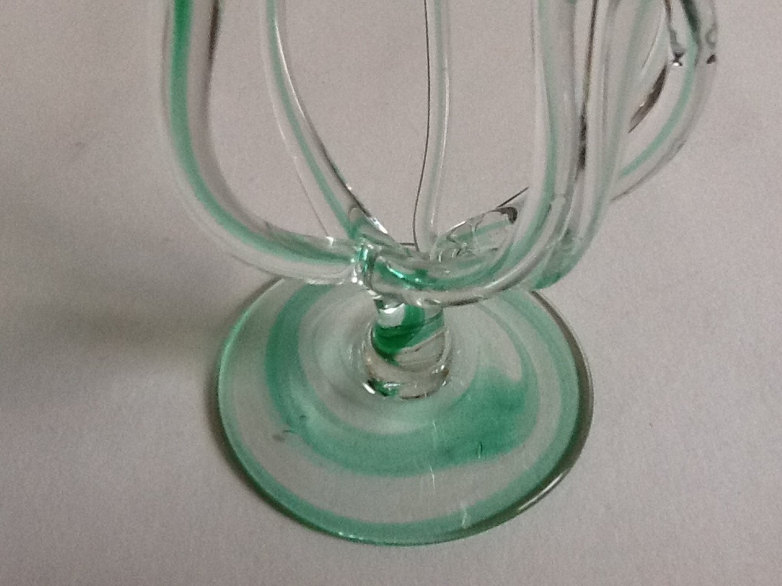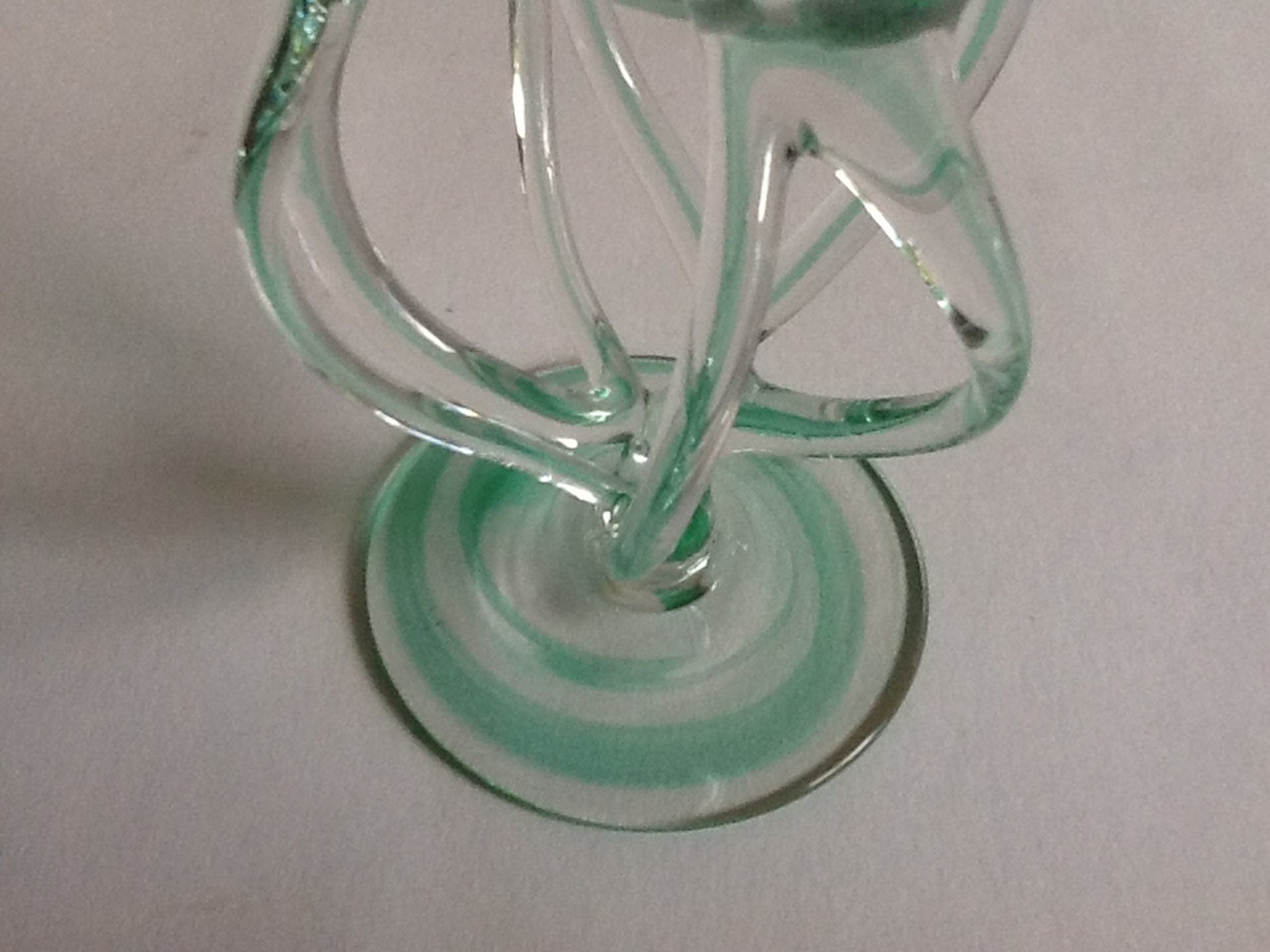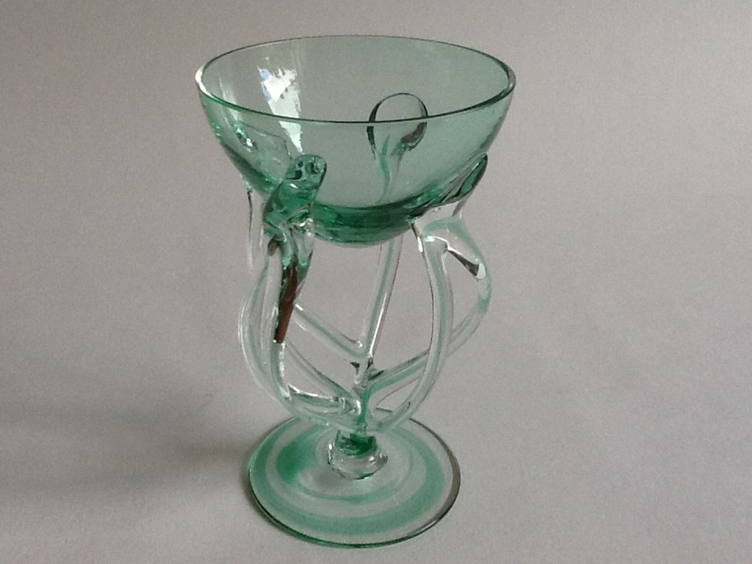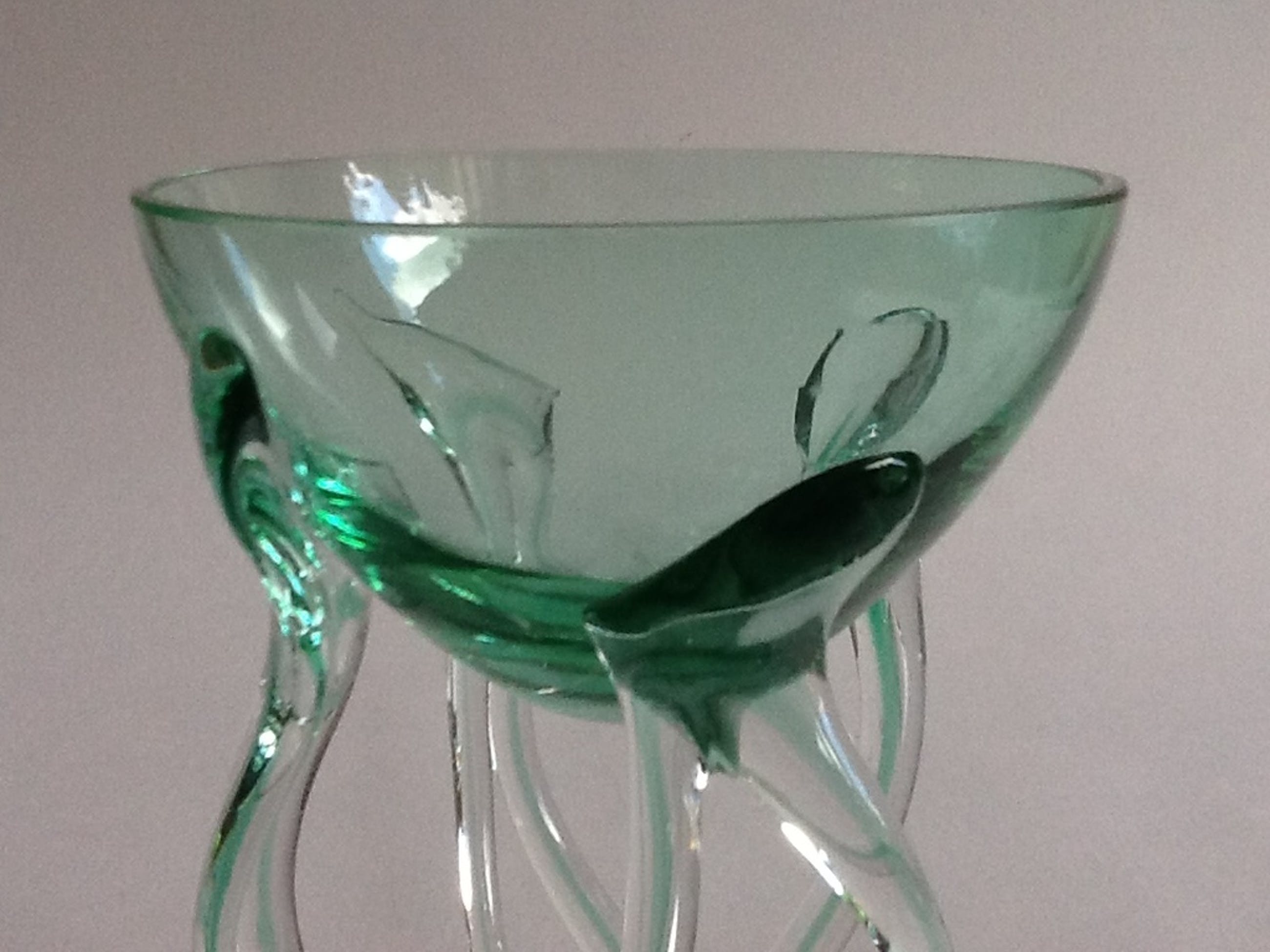 de kleur is licht zeegroen. De bokaal heeft geen beschadigingen, in de voet zitten drie kleine luchtbelletjes (zie foto)