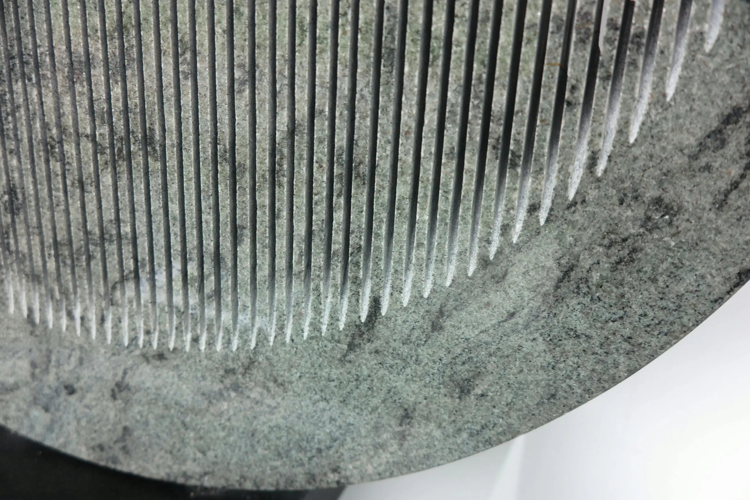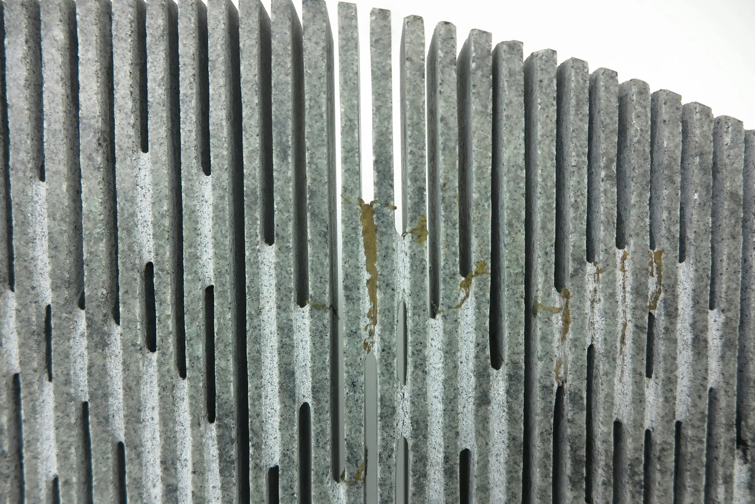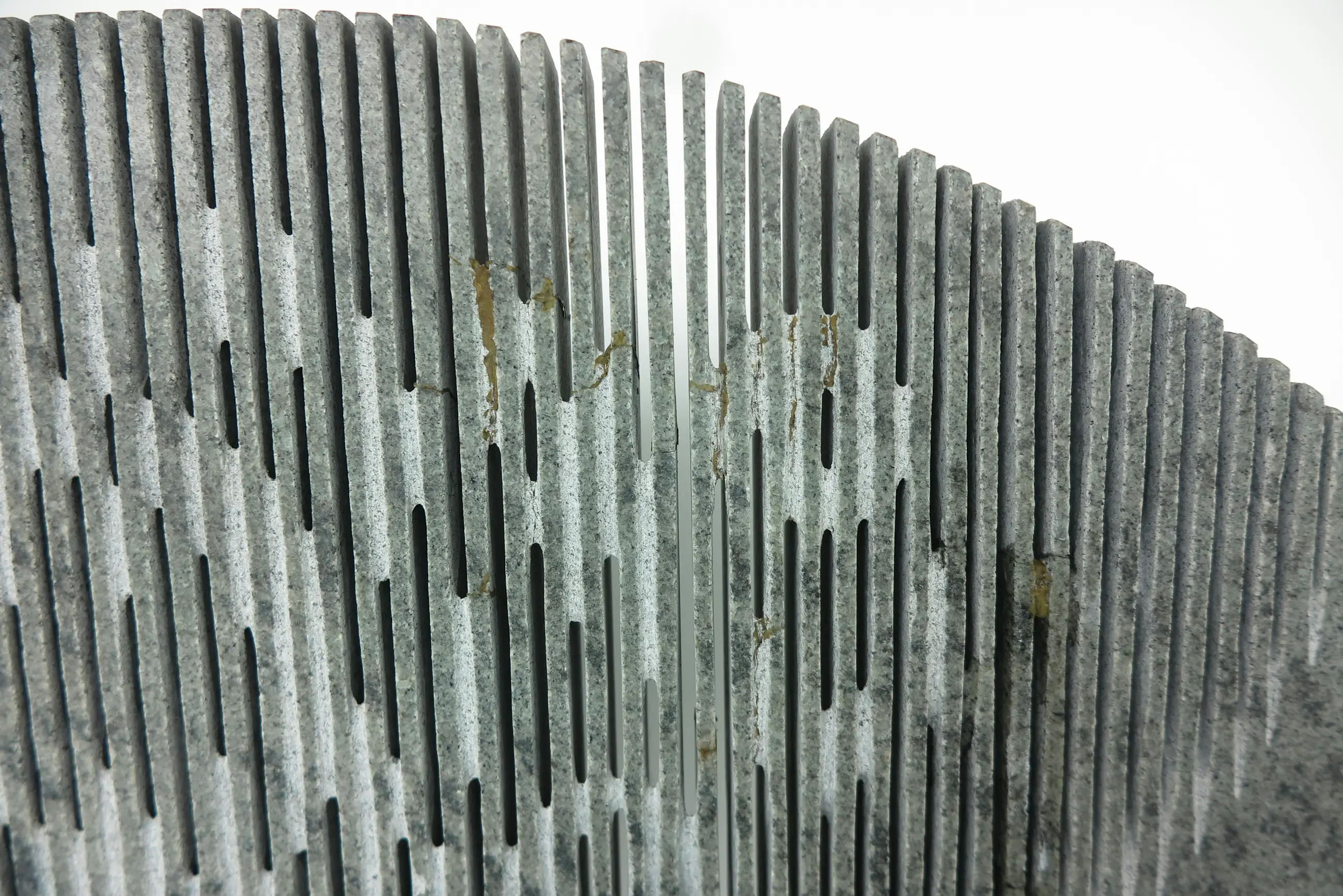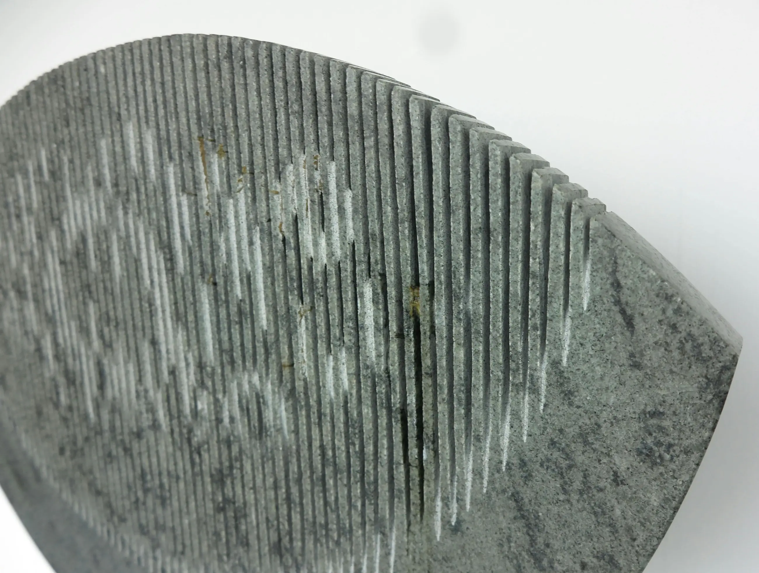 | Stukjes van de 'zaagtanden' zijn in het verleden afgebroken geweest en weer gelijmd. Zodoende lijken er wat lijmresten zichtbaar en wat scheurrandjes. Stickerresten op de voet. Het beeld staat met schroefpinnen in de voet. Bij deze gaten zijn wat kleine stukjes afgebrokkeld. | |