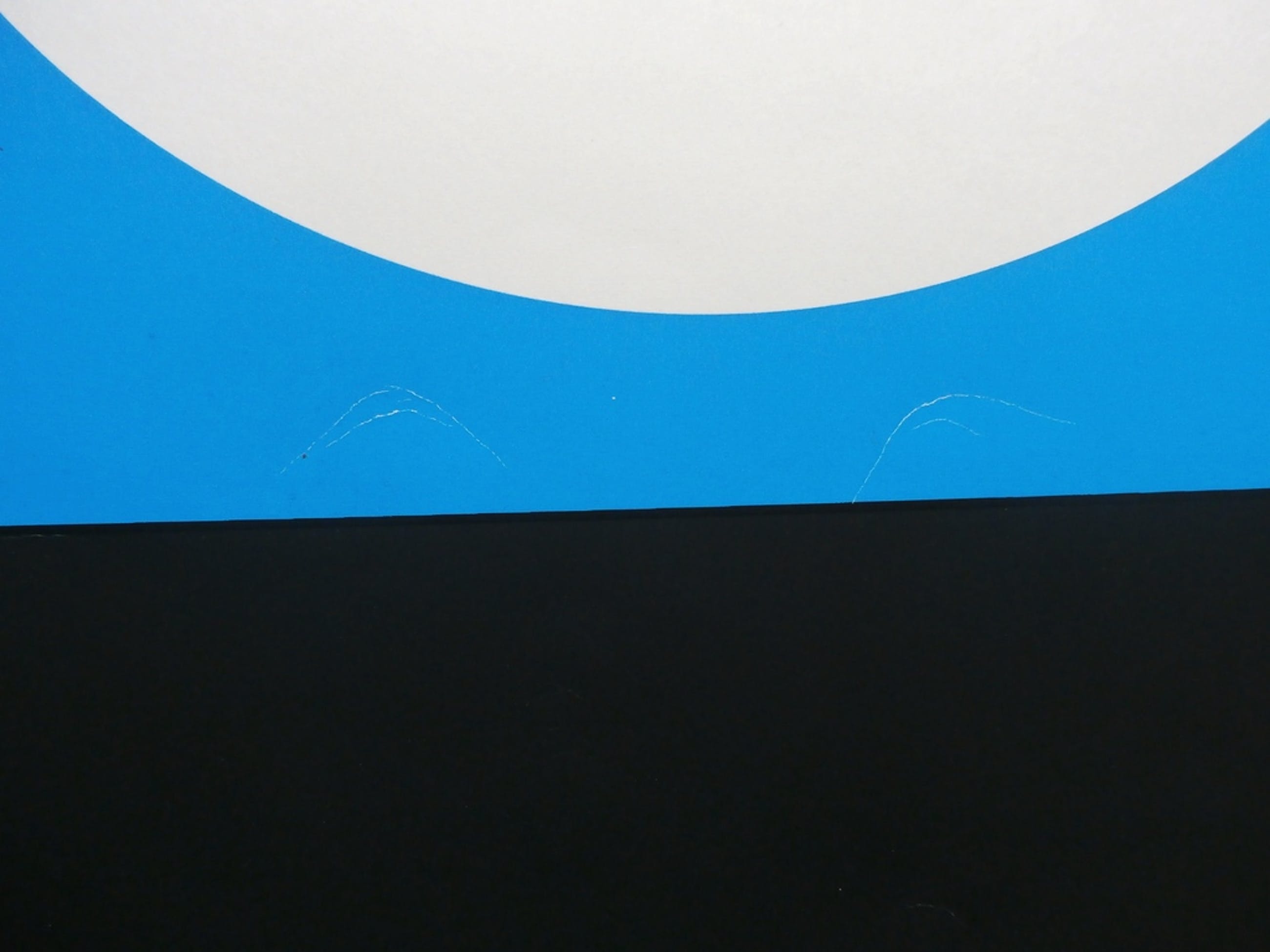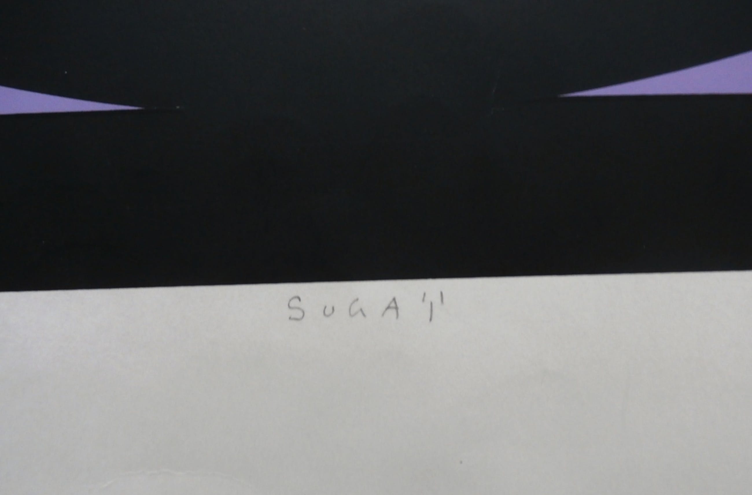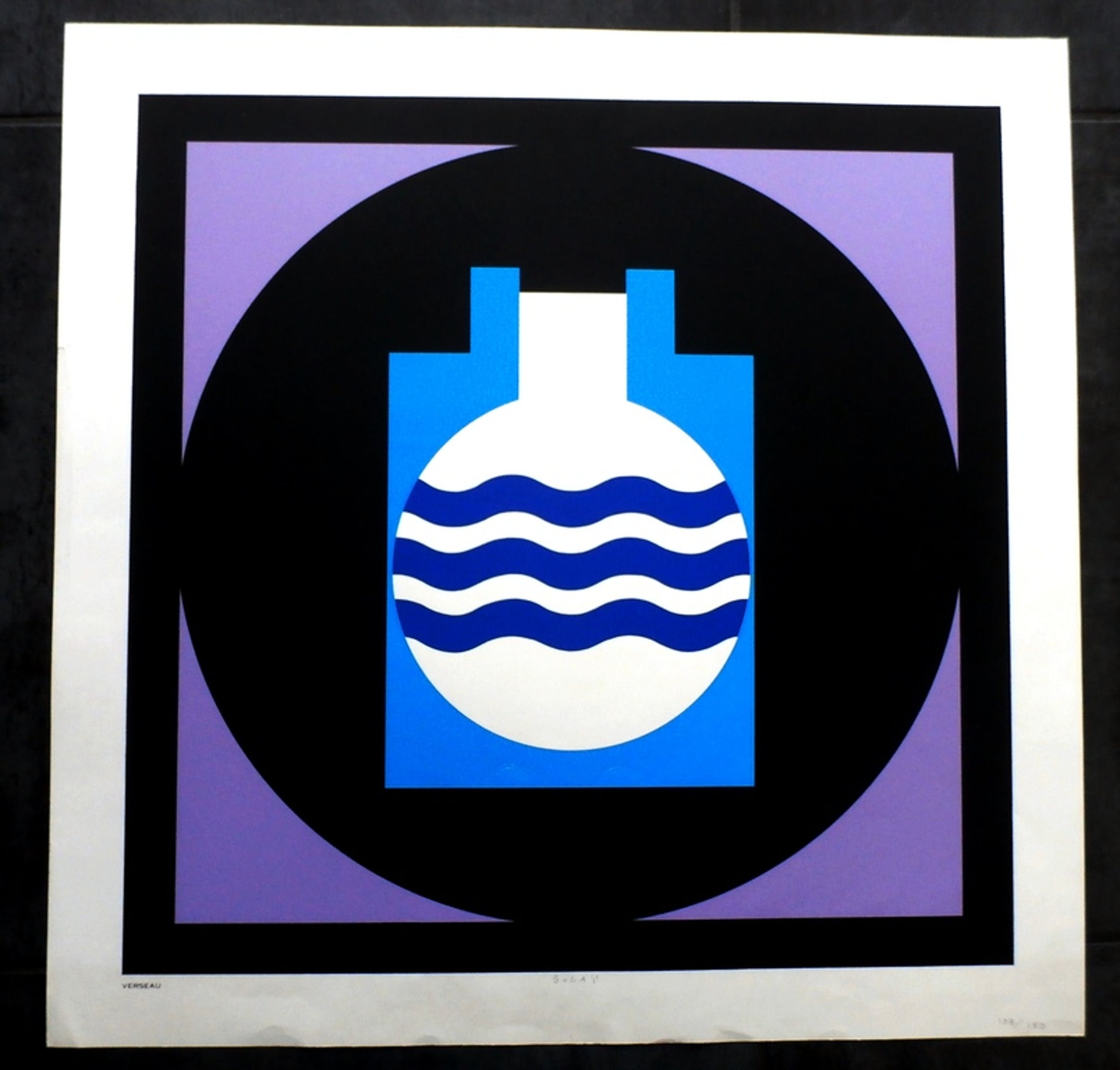Zeefdruk van Kumi Sugai. Nummer: 108/150. Titel: Verseau. Het werk is middenonder gesigneerd. Afmetingen werk: H70 x b70 cm. Conditie: in goede staat. Bij het nummer zit een kleine kreukel in het papier. In het blauwe vlak zit ook een kleine beschadiging.