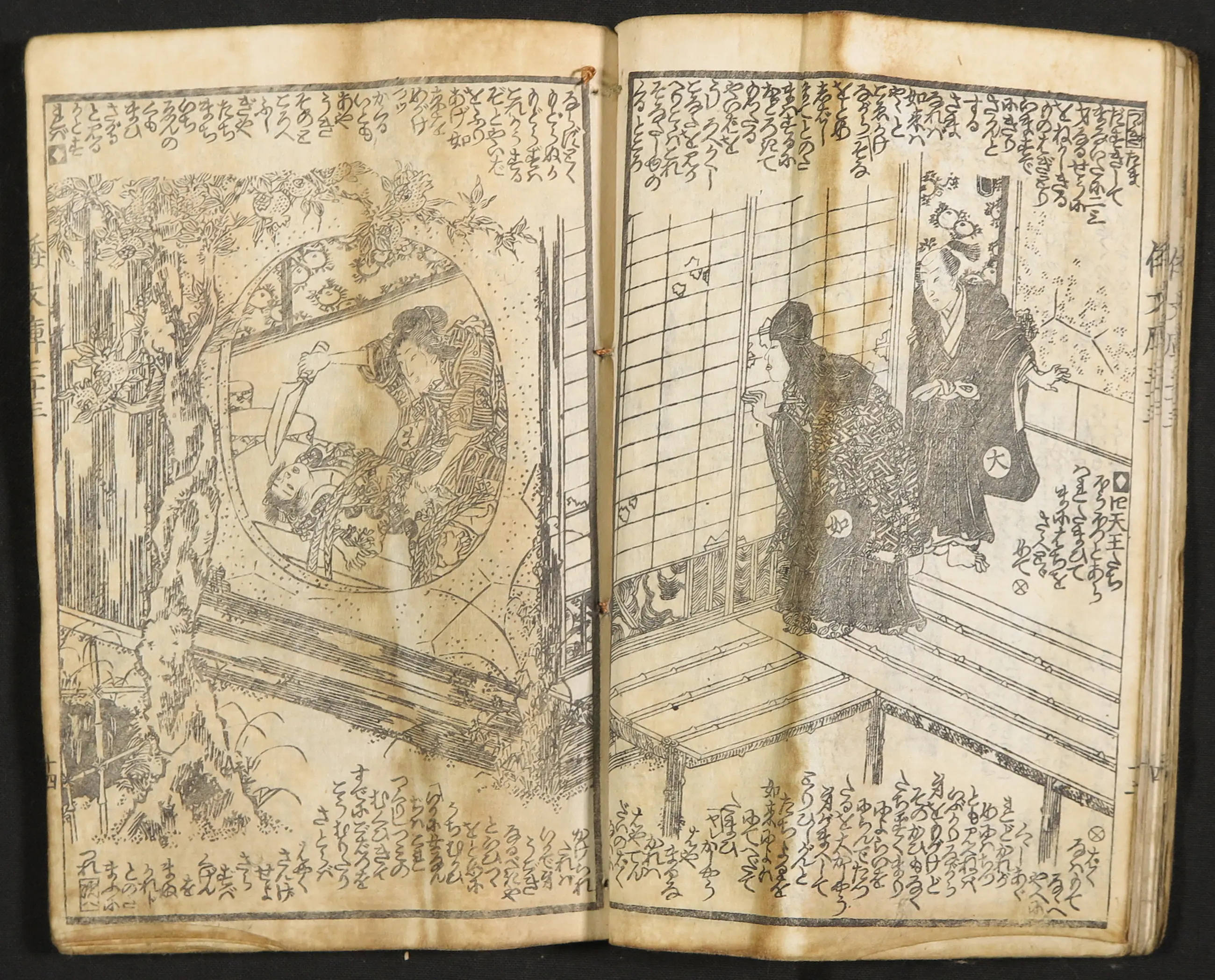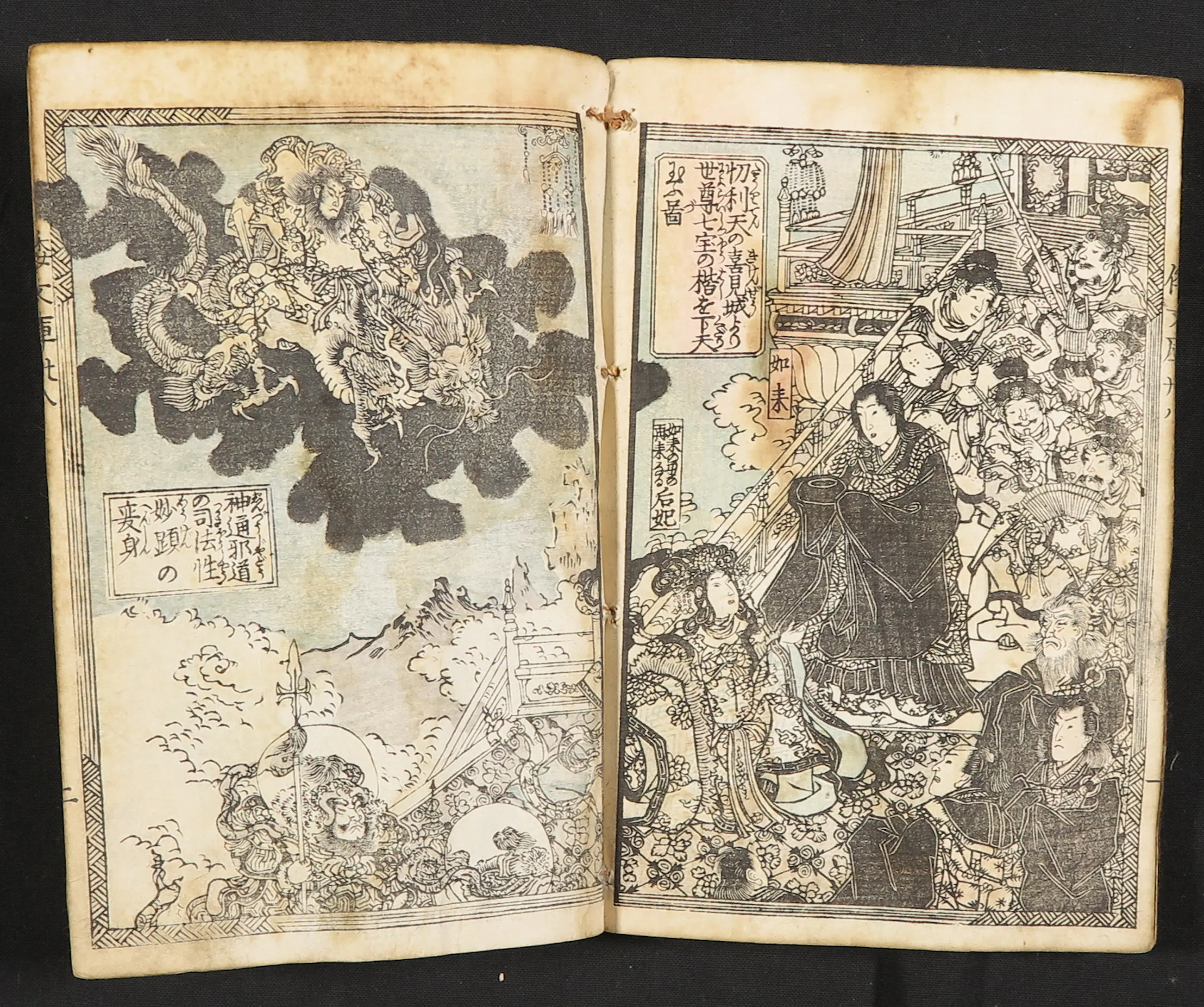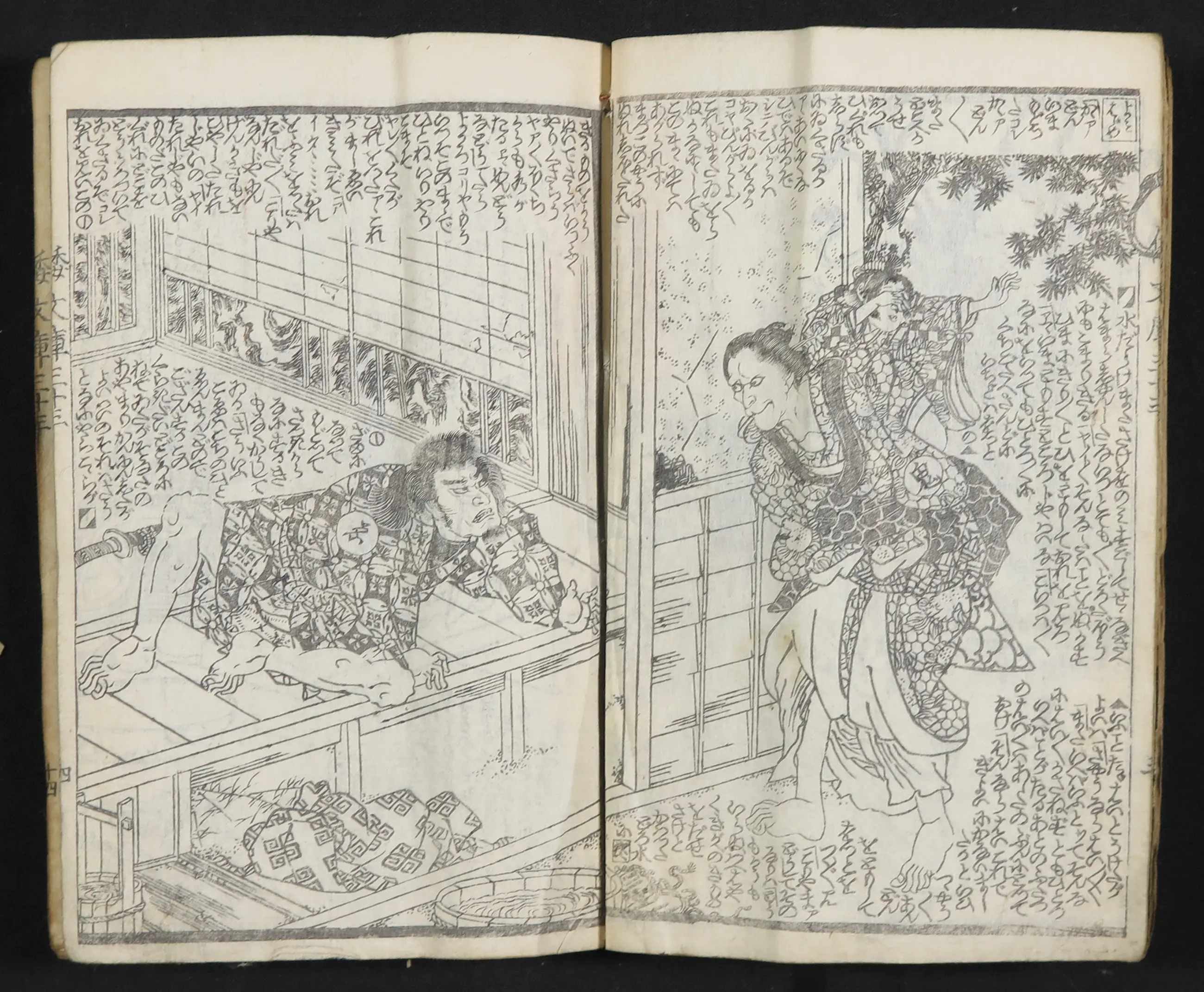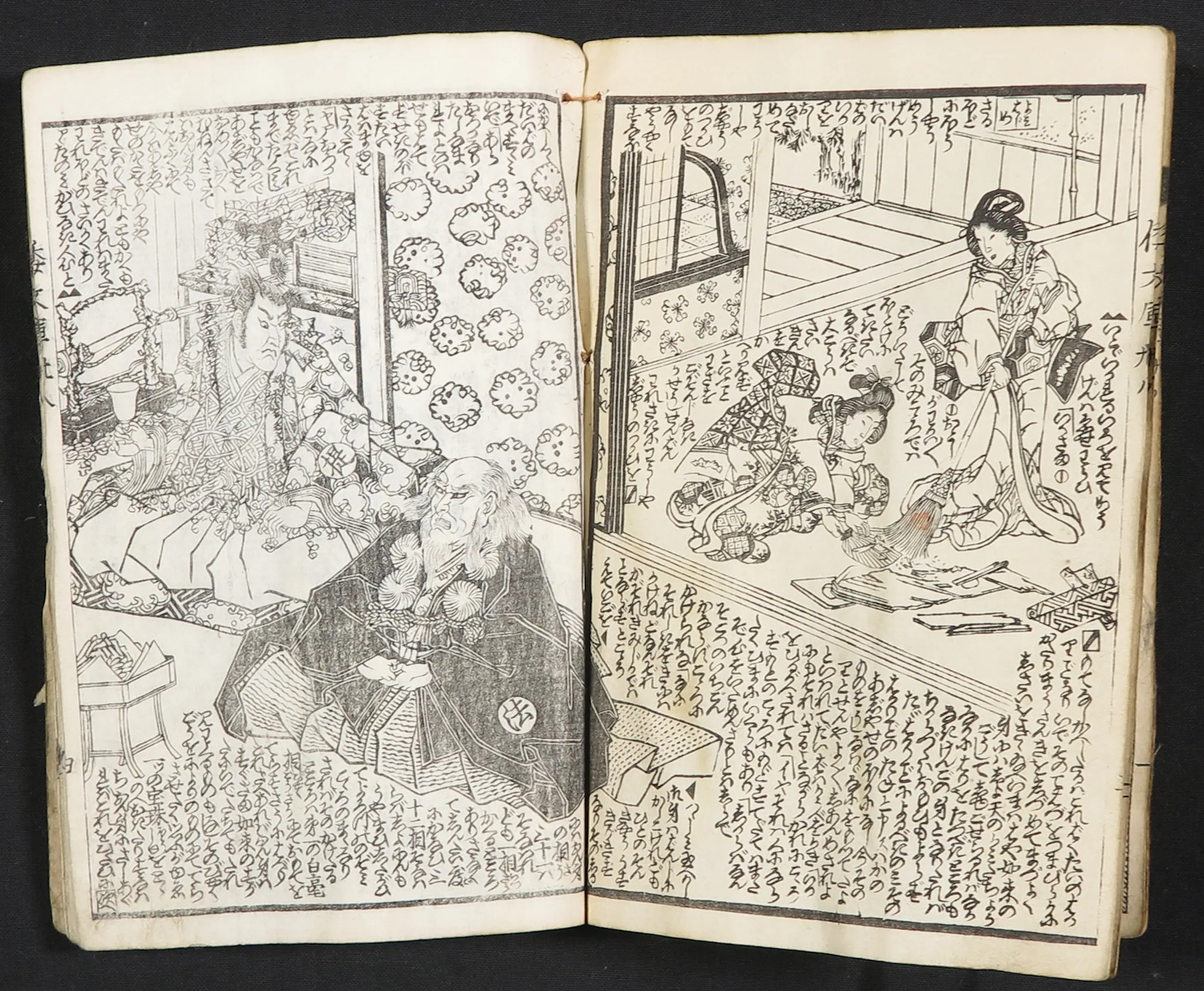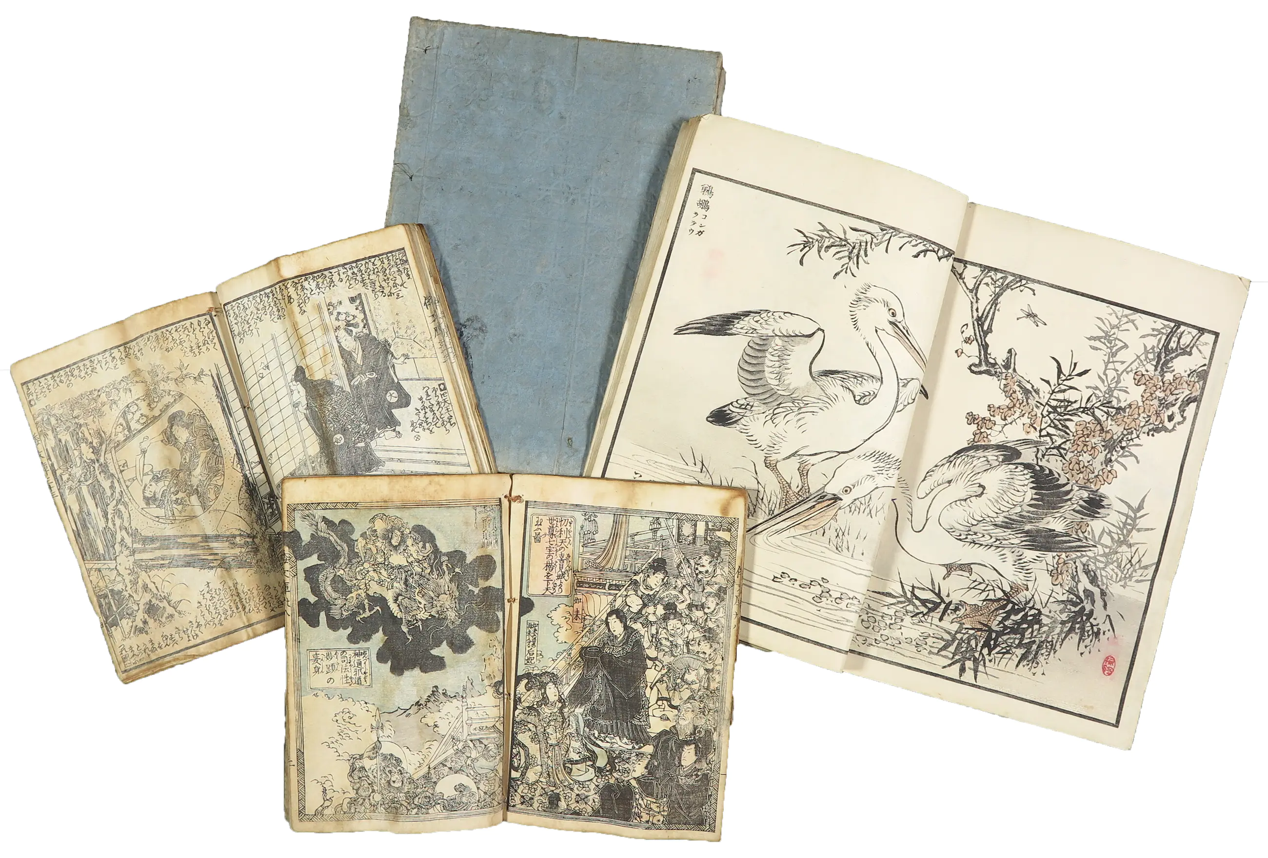 Lot van vier boekjes. De twee kleine zijn van Kunisada Utagawa, de twee andere (grote) zijn van onbekende makers. Drie boekjes zijn voorzien van prenten en tekst, één boekje bevat enkel tekst.