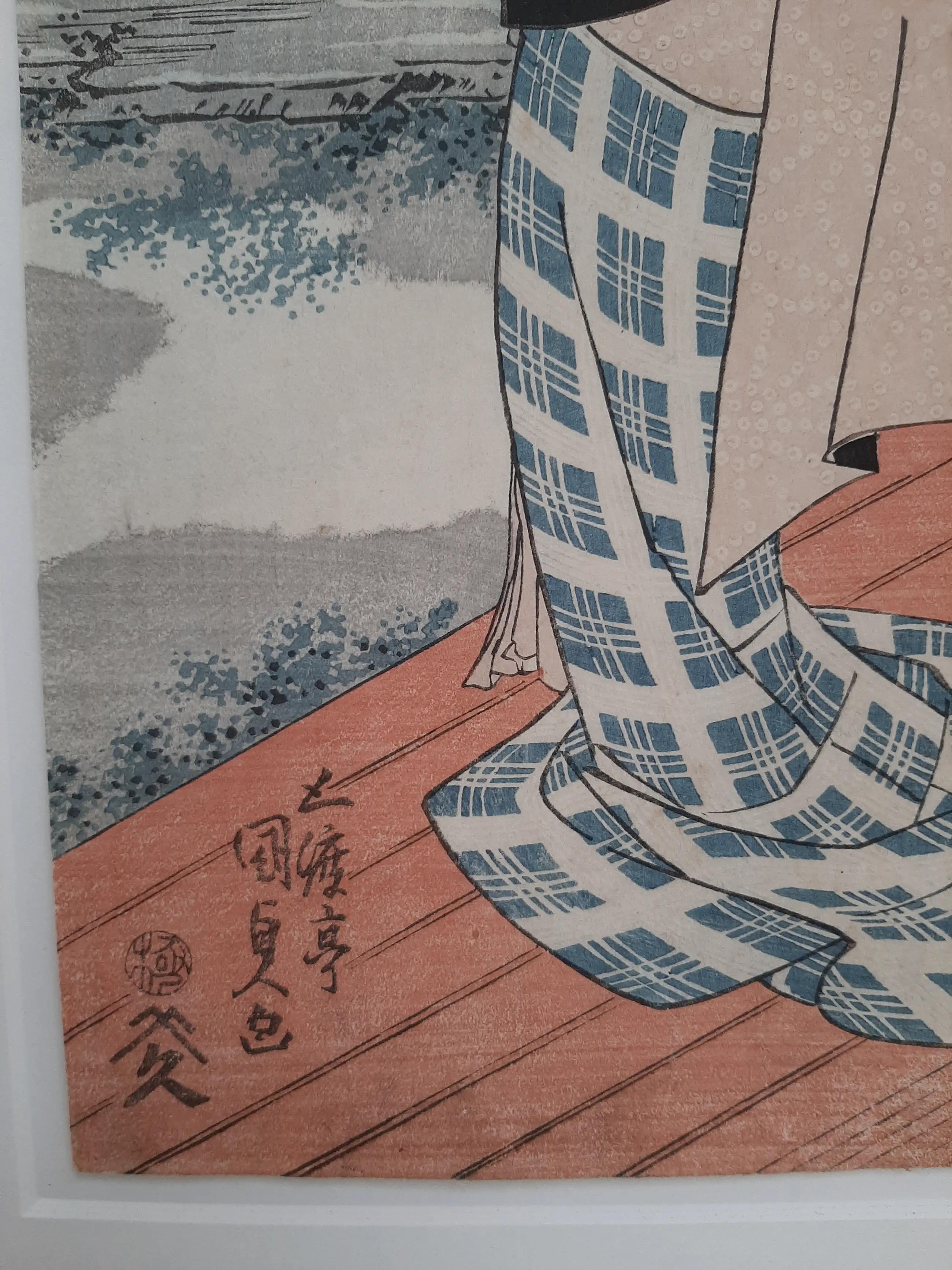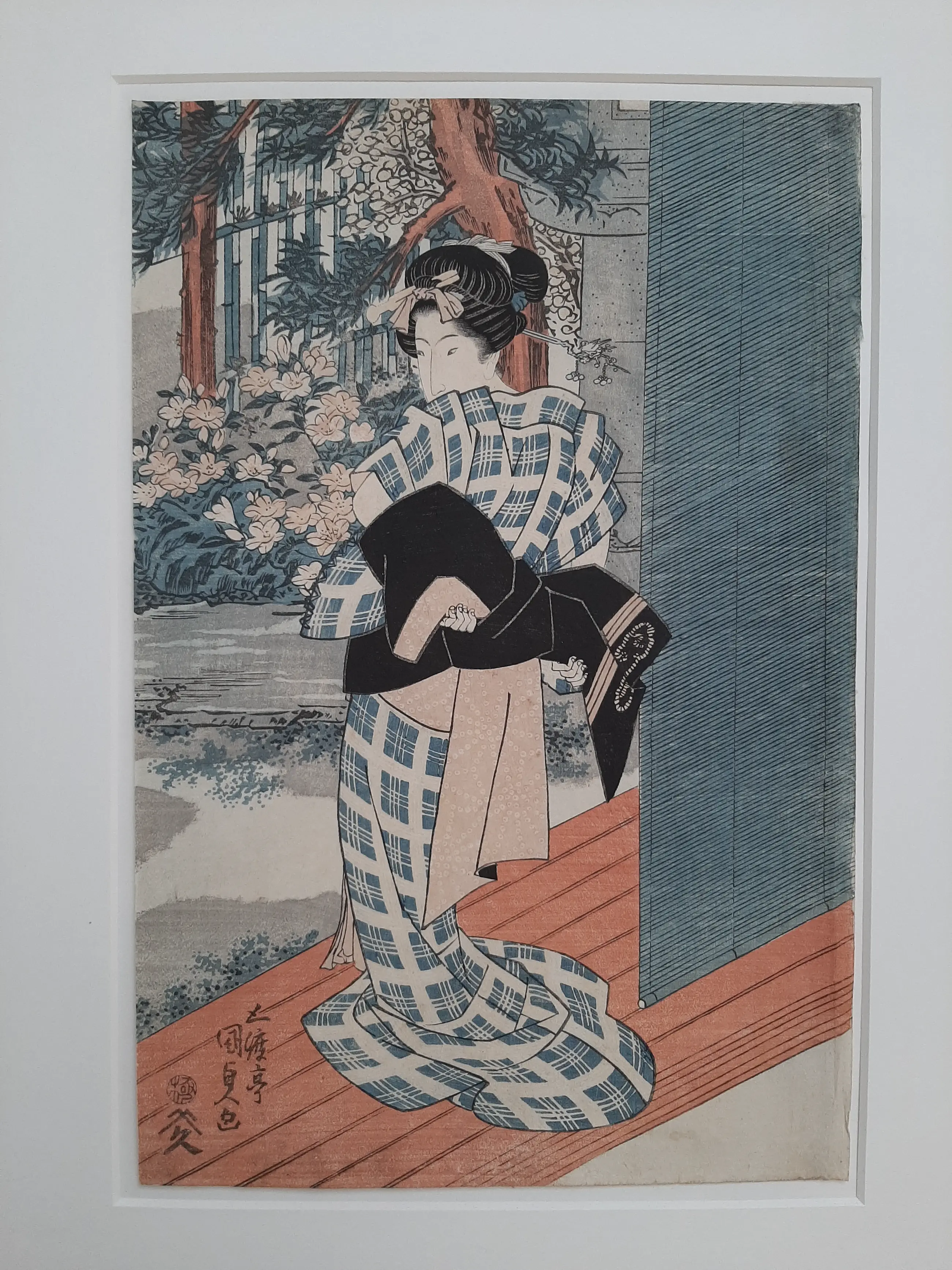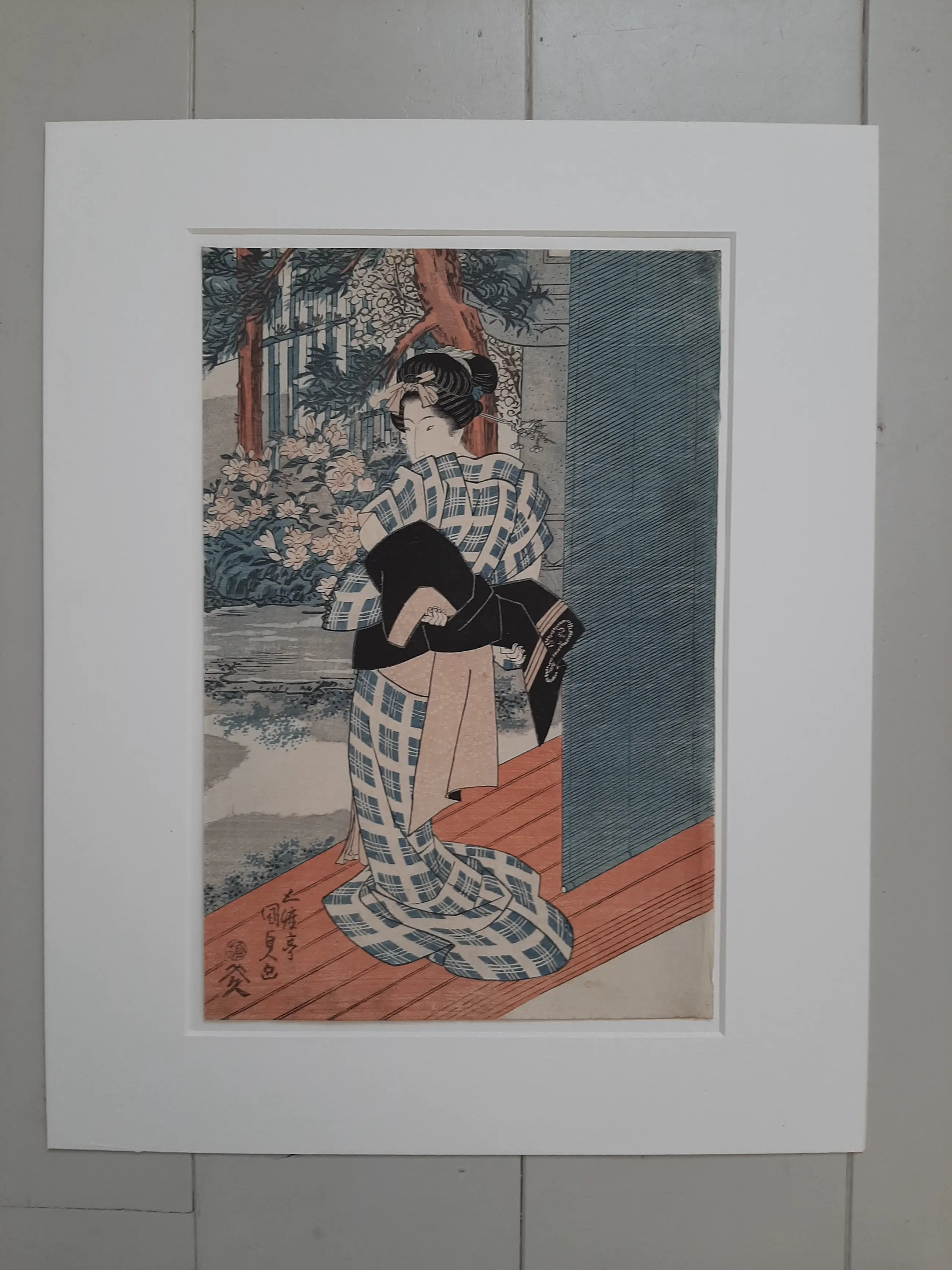 Deze houtsnede van een staande vrouw in kimono met zwarte strik was een onderdeel van drieluik van Utagawa Kunisada, waarschijnlijk uit 1824/25.