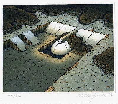 Farbradierung ISEKI/PY XXX, 1981, 12 x 15 cm auf 23 x 20 cm, Auflage 150 Exemplare, hier die145/150, zusammen mit dem Werkverzeichnis aller Radierungen Kunito Nagaokas von 1971 ? 1981. Mit Texten zur Biografie und zur Werkentwicklung von Marina Dinkler sowie eigenen Texten von Kunito Nagaoka. 132 Seiten, 106 ganzseitige Abbildungen, davon 60 in Farbe. Alle Abbildungen mit detaillierten Werkangaben. Ausklappbares Register. Alle Texte in Deutsch und Englisch. Format 24 x 21 cm, gebunden, mit Schutzumschlag. Die Radierung ist tadellos erhalten, der Schutzumschlag des Buches hat leichte Gebrauchsspuren. Versandkosten innerhalb Europas ? 5,00. Kunito Nagaoka ist einer der international herausragenden Grafiker der 70er-Jahre, Preisträger und Jurymitglied vieler wichtiger Grafikbiennalen. Er hat an der Tama-Universität in Tokyo und der Hochschule der Künste in Berlin studiert und hat heute eine Professur an der Seika-Universität in Kyoto. Viele seiner Arbeiten sind vergriffen und können nur noch in renommierten Graphischen Sammlungen wie z.B, der Albertina (Wien) gesehen werden.