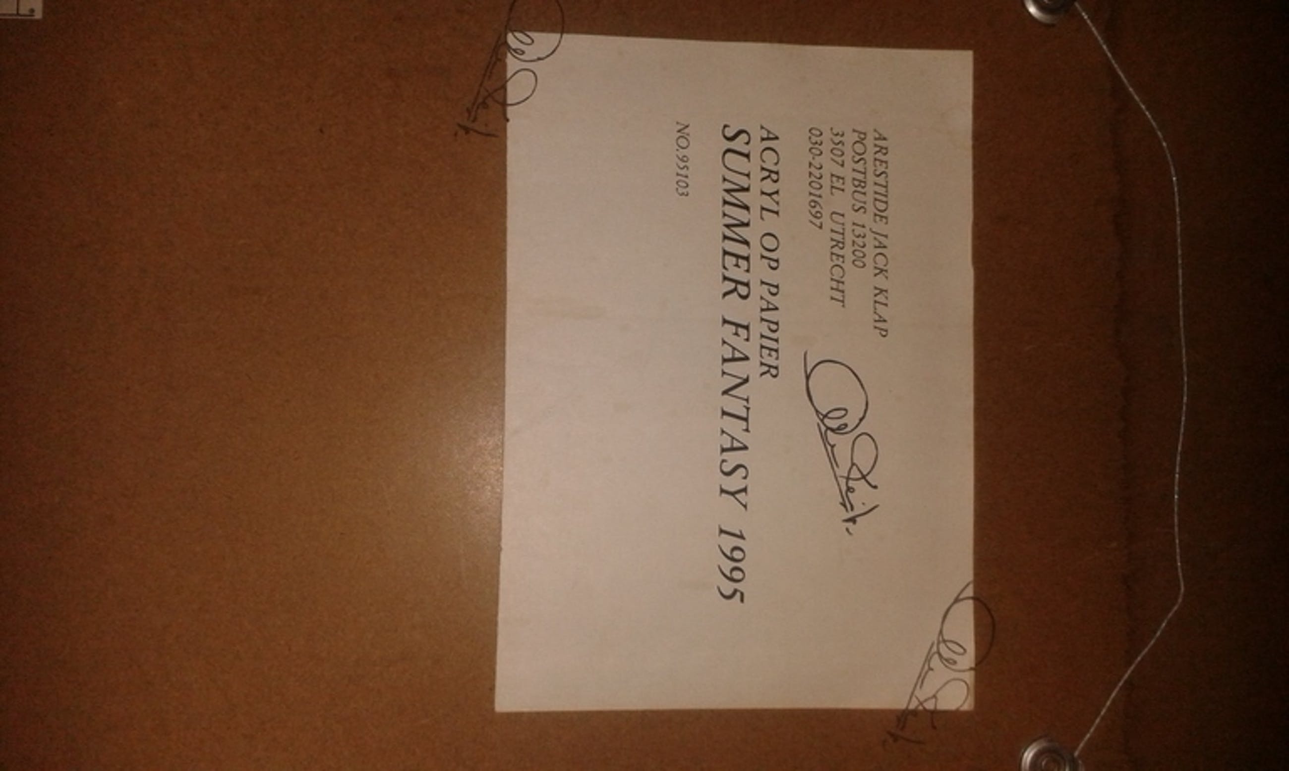 Hier bied ik een mooie schilderij aan : acryl op papier, summer fantasy die in 1995 gemaakt is en die mijn vader vroeger bij kleine kunstwinkel in amsterdam gekocht heeft.