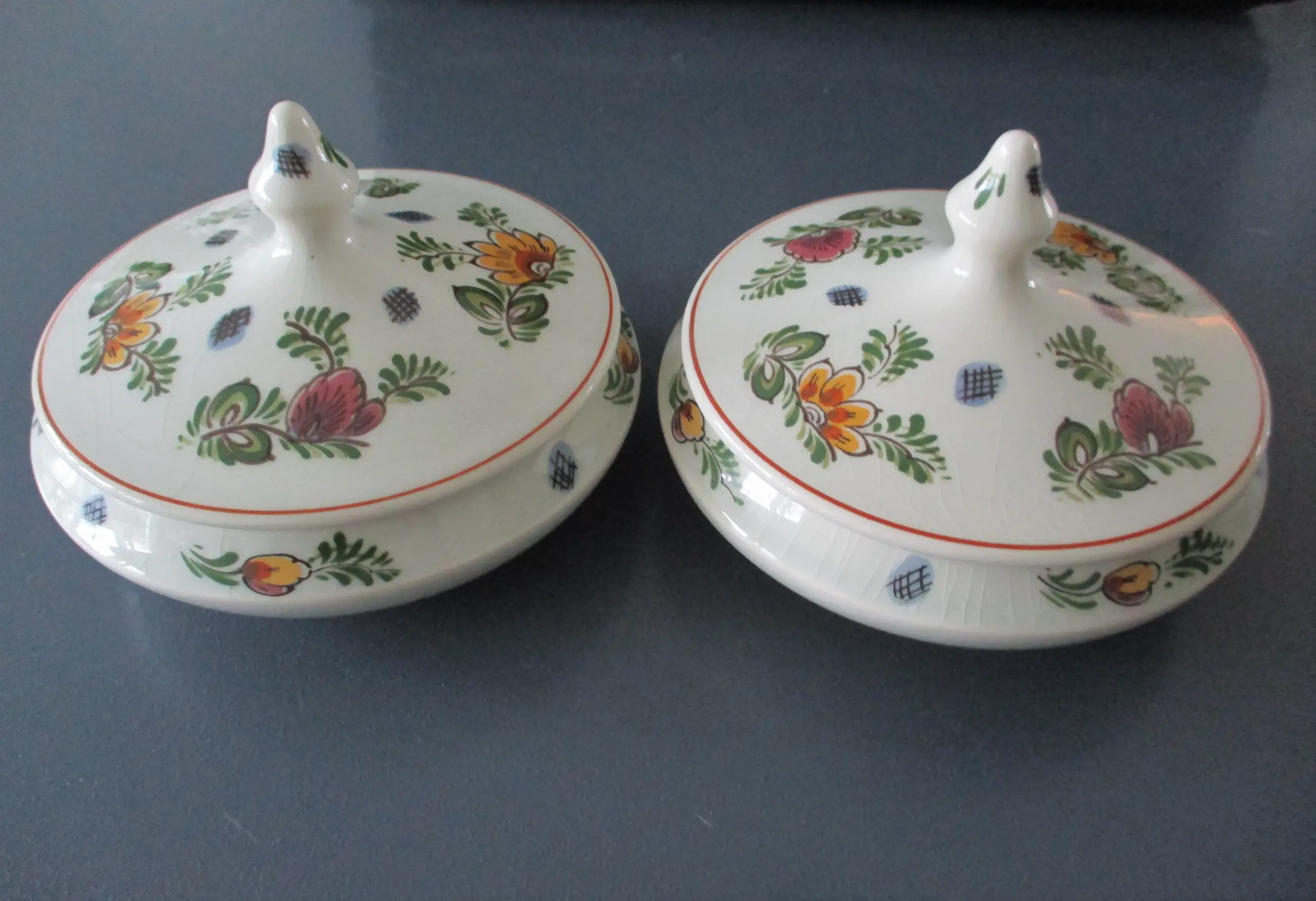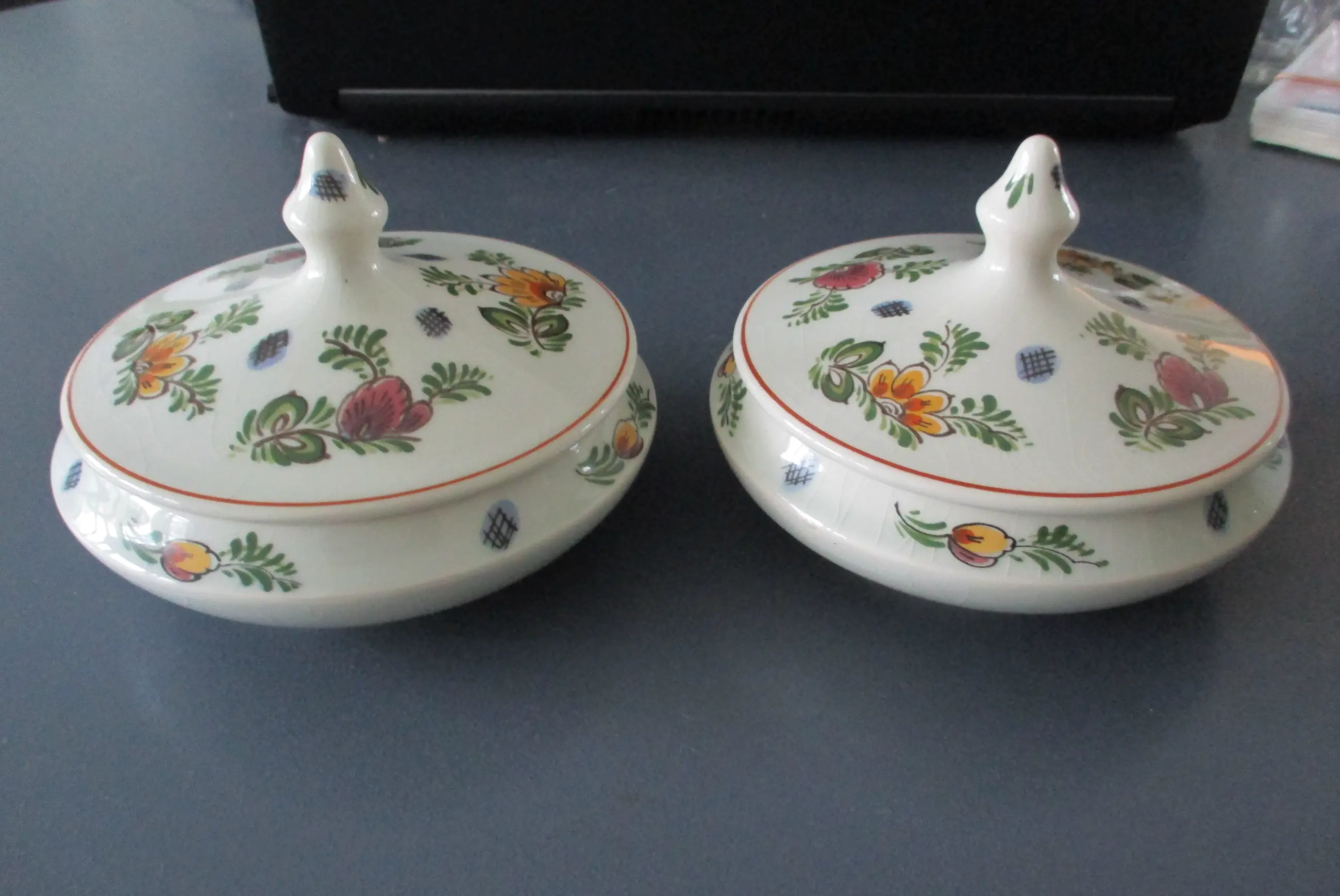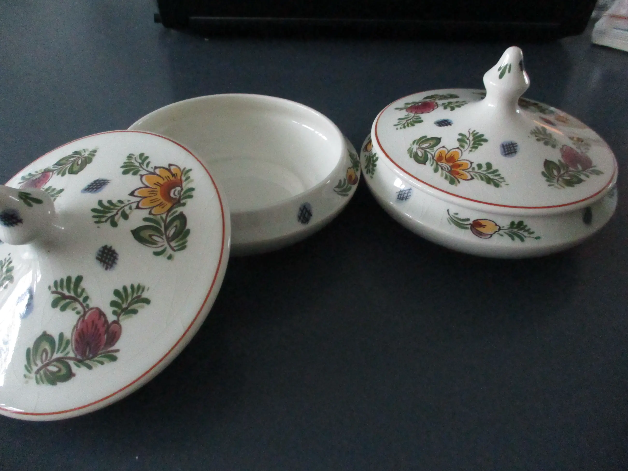 2 stuks antieke bonbonschaaltjes met deksel van Regina Delfts Polychroom. Handpainted Holland. In een heel goede staat.