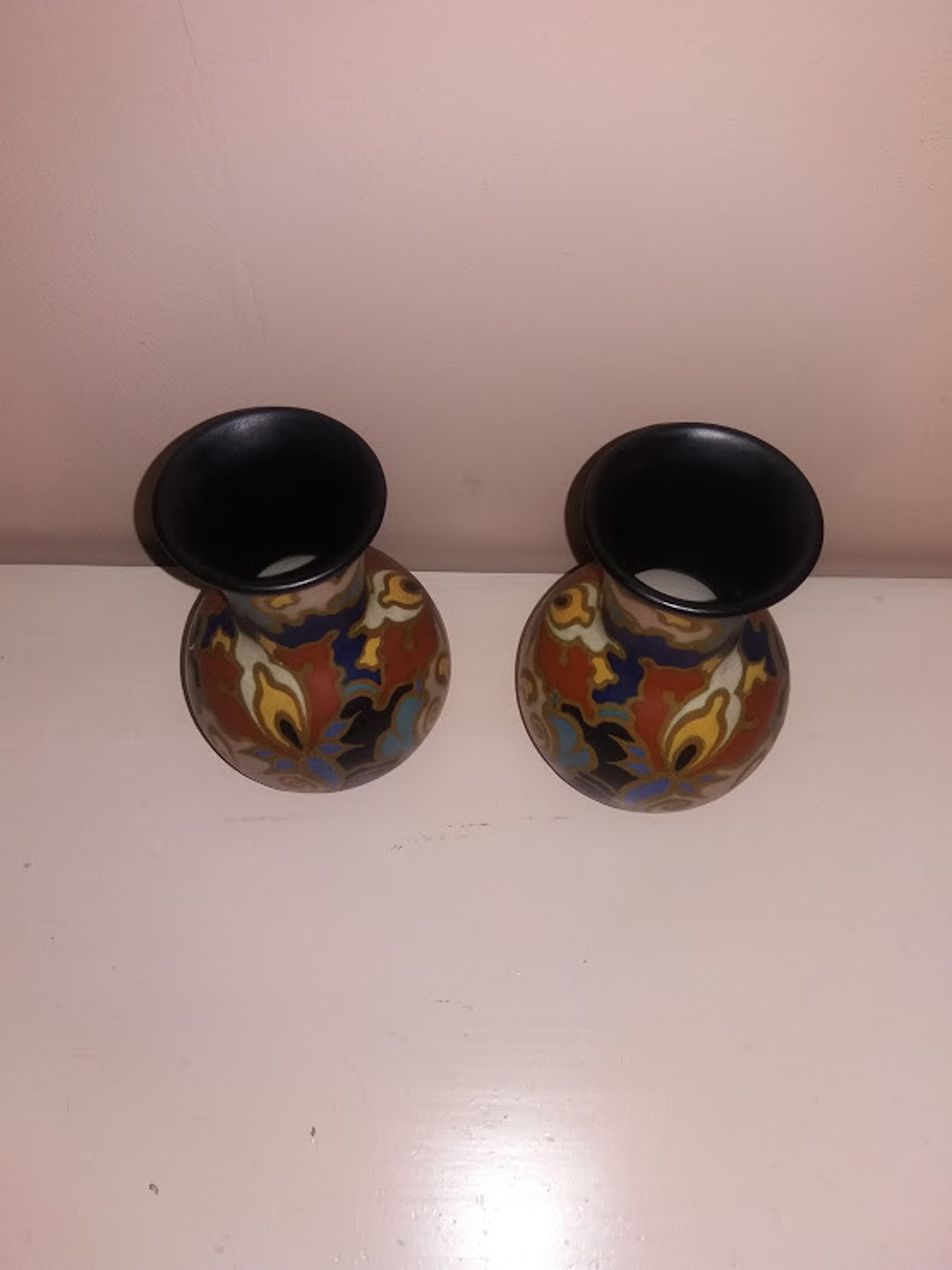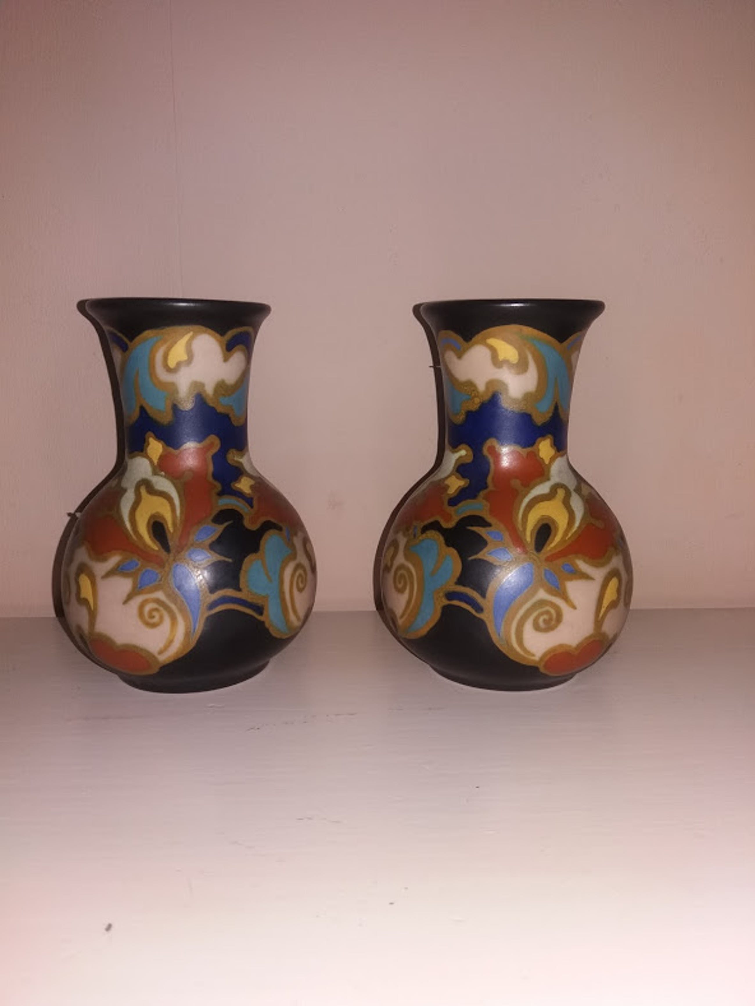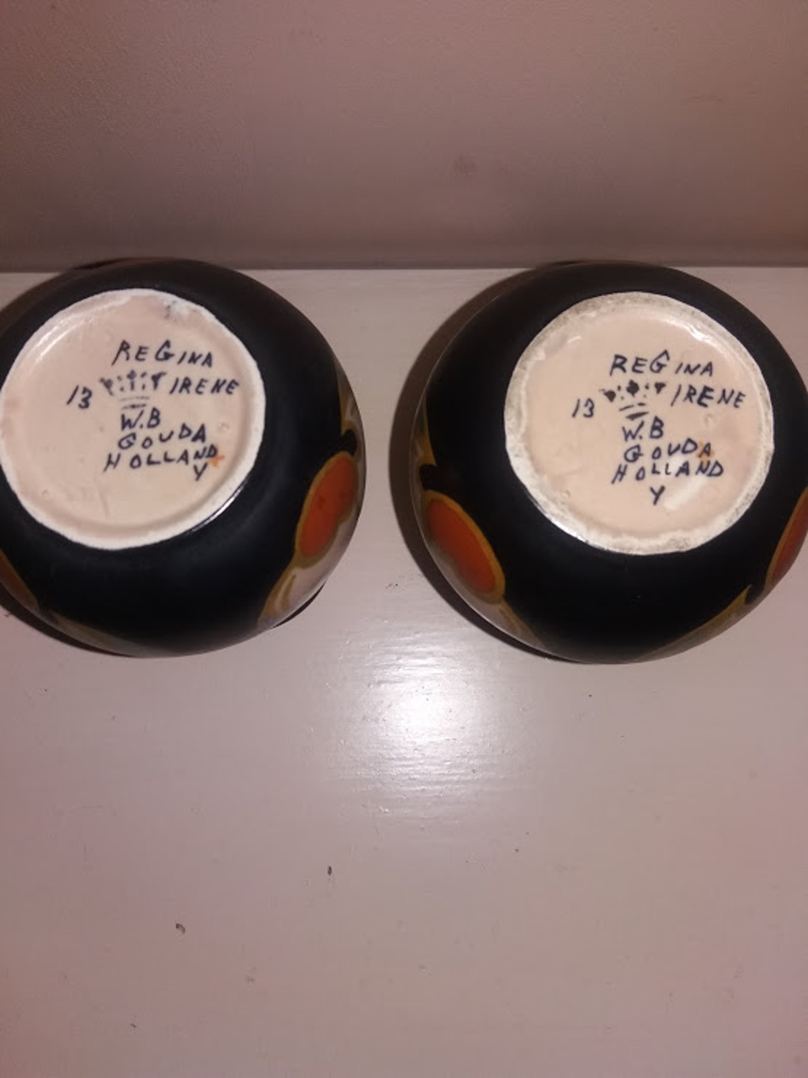 Zeer mooie art deco vaas van mat plateel uit de kunstaardewerkfabriek Regina te Gouda, Holland. Decor Irene (komt zeldzaam voor en zeker gezien in deze staat).