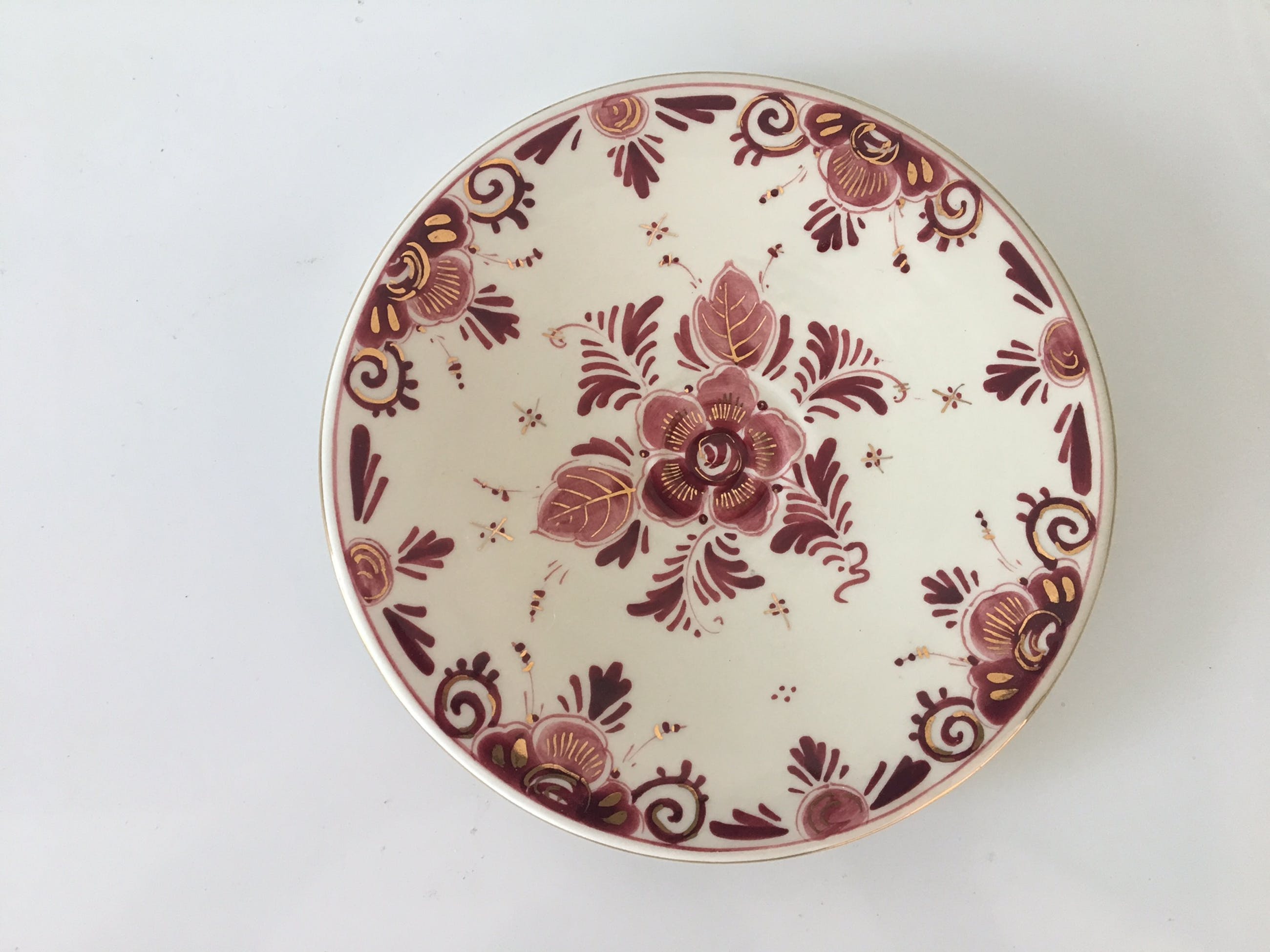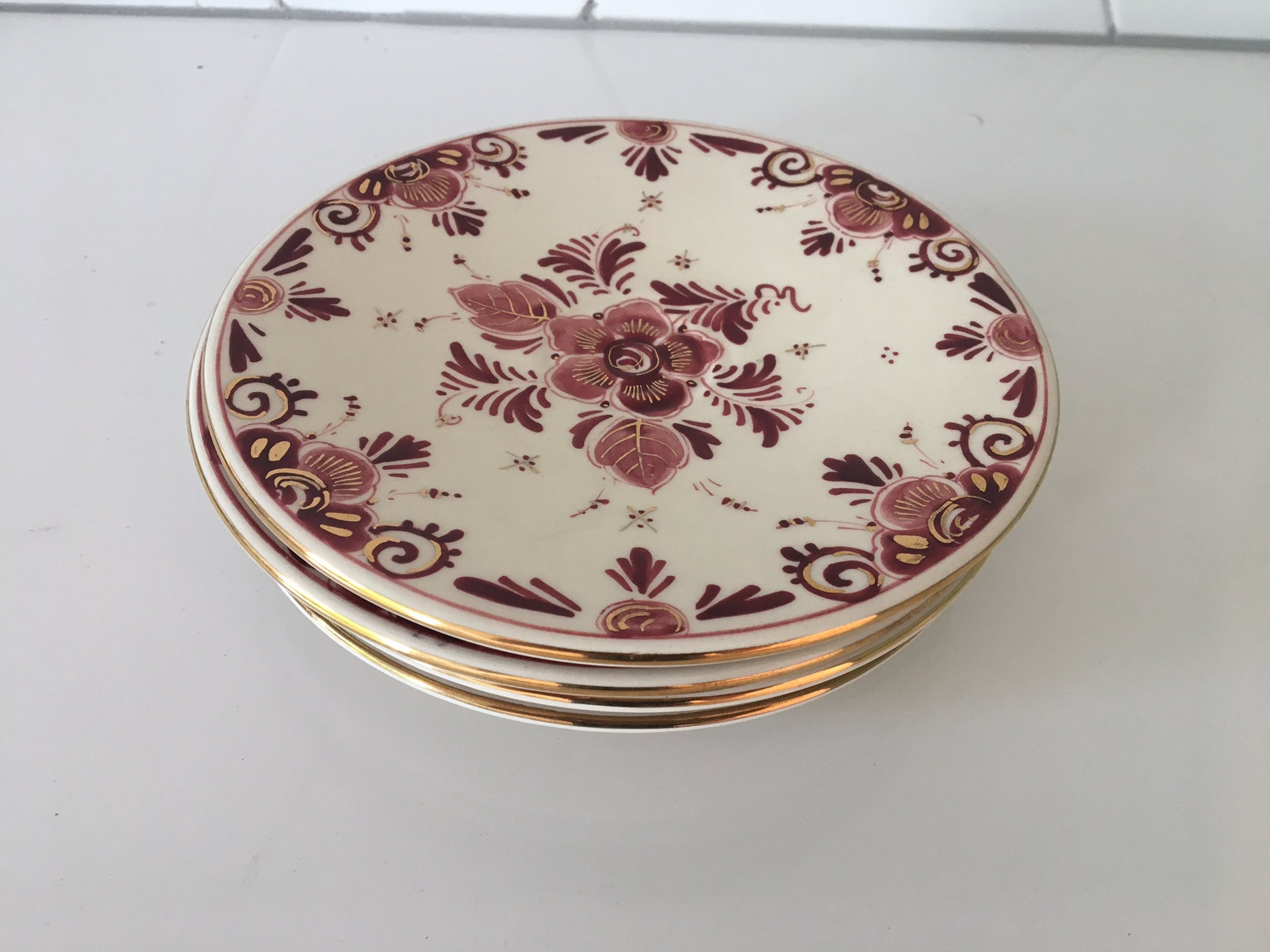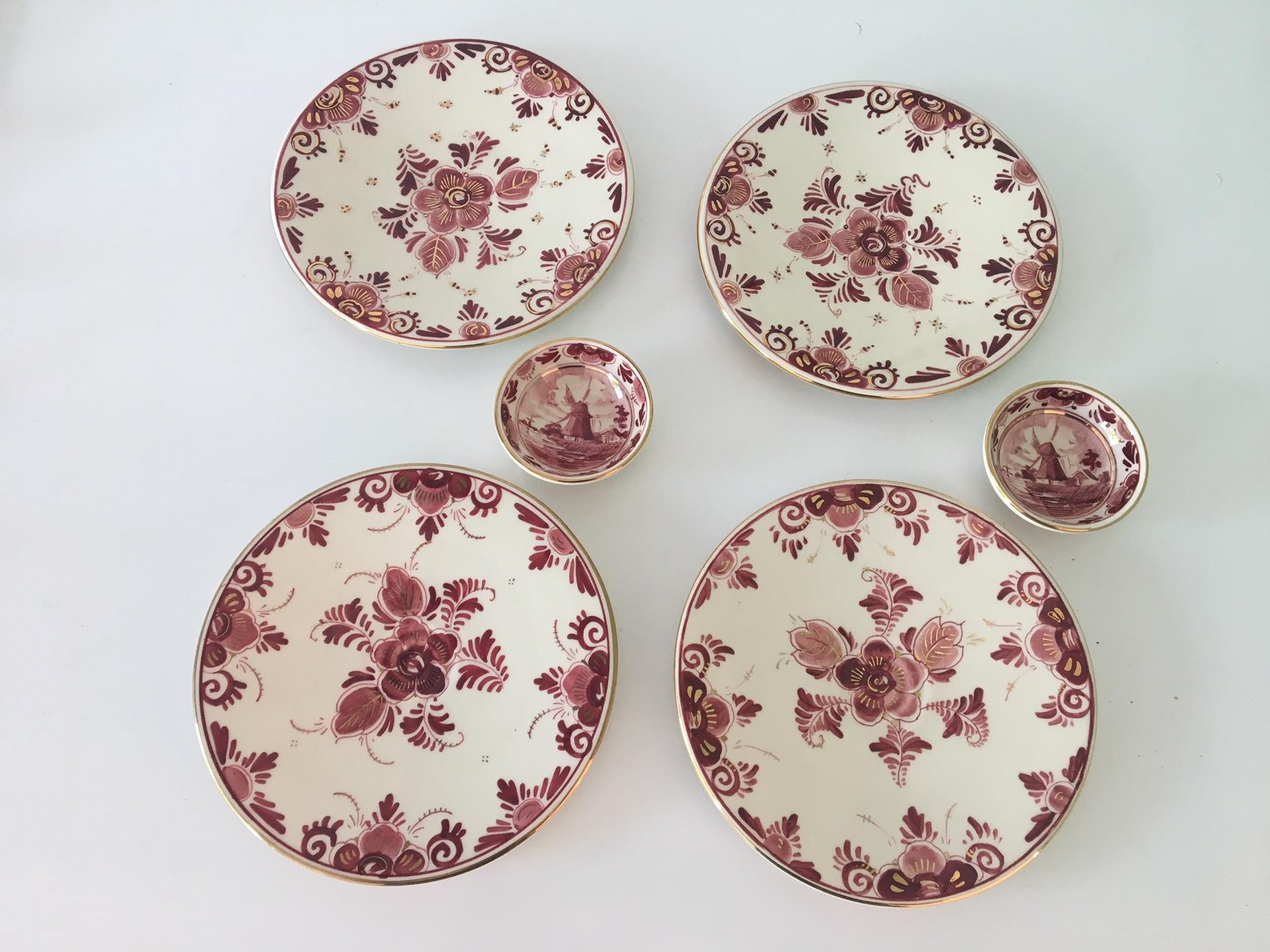 Vier platelen gebaksbordjes en twee pindaschaaltjes Delfts Rood van Regina uit Gouda. Hand beschilderde decoratie en vergulding. In prima onbeschadigde conditie en volledig gemerkt aan de achterzijde.