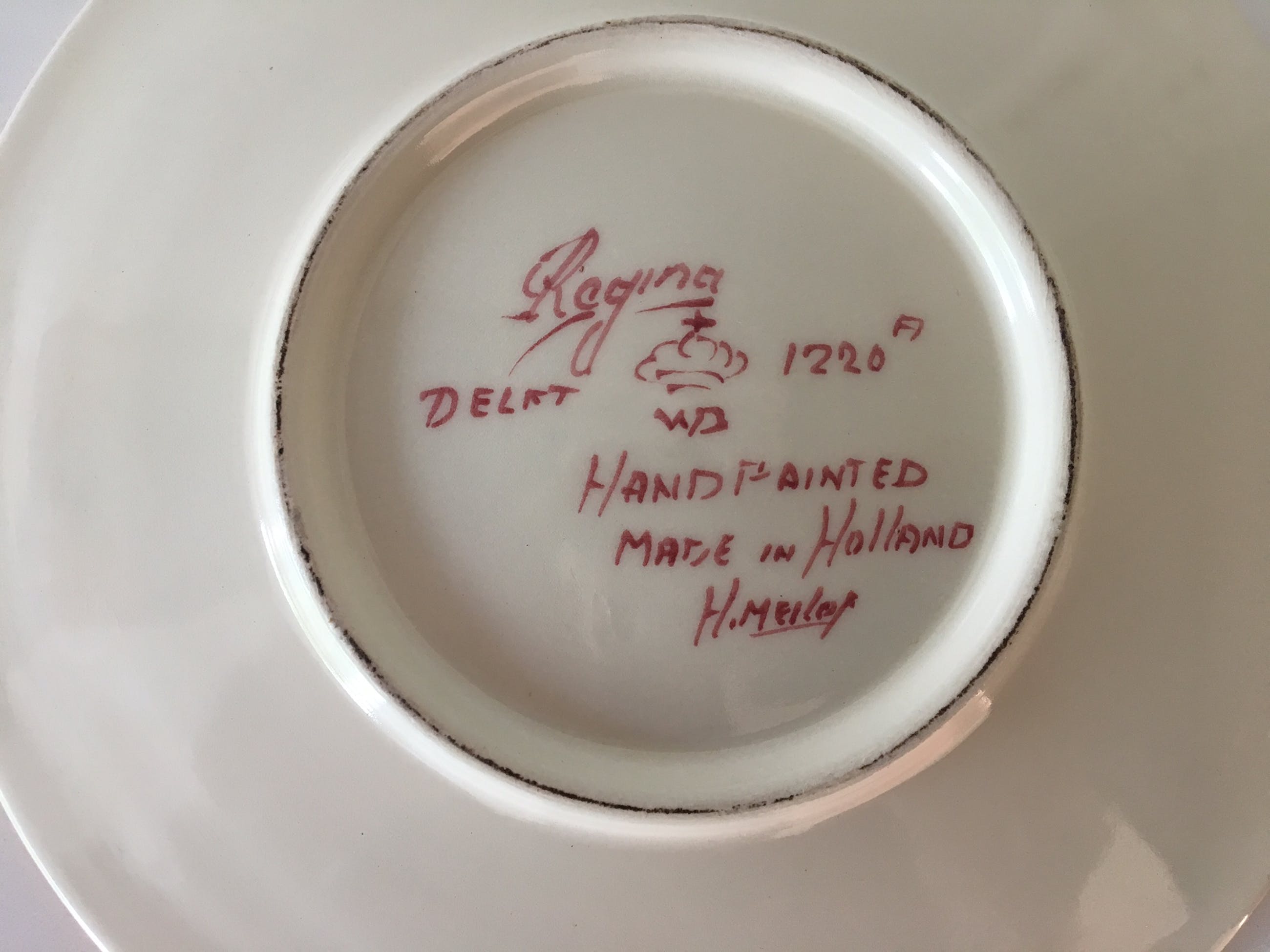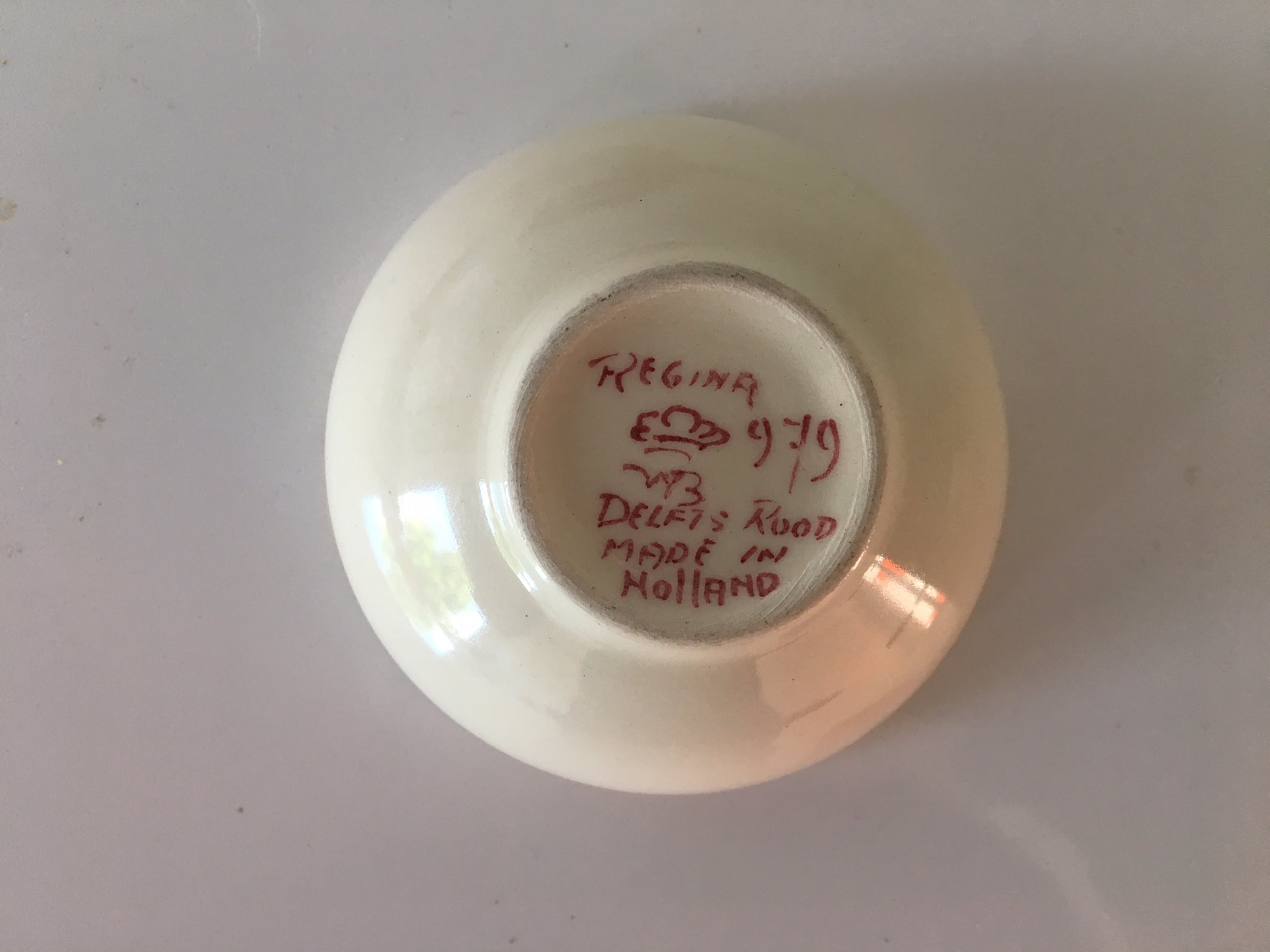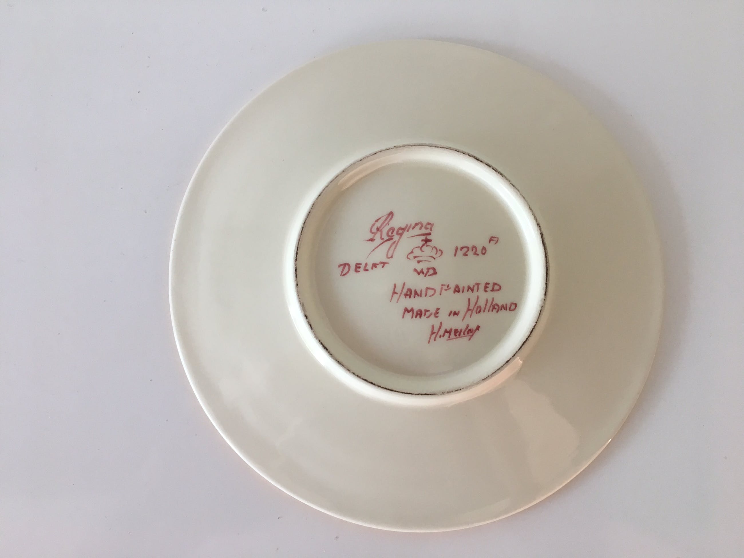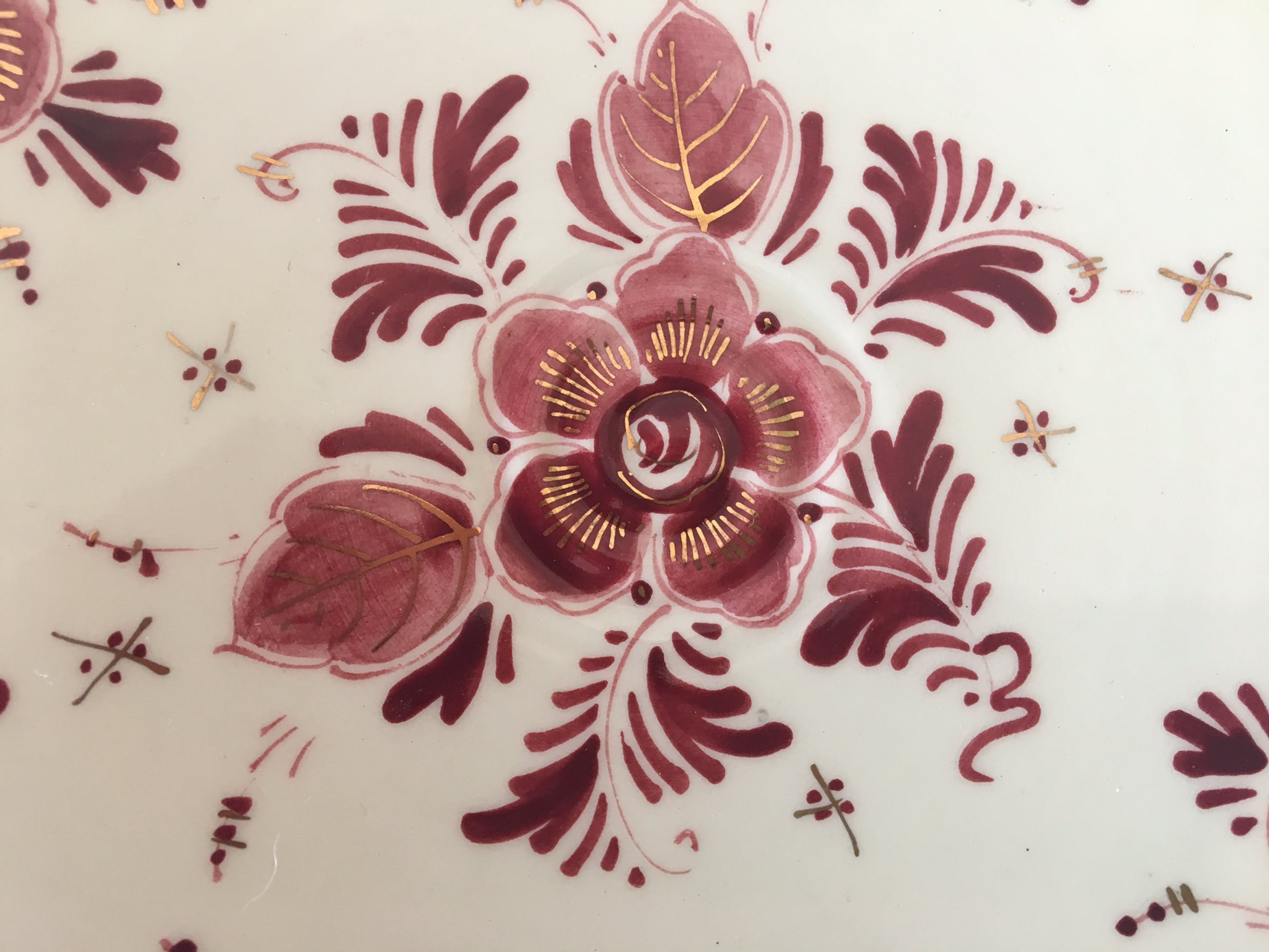 Vier platelen gebaksbordjes en twee pindaschaaltjes Delfts Rood van Regina uit Gouda. Hand beschilderde decoratie en vergulding. In prima onbeschadigde conditie en volledig gemerkt aan de achterzijde.