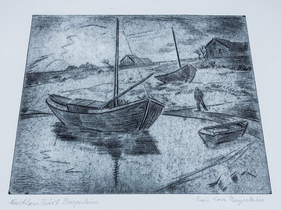 Kurt Beyerlein. o. T. (Schiff im Hafen) Radierung, um 1920-25. Originalradierung auf chamoisfarbenem Bütten; Platte: 24,5 x 29,5 cm; Blatt: 50,0 x 40,0 cm. Mit Bleistift von der Witwe bezeichnet und autorisiert. In sehr gutem Zustand. Porto 6 ? Wir verkaufen einige Radierungen aus dem Nachlass von Kurt Beyerlein / Lore Beyerlein Stockburger.