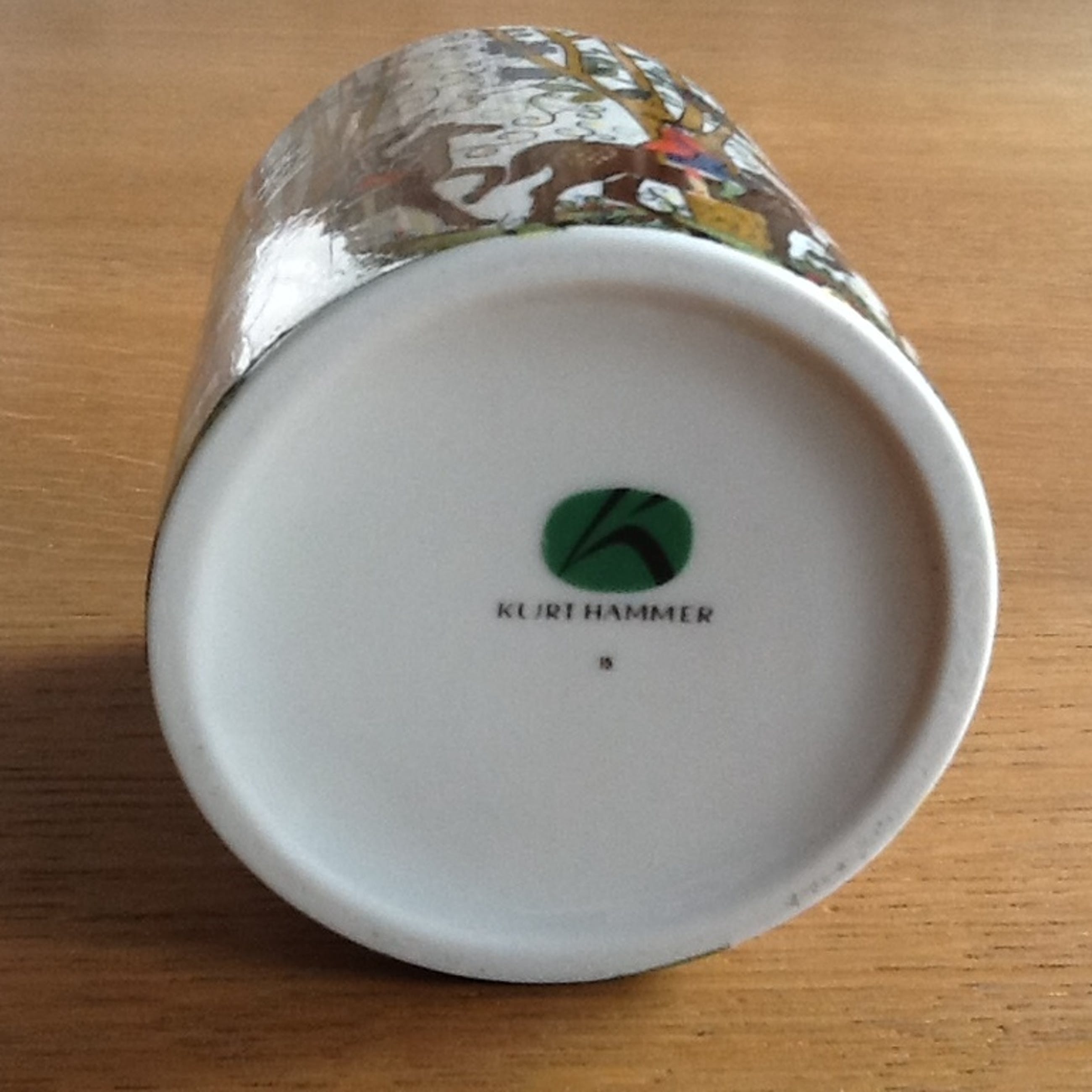 Fraai gedecoreerd mokje met verfijnd motief van bomen, bloemen en ruiters te paard