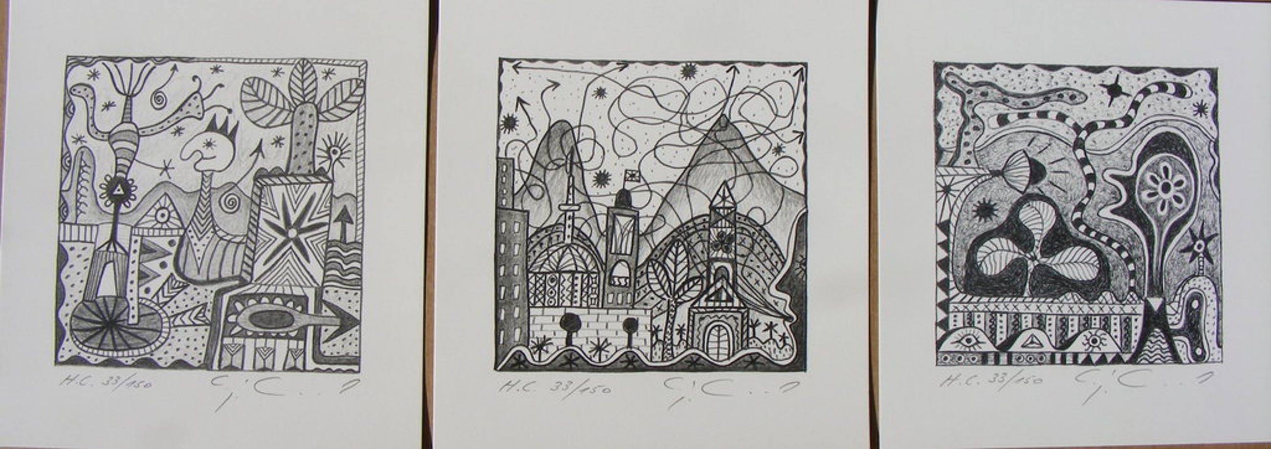 Set van 3 decoratieve grafieken in zwart-wit van de Zwitserse kunstenaar Kurt Josef Haas.