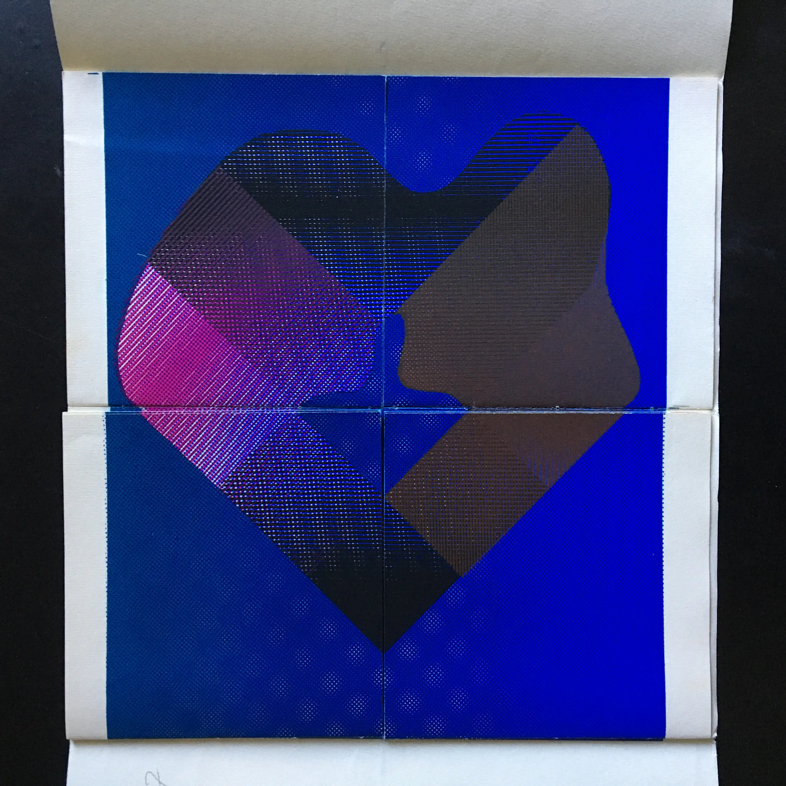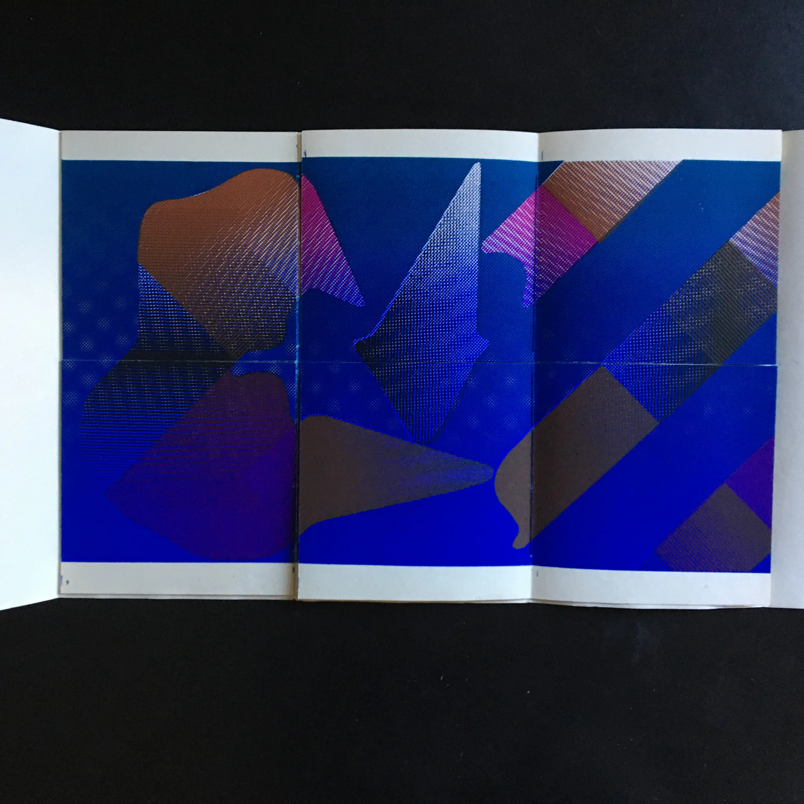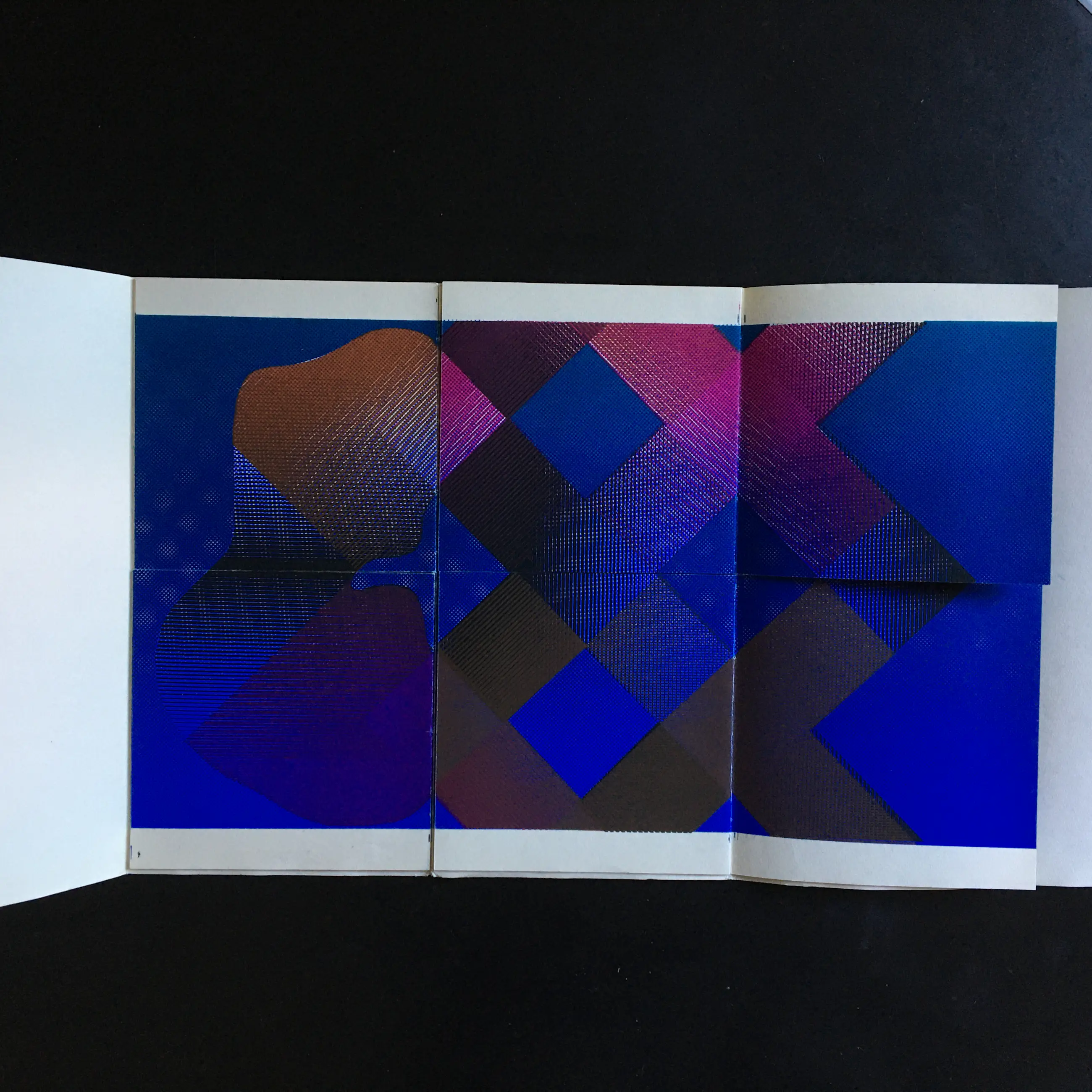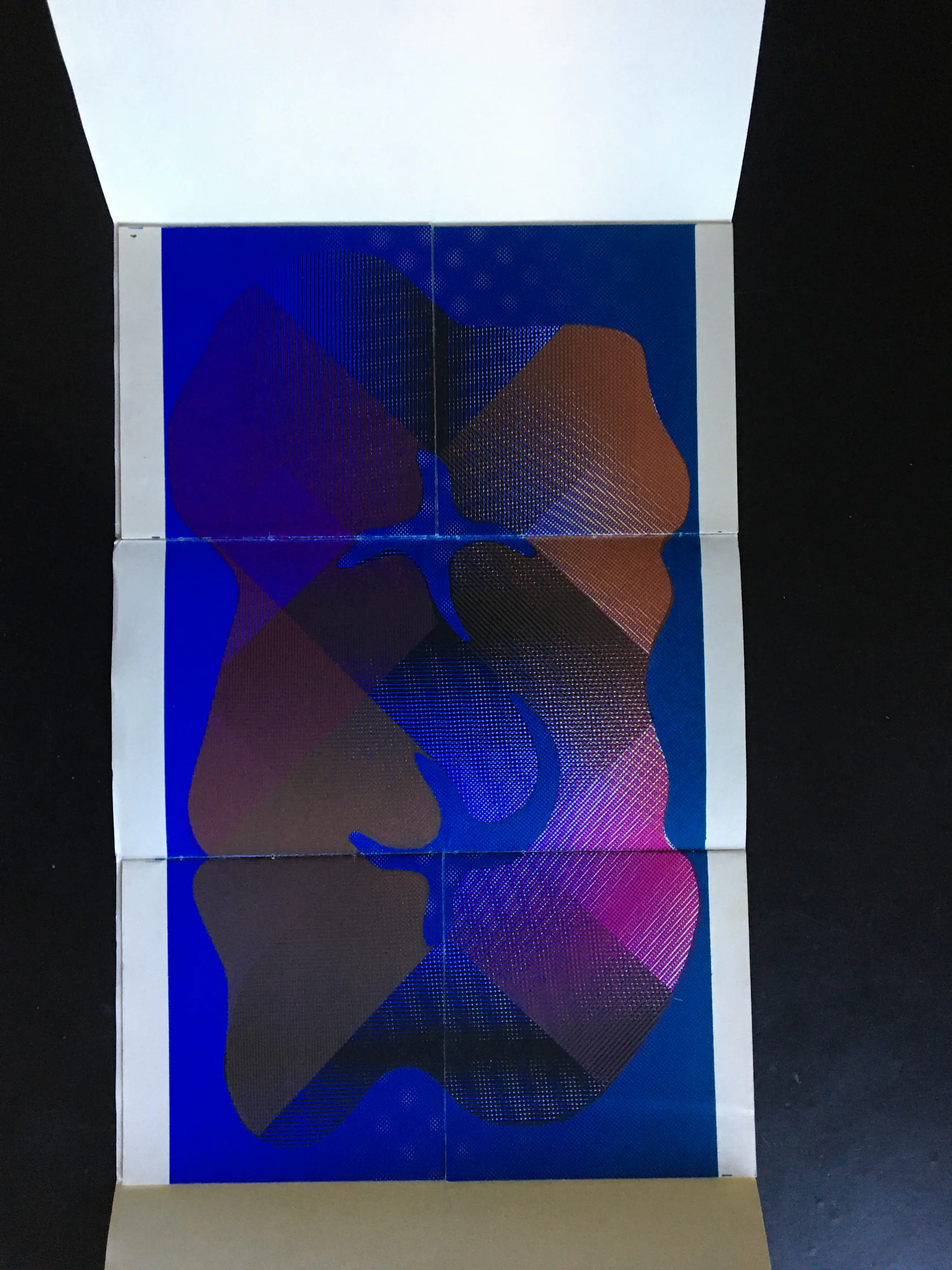 Vier dubbelzijdig bedrukte vellen, elk door een horizontale snede in vier delen verdeeld (16,5 x 17,5 cm); totale afmetingen uitgevouwen: 34 x 52,5 cm. Gebonden in gewoven papier met stofomslag.