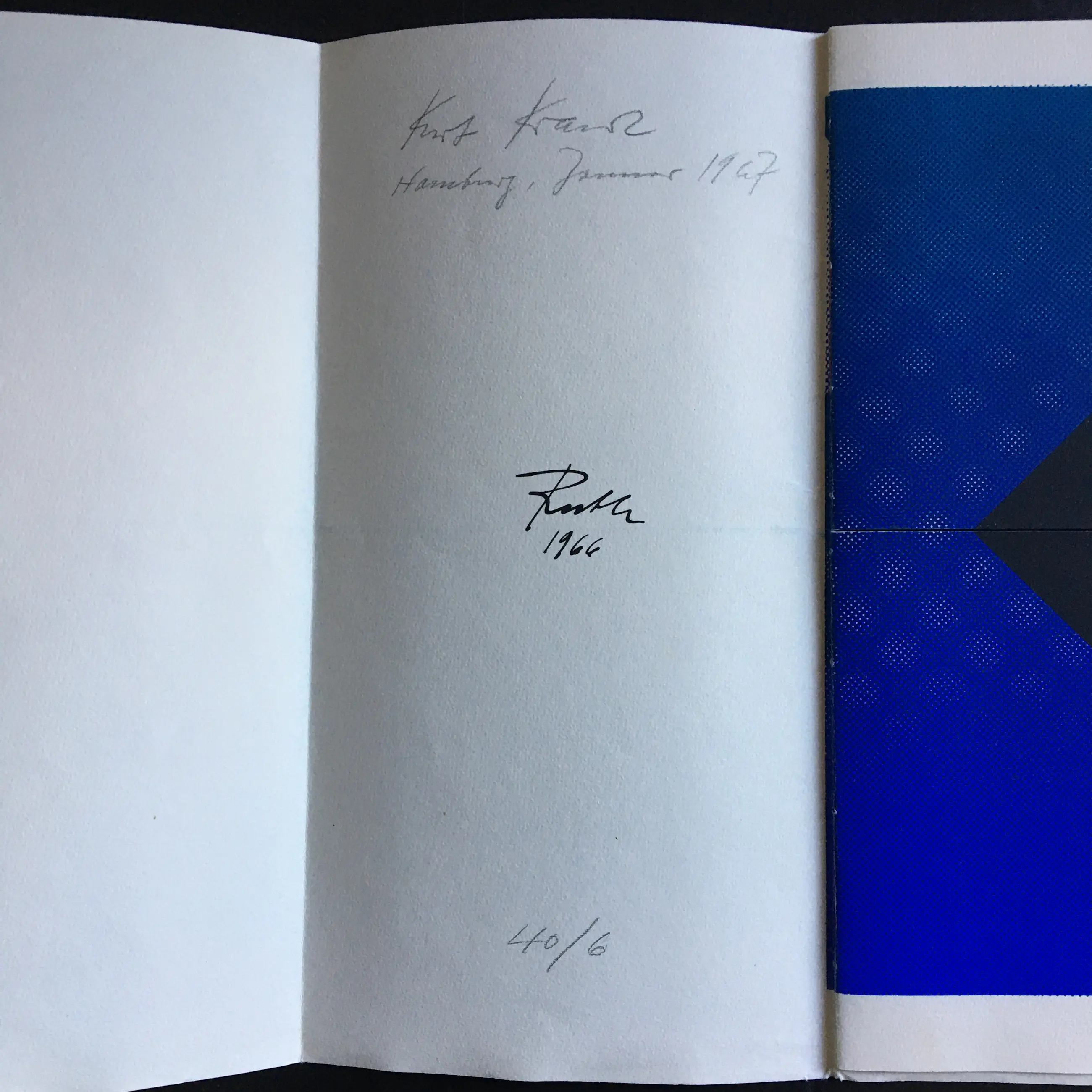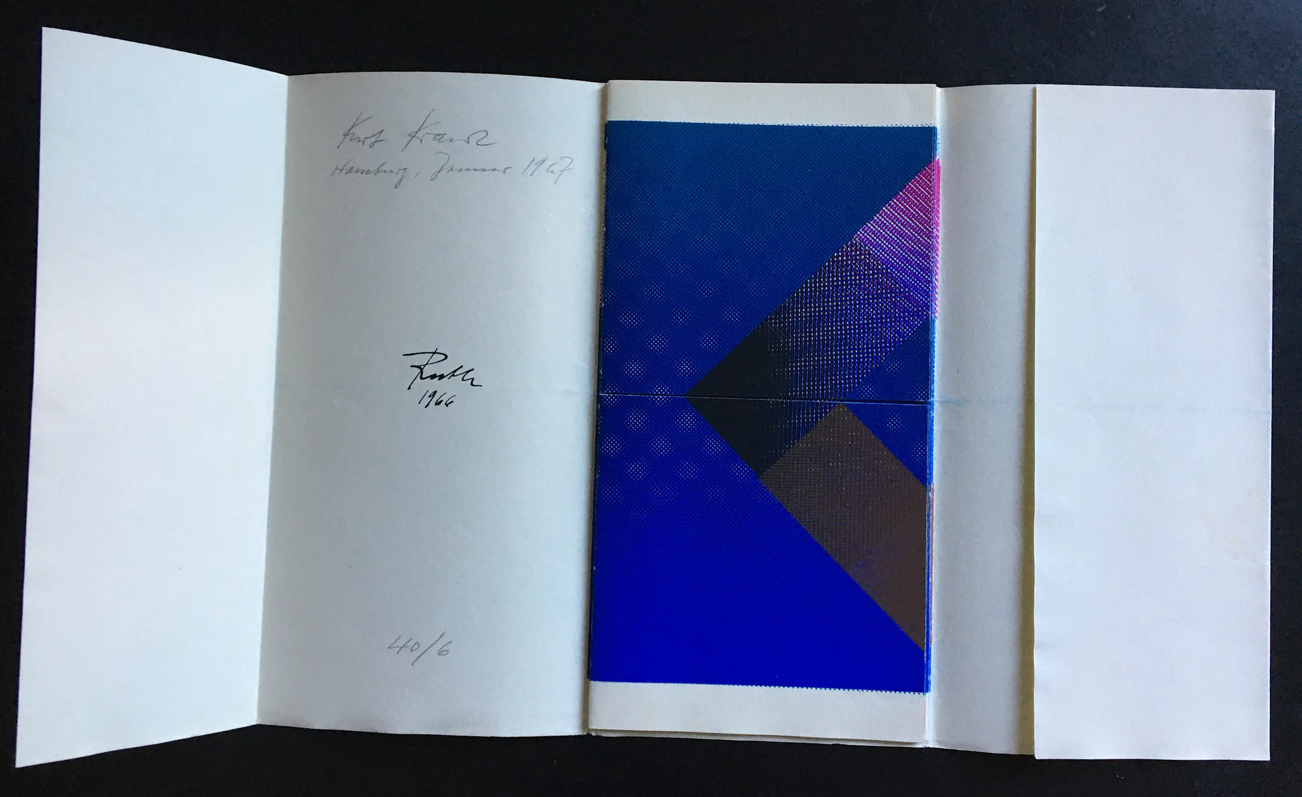 Een kunstenaarsboek in beperkte oplage van de schilder en graficus (1910-1997), die aan het Bauhaus studeerde bij Josef Albers en daar afstudeerde met een diploma. - Getiteld, genummerd, gedateerd en gesigneerd door Kurt Kranz. - De verdeelde pagina's maken talloze combinaties van motieven in verschillende formaten mogelijk.