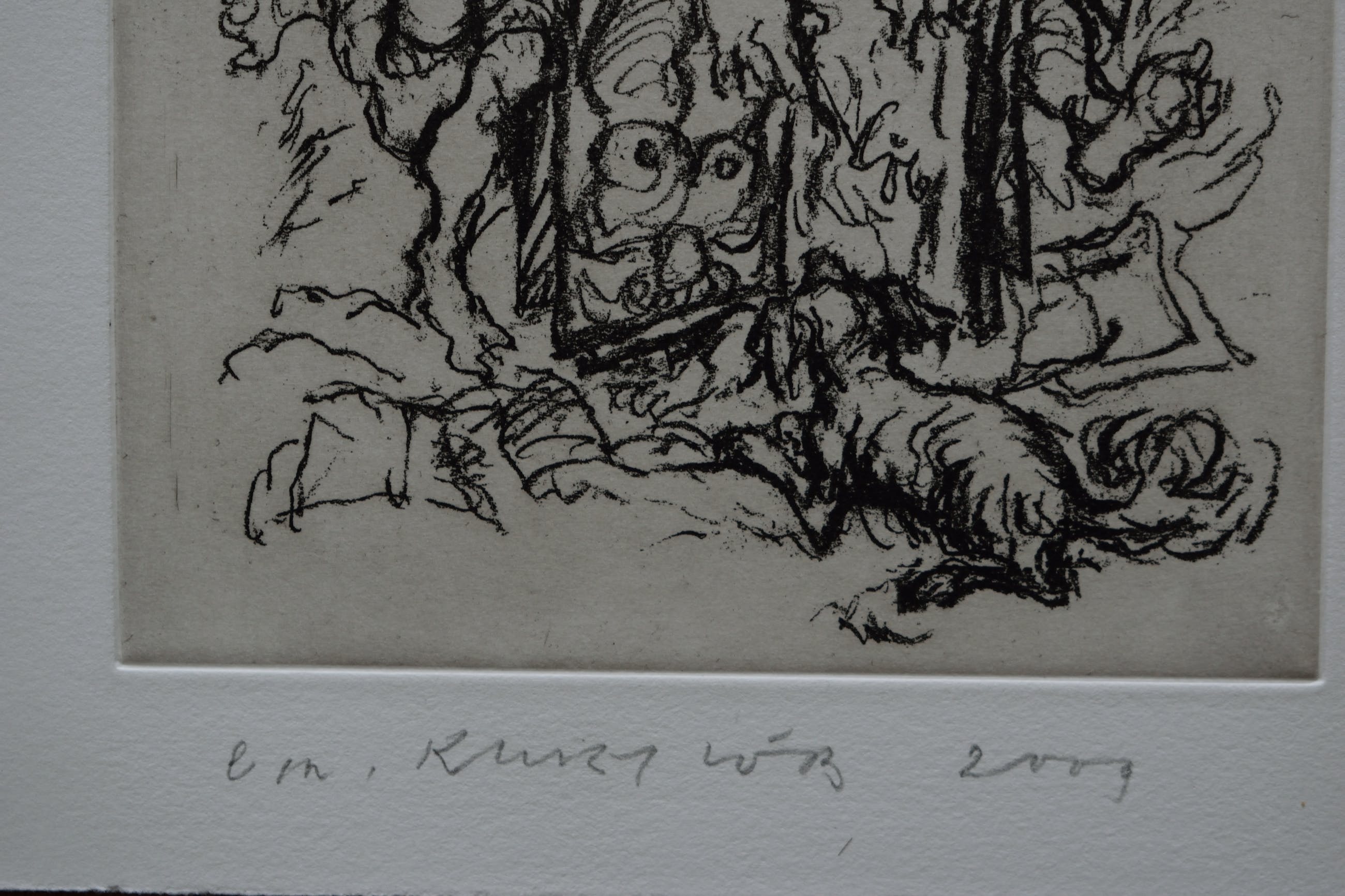 Fraaie ets van Kurt Löb. Let op de details die er in zitten waarschijnlijk van een kunstenaars atelier.Op de voorkant een hondje kijkend naar de tekenaars en het model. Afmeting papier: 27 x 19 cmAfmeting etsplaat: 22 x 15,5 cm Oplage is mij onbekend. Deze is genummerd als een E.A. (Eupreuve d'Artiste) De ets kan prima verzonden worden, maar ophalen mag uiteraard ook.