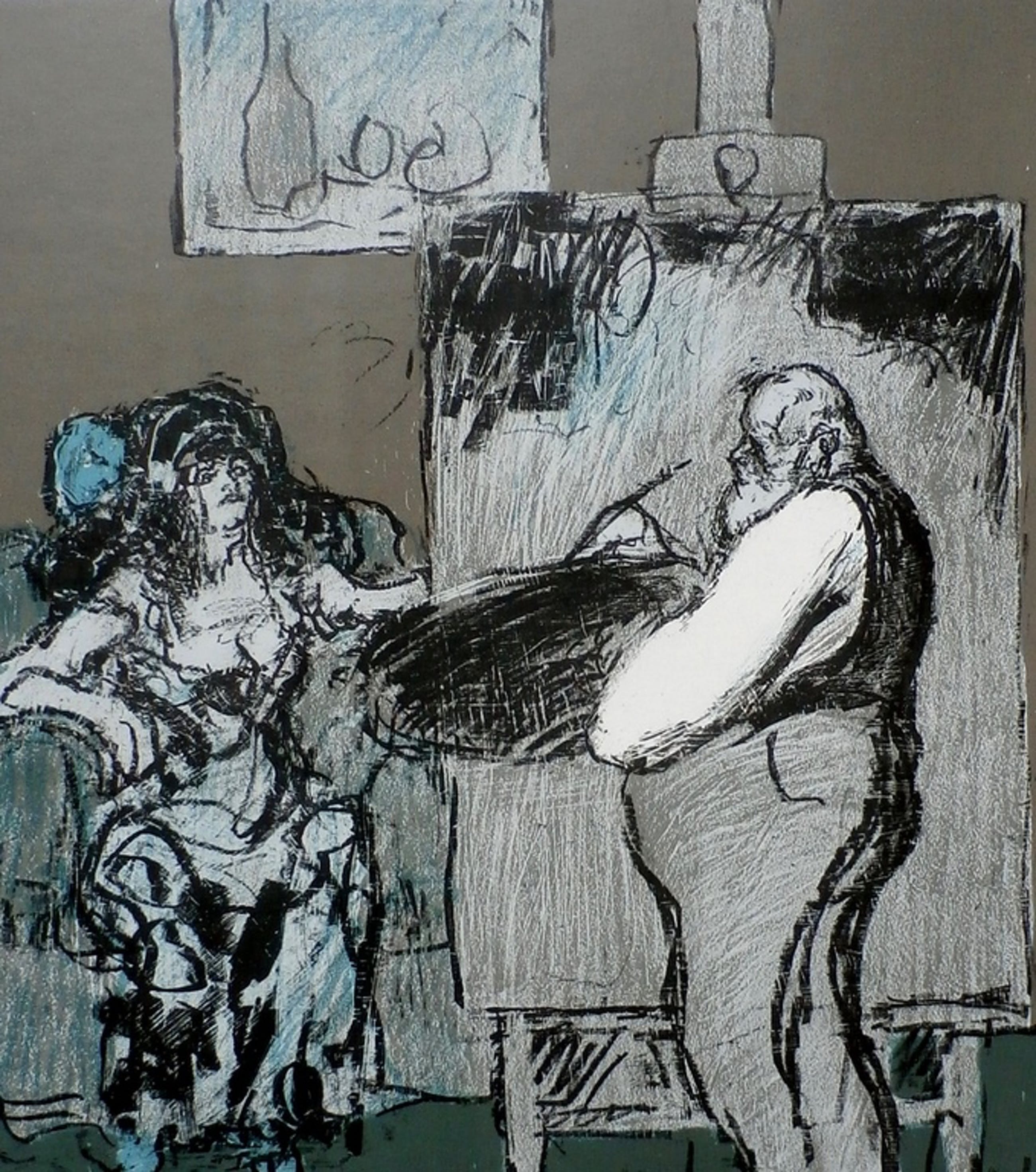 Litho van Kurt Löb uit 1978. Titel: de schilder en zijn model. Dit betreft een zelfportret. Afmetingen blad: 50 x 35 cm. Afmeting voorstelling: H26,5 x b24 cm.