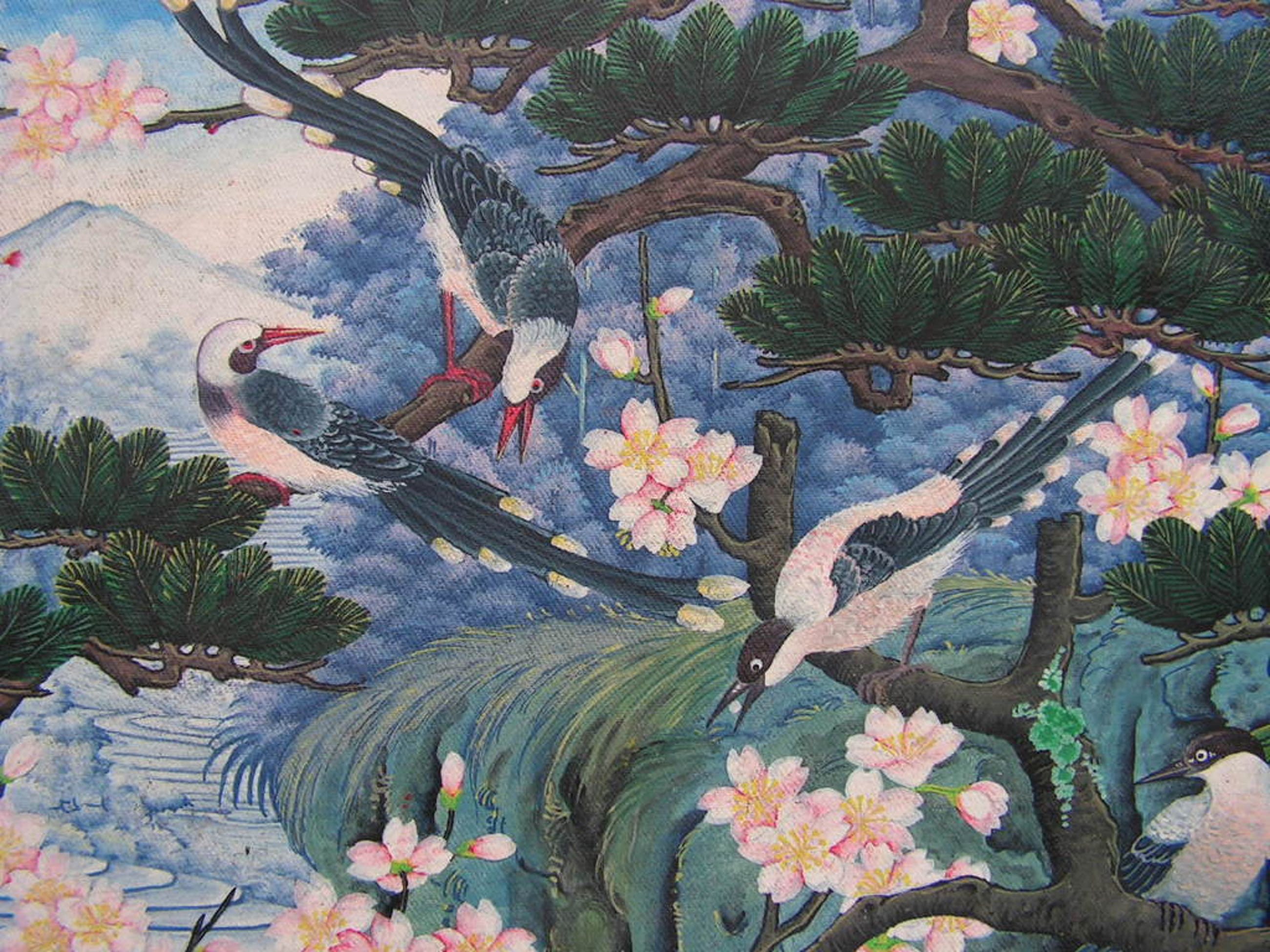 Zeer fijn geschilderd landschap, Indisch, met vogels en op de achtergrond de vulkaan.