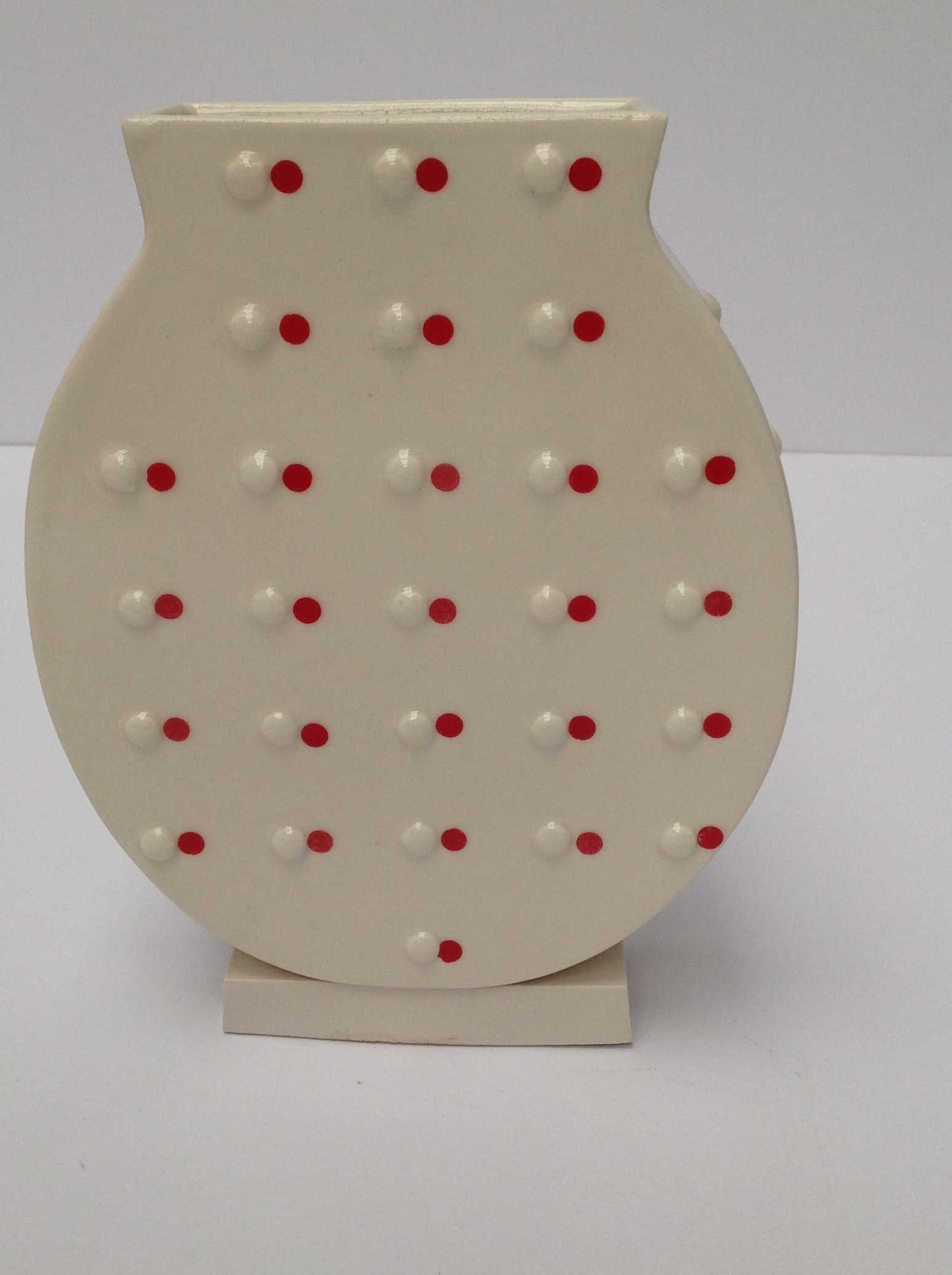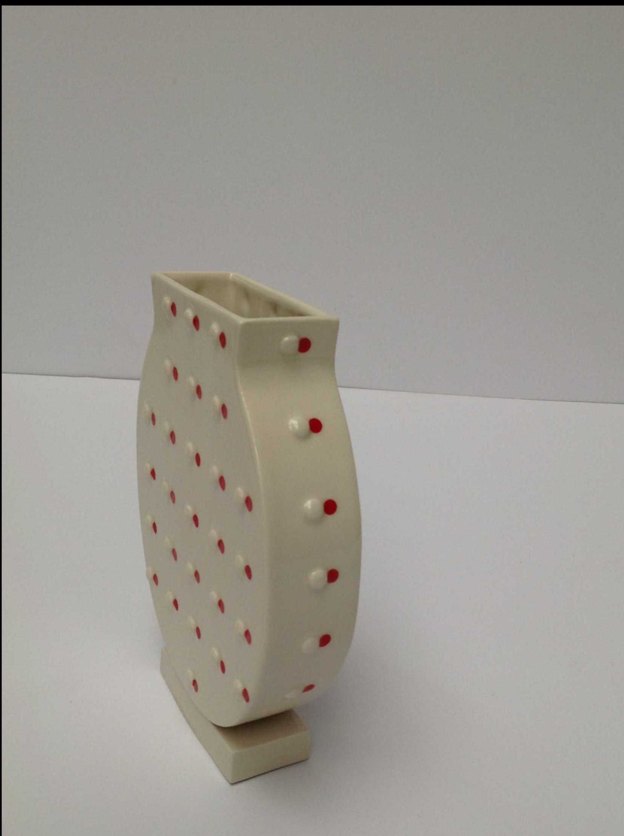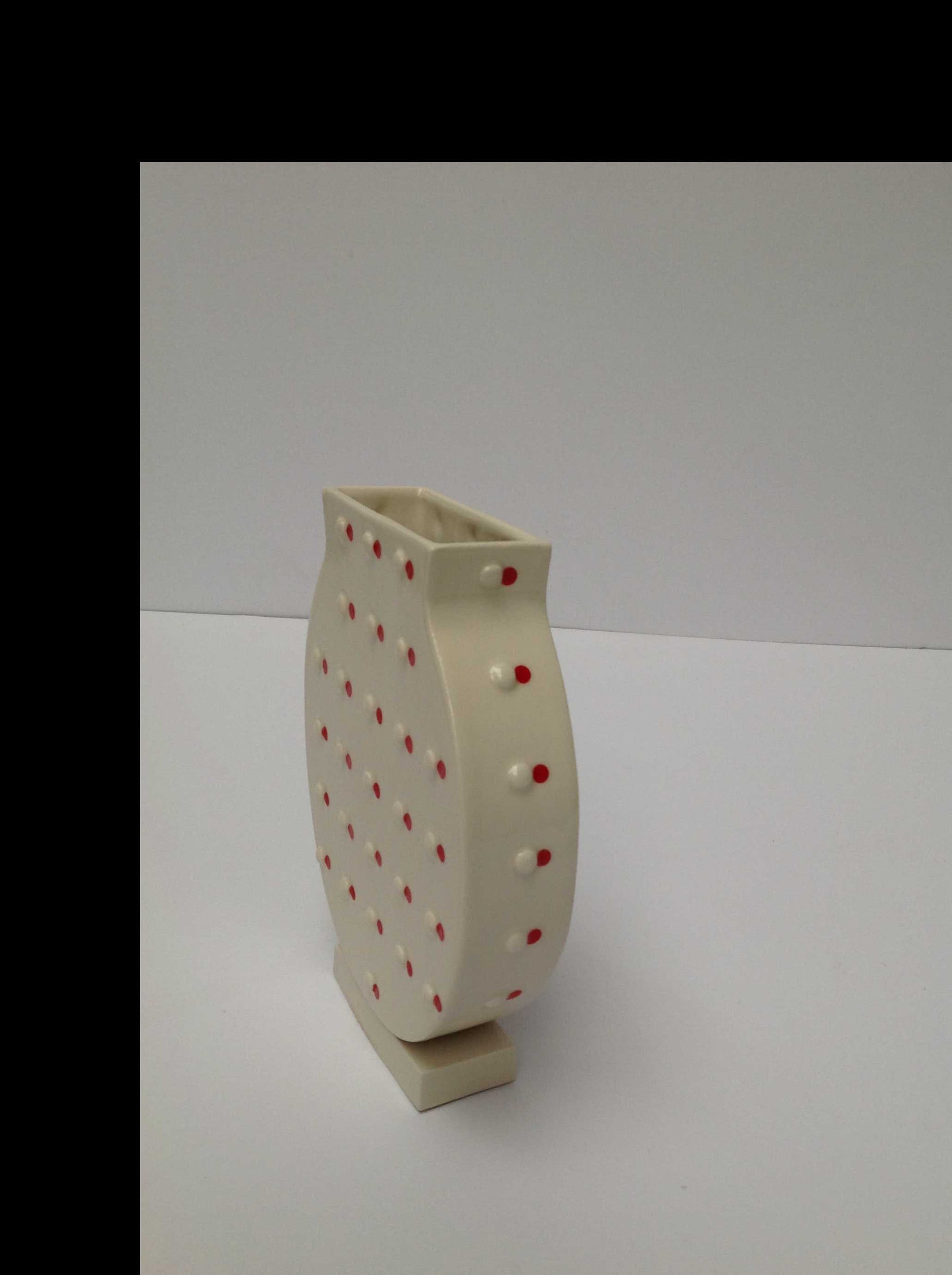 Zeldzaam vaasje/object van de Japanse kunstenaar Kyoko Intatome. (1973) Zij woont en werkt in Amsterdam. Nadere informatie op www.kyokoinatome.com De vaas is gemaakt van steengoed. Kleur gebroken wit met rode stippen.