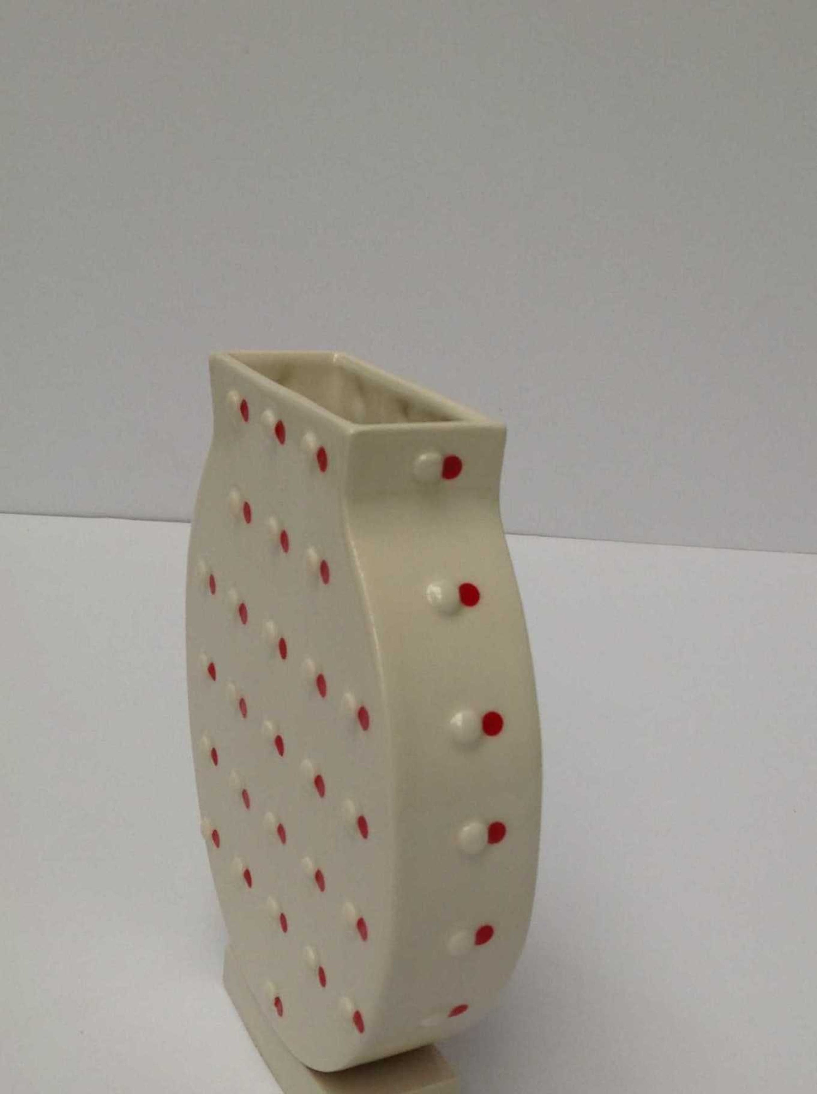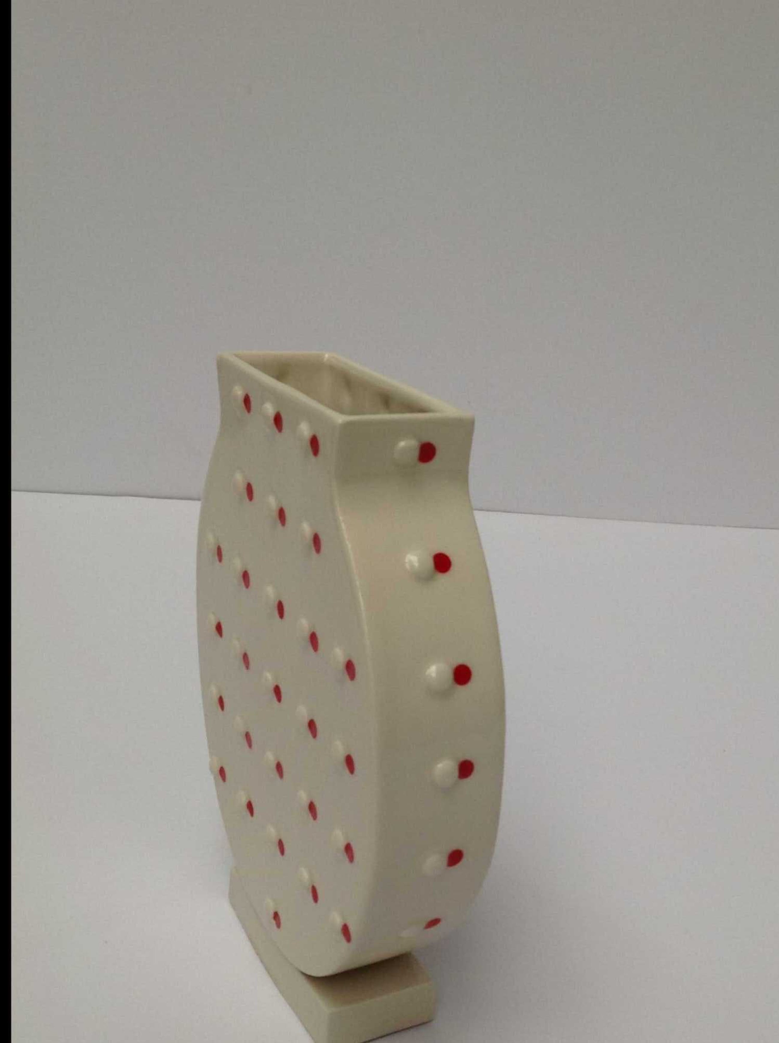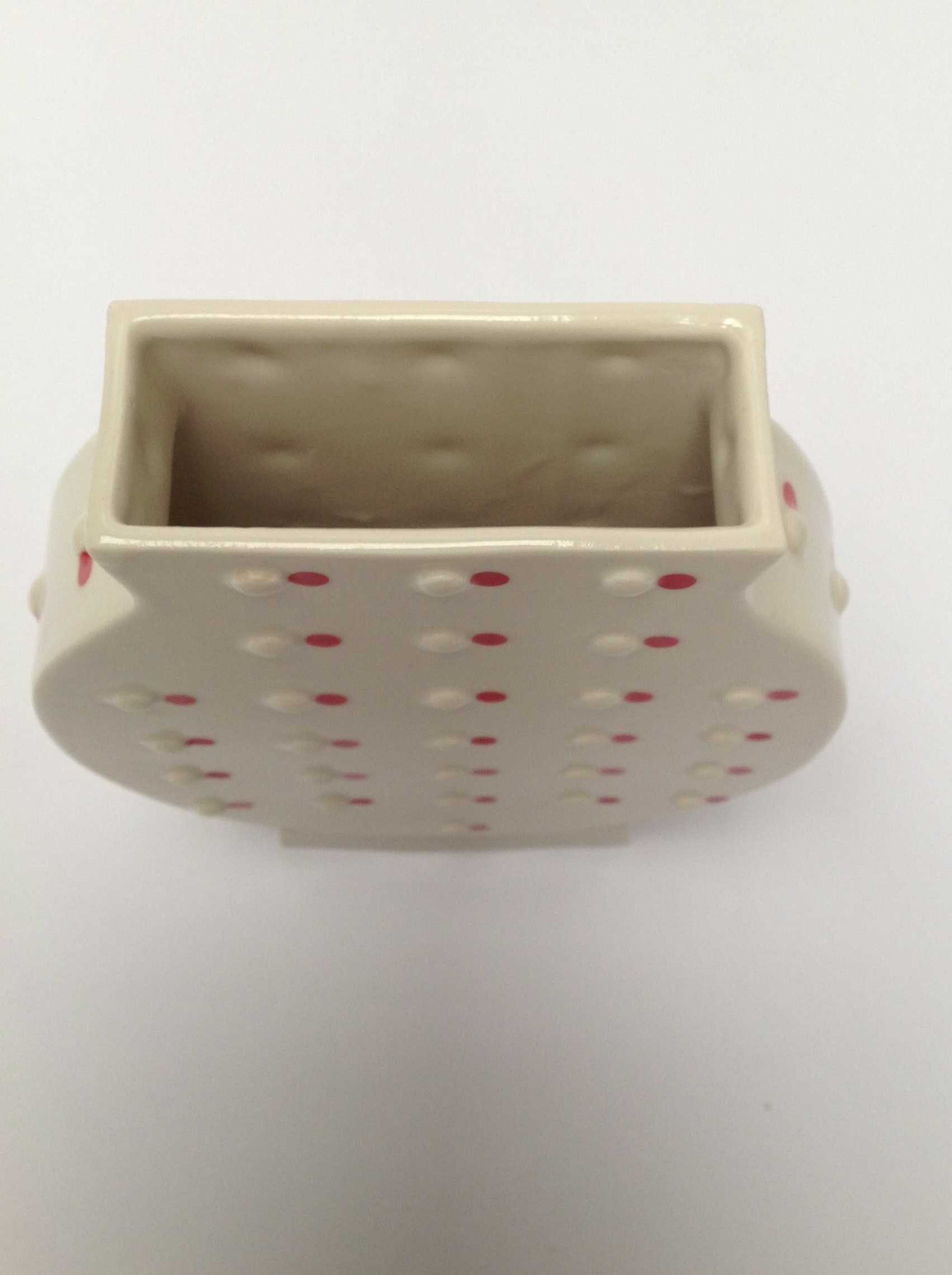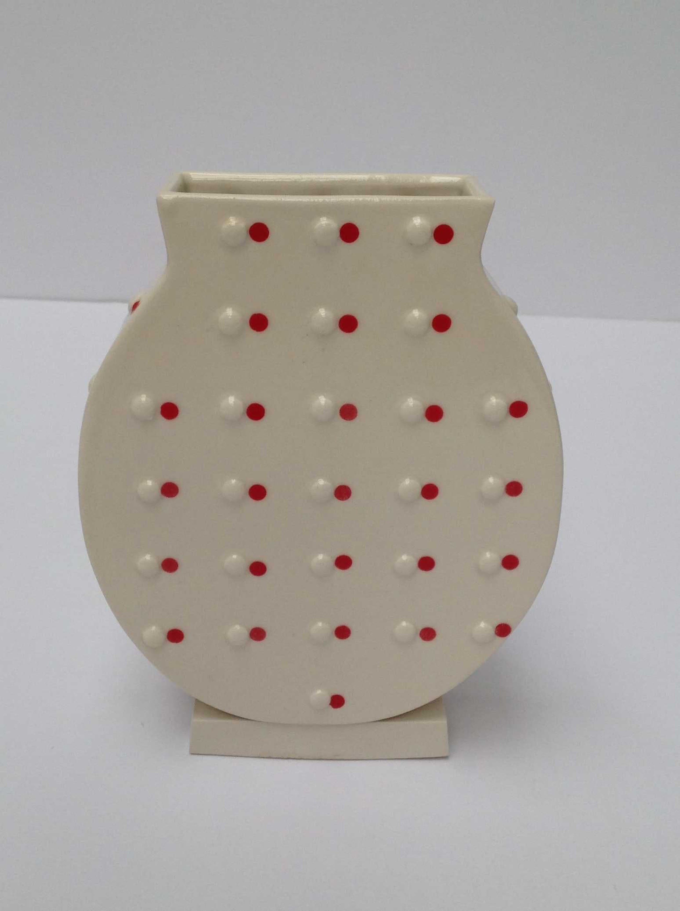 Zeldzaam vaasje/object van de Japanse kunstenaar Kyoko Intatome. (1973) Zij woont en werkt in Amsterdam. Nadere informatie op www.kyokoinatome.com De vaas is gemaakt van steengoed. Kleur gebroken wit met rode stippen.